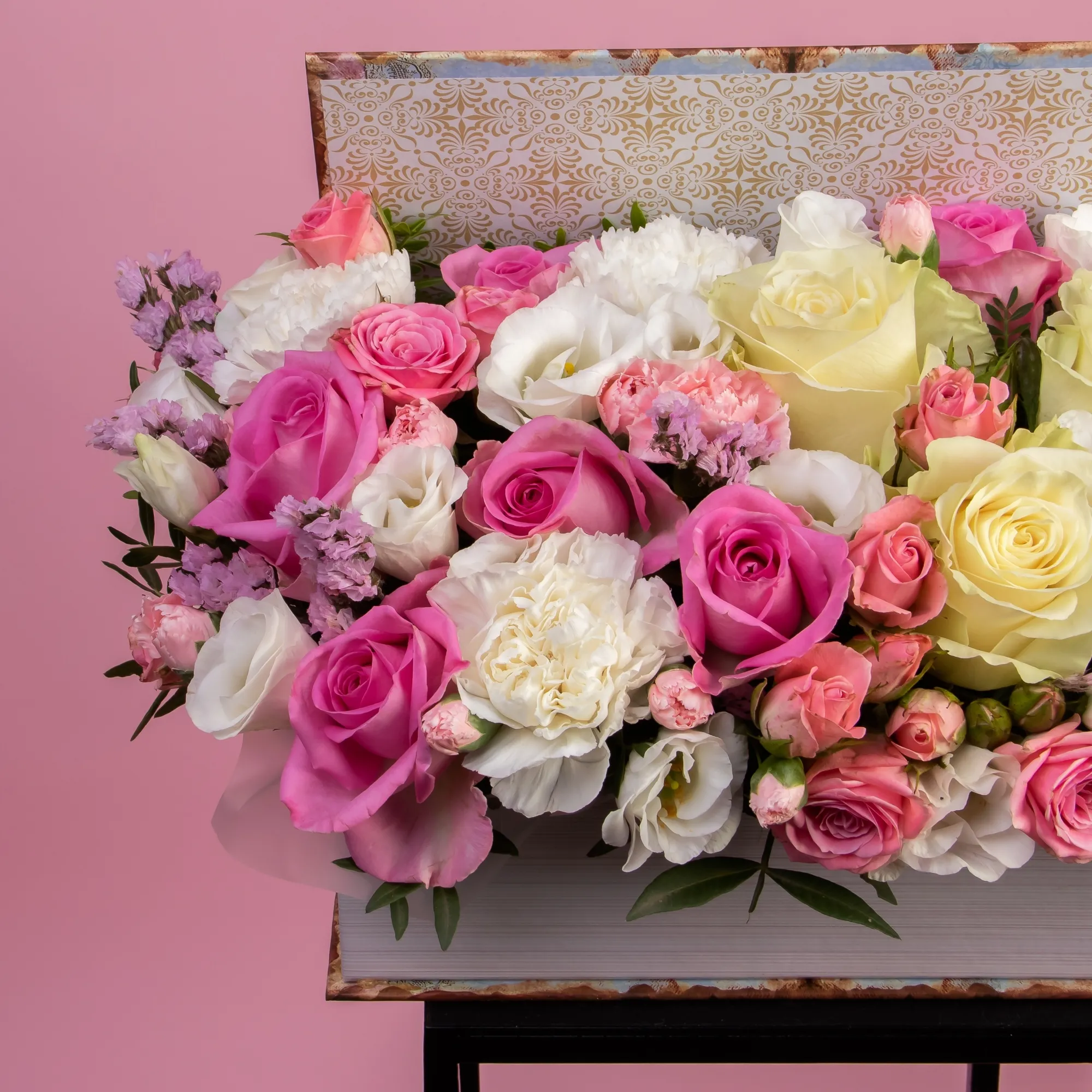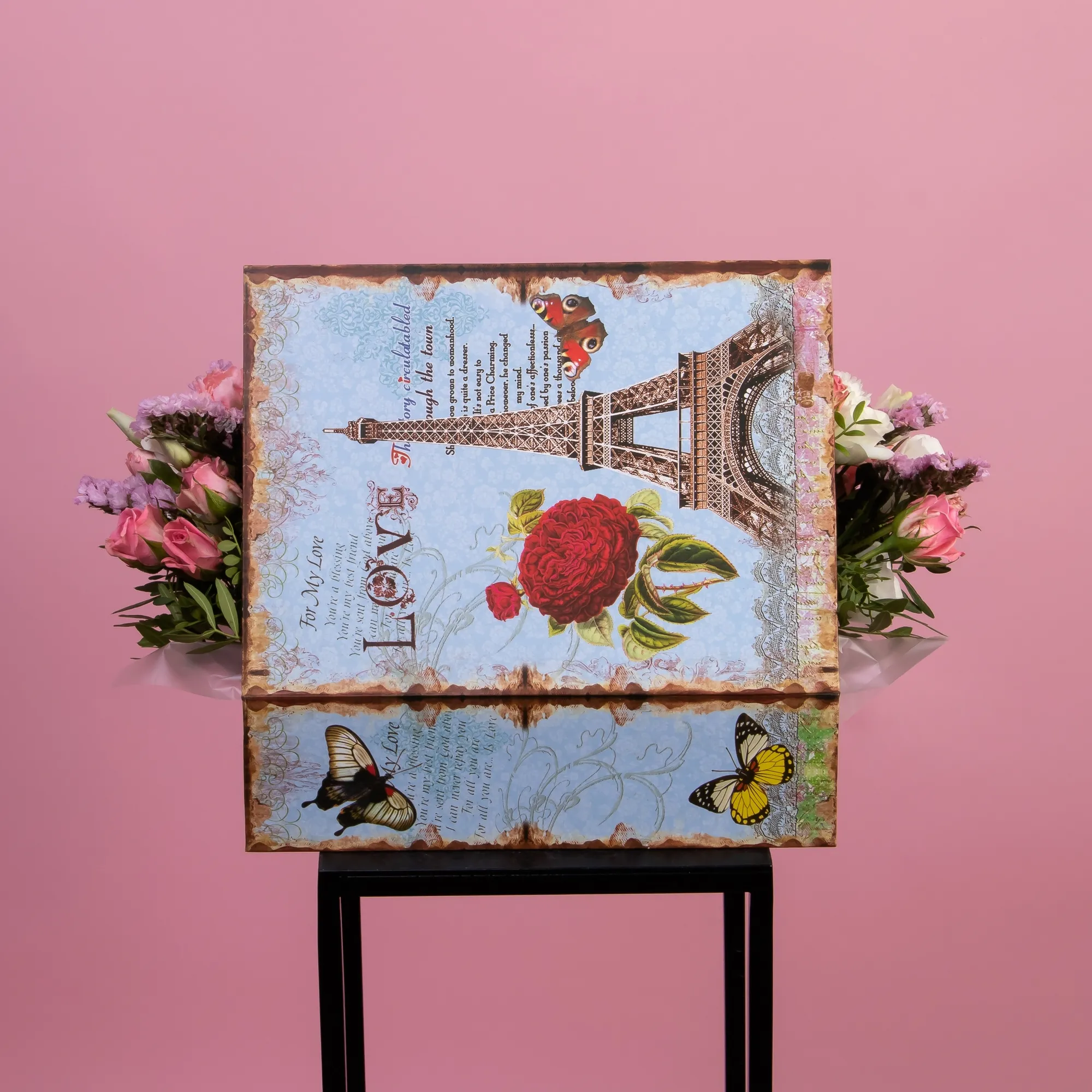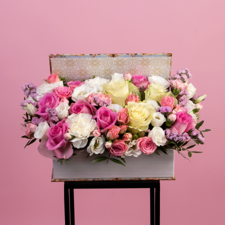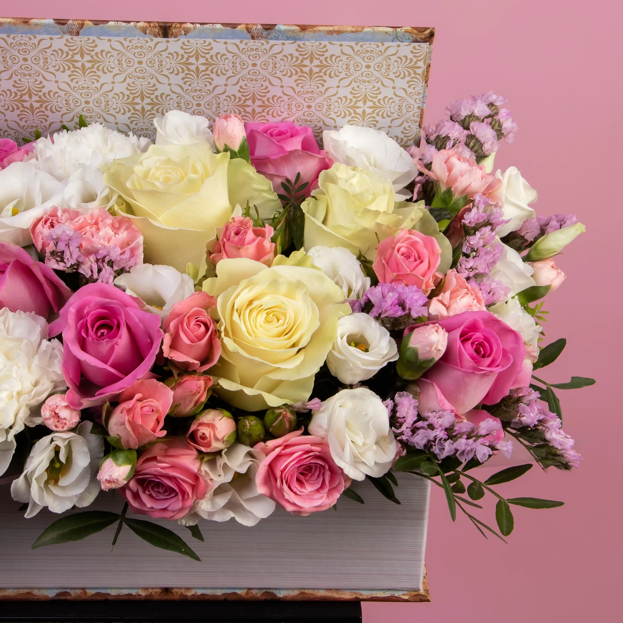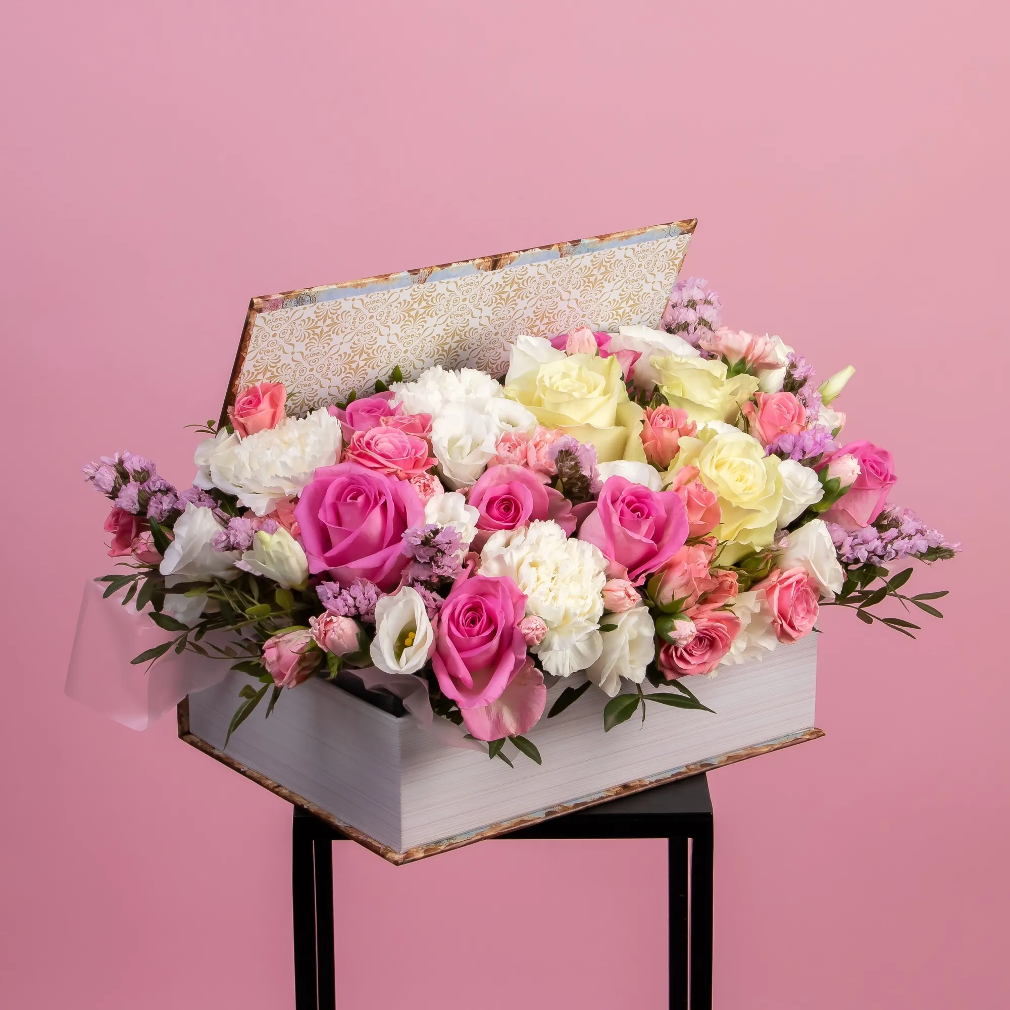 Каждая наша цветочная книга уникальна, поэтому состав и цветовая гамма композиции могут меняться. Внутри цветочной книги находится оазис, увлажненный водой со специальным раствором - кризалом, который позволяет цветам простоять как можно дольше. Композиция книга- это идеальный подарок на любой праздник, его удобно взять с собой, поставить на любую поверхность и просто наслаждаться ароматом и красотой живущих в нем цветов.
