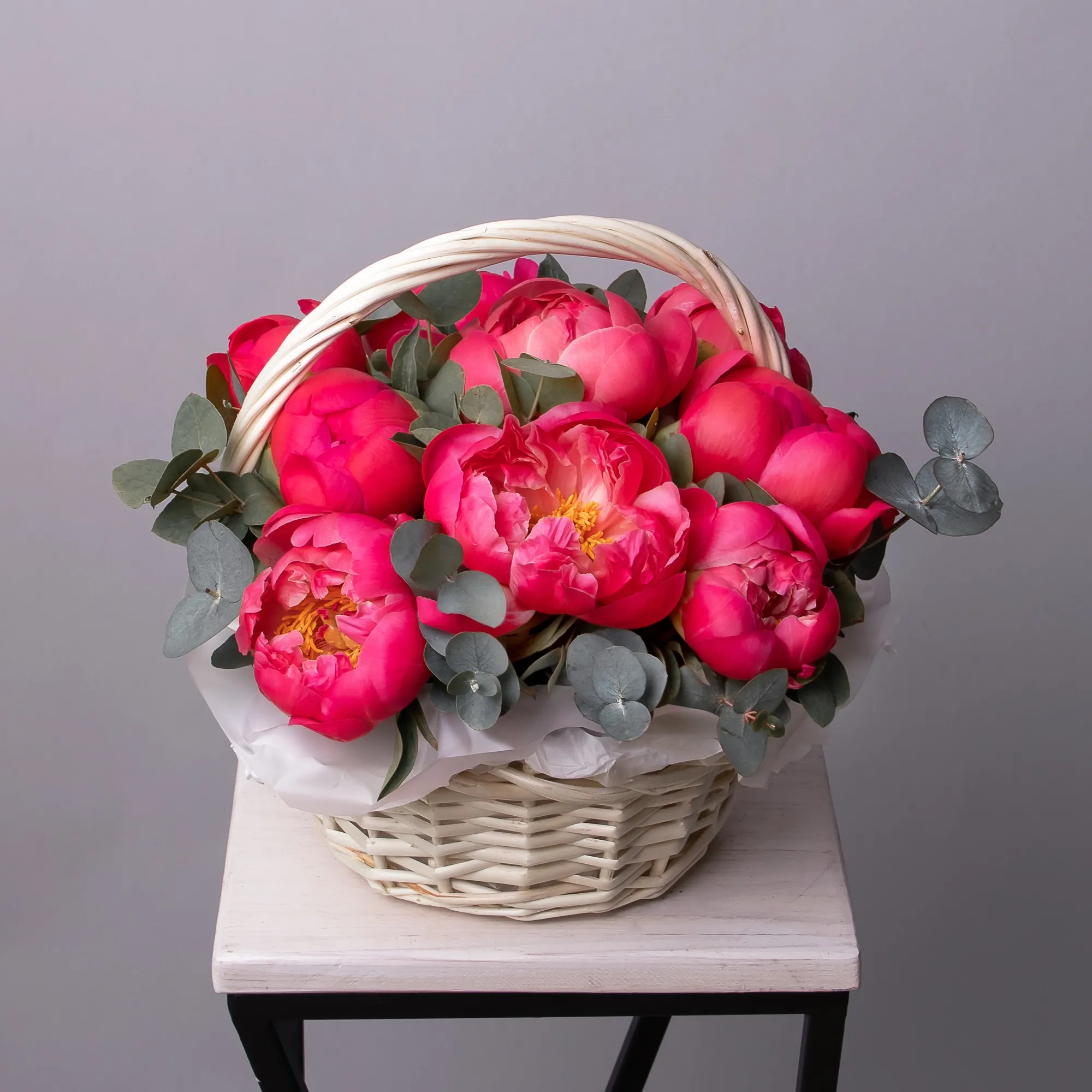 Композиция собрана из 9 шикарных пионов, одного из самых популярных сортов Корал Шарм, дополнена веточками эвкалипта.