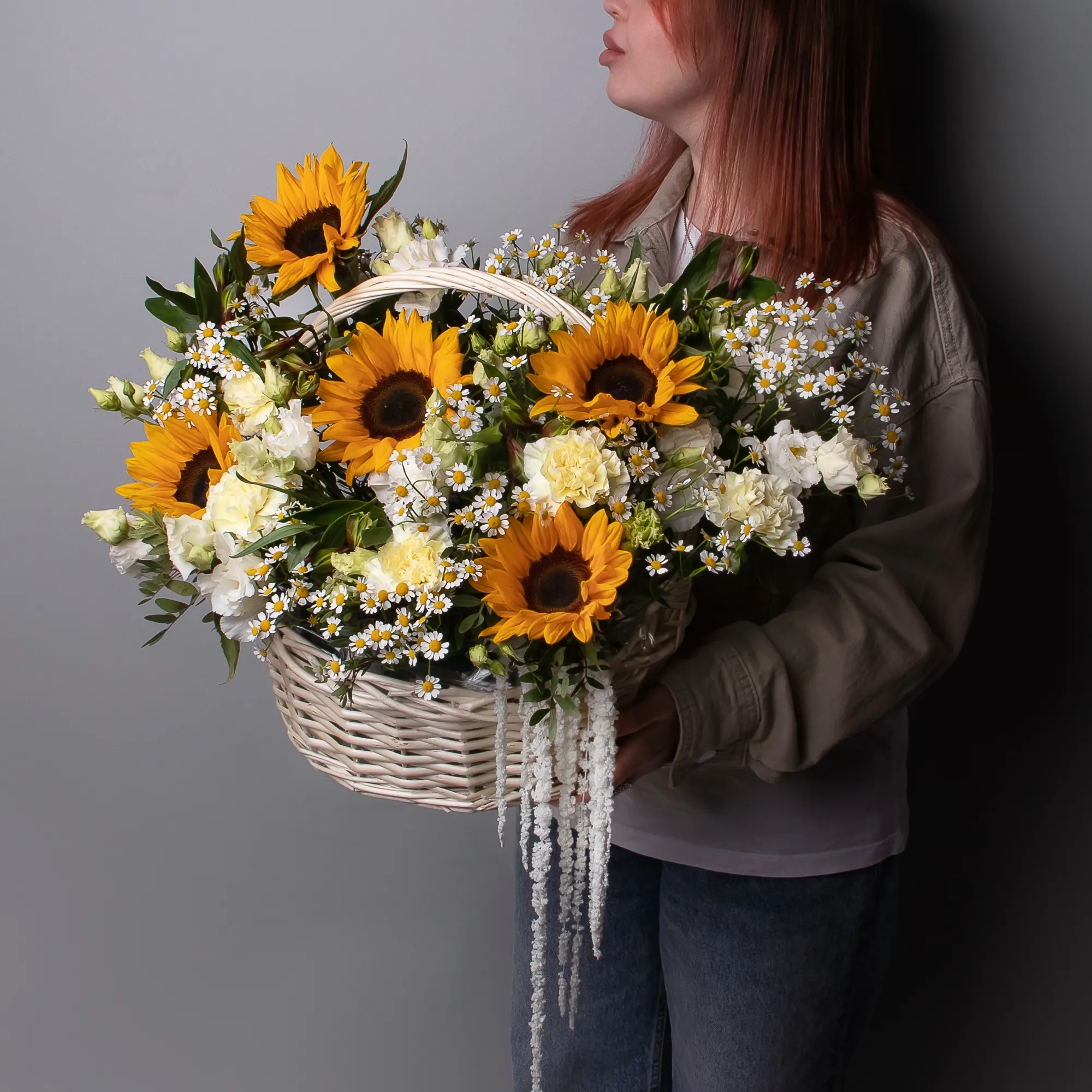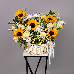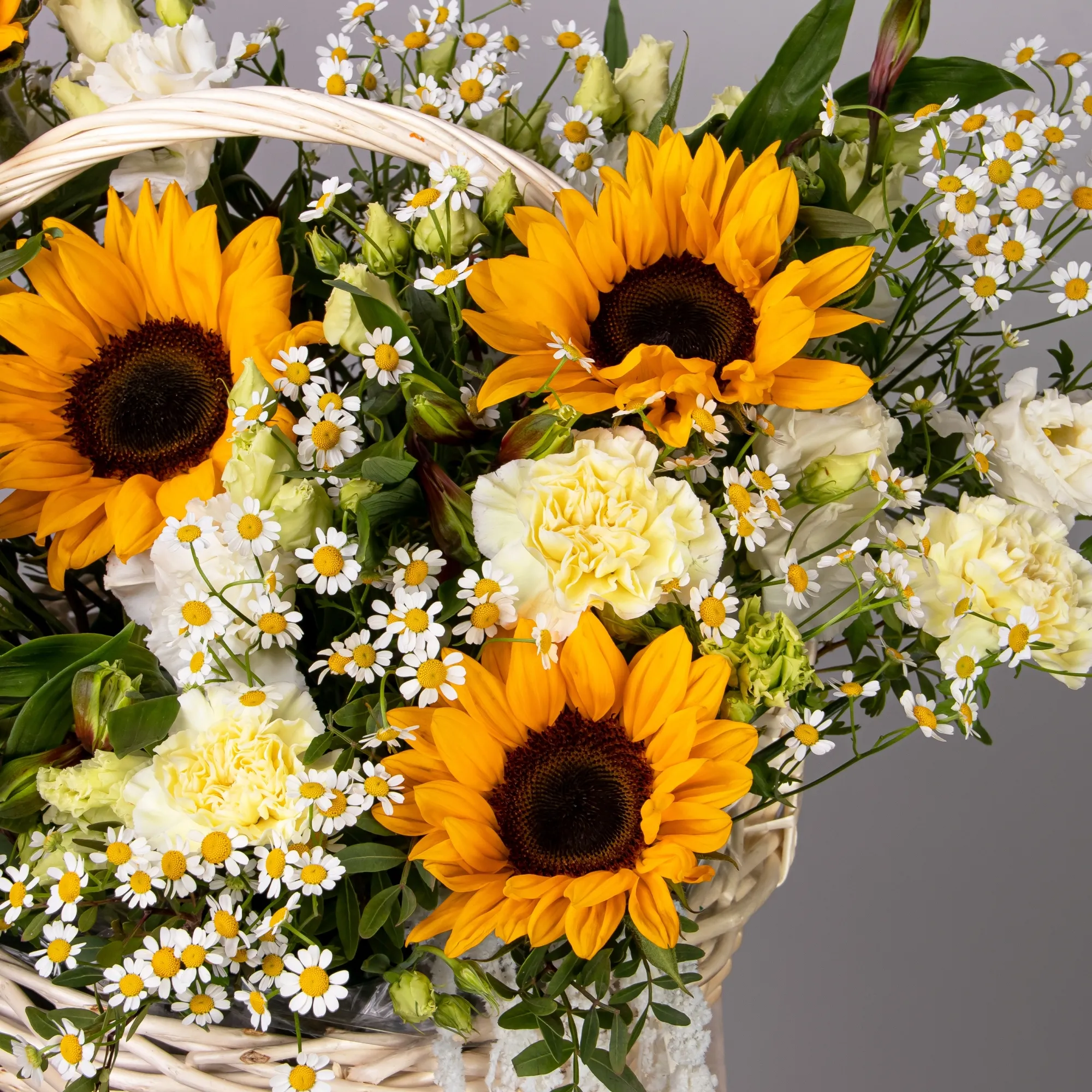 Гвоздика-5, Подсолнух-5, Ромашка-10, Альстромерия-9, Эустома-5, Листья фисташки-5