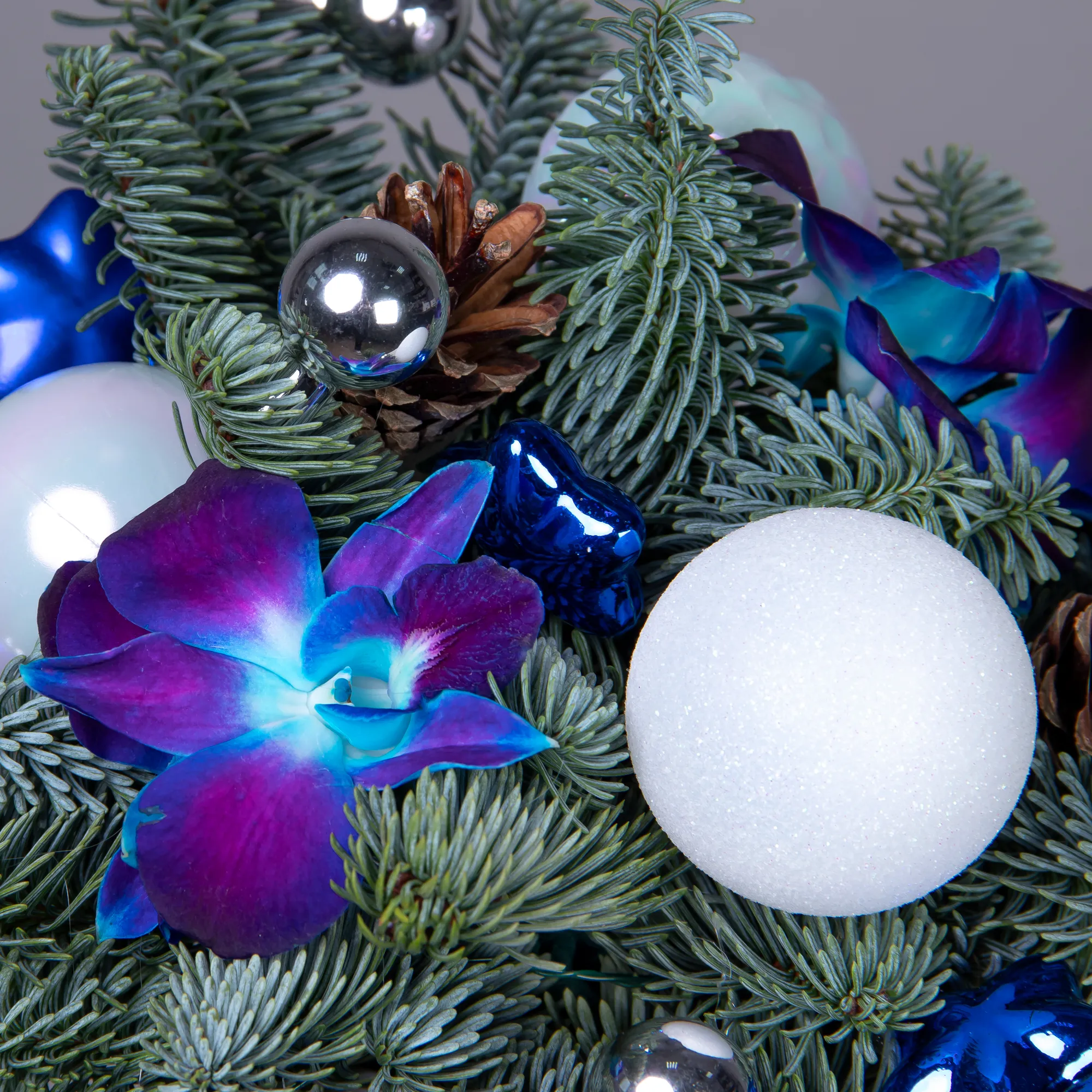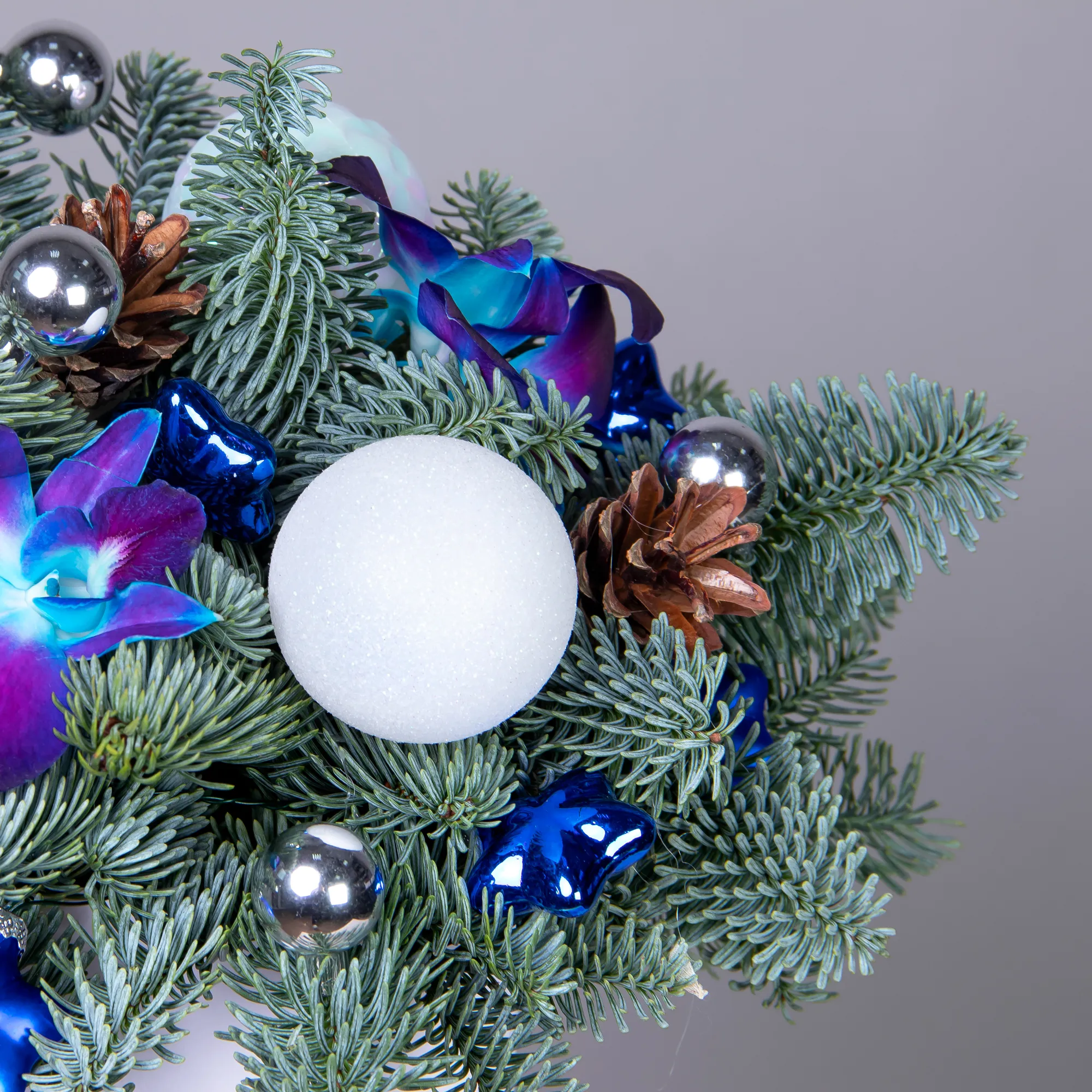 Отличительная особенность наших новогодних композиций в том, что она собрана на флористической губке. Рекомендуется периодически опрыскивать и смачивать губку, это значительно продлит срок службы.