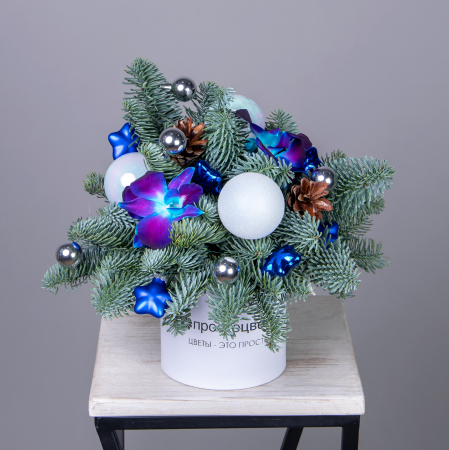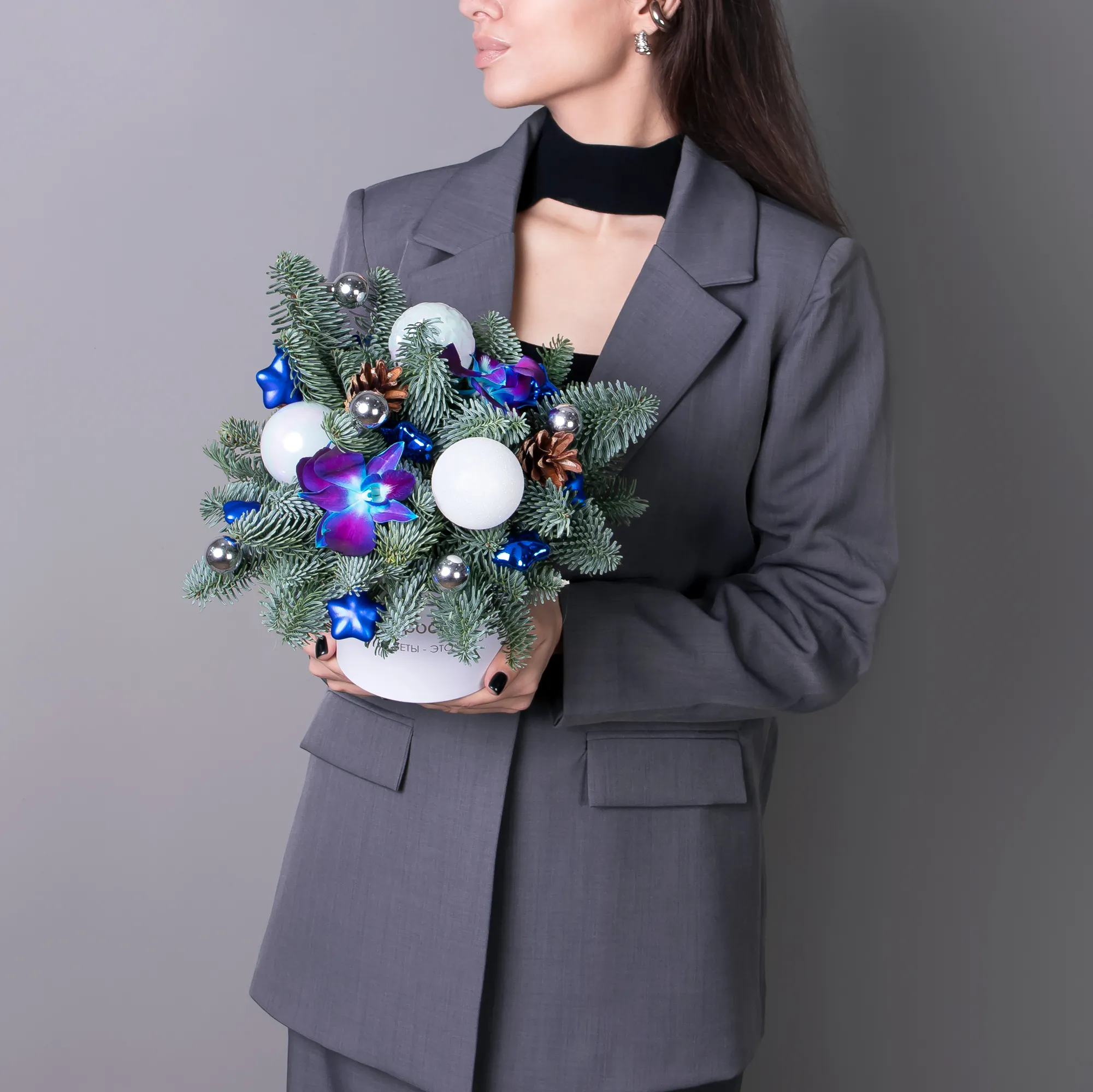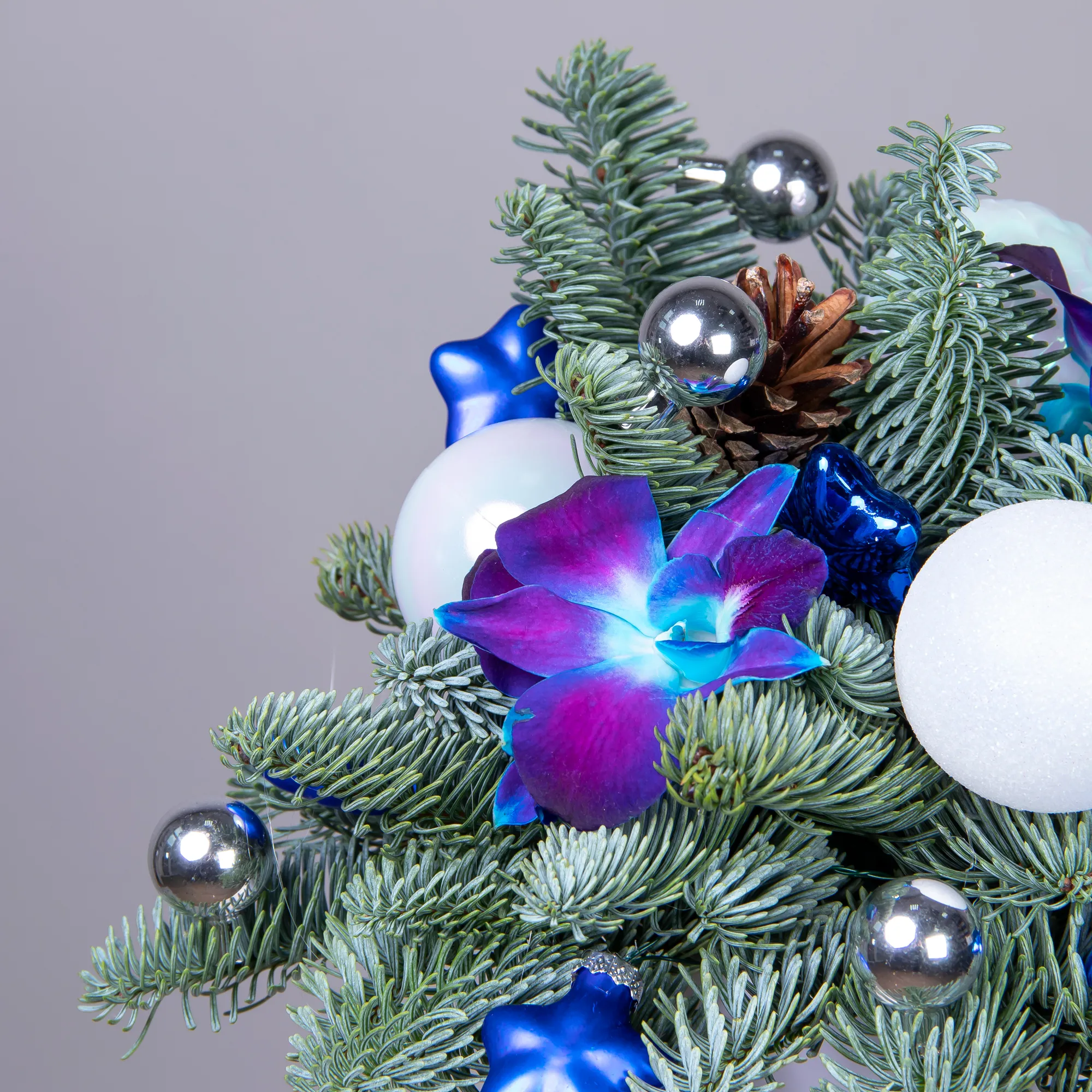 Эта композиция состоит из изящной новогодней ёлочки, выполненной из натральных веточек лапника датской пихты сорта нобилис. Ёлочка украшена большим количеством ярких и красивых игрушек, которые придают ей праздничный и нарядный вид.