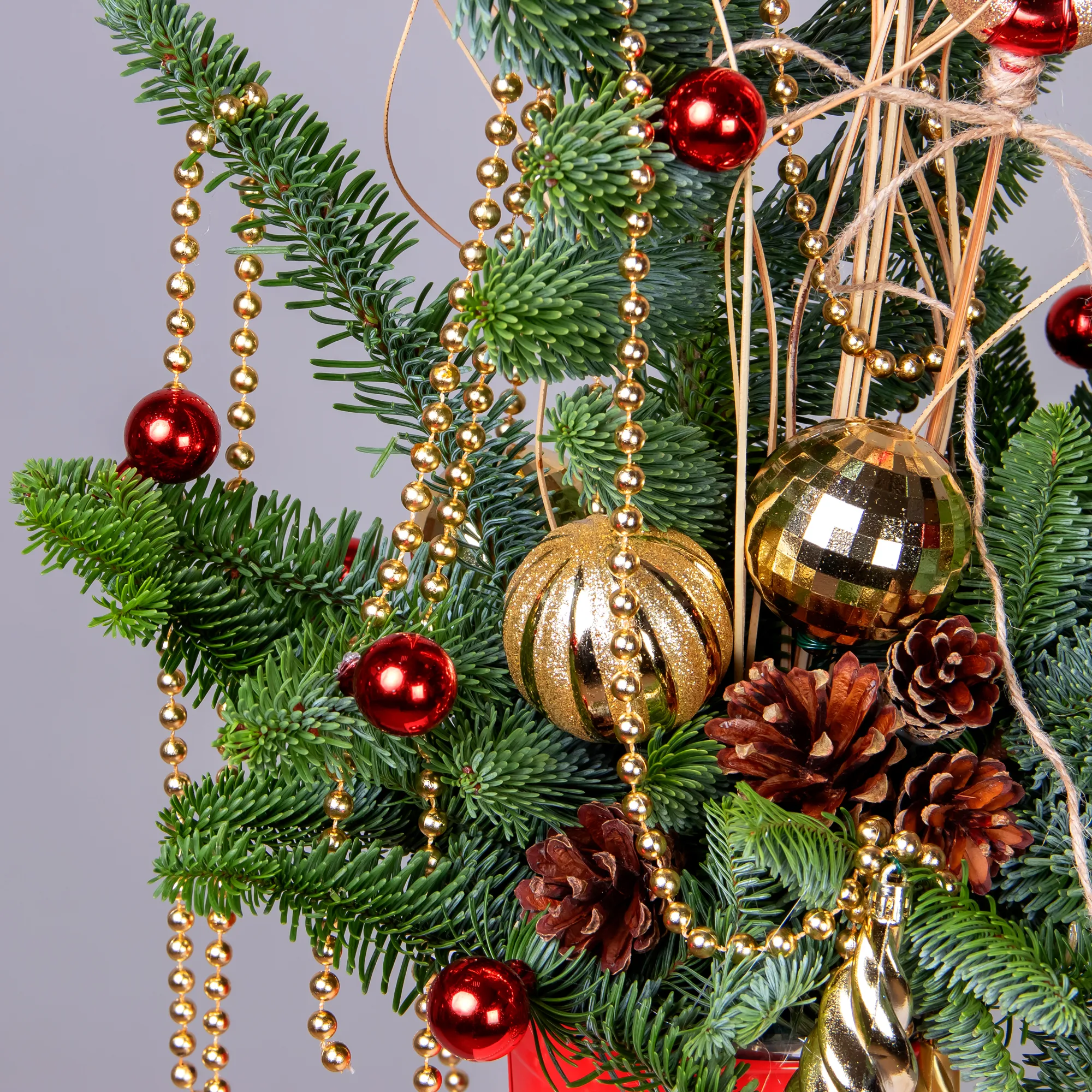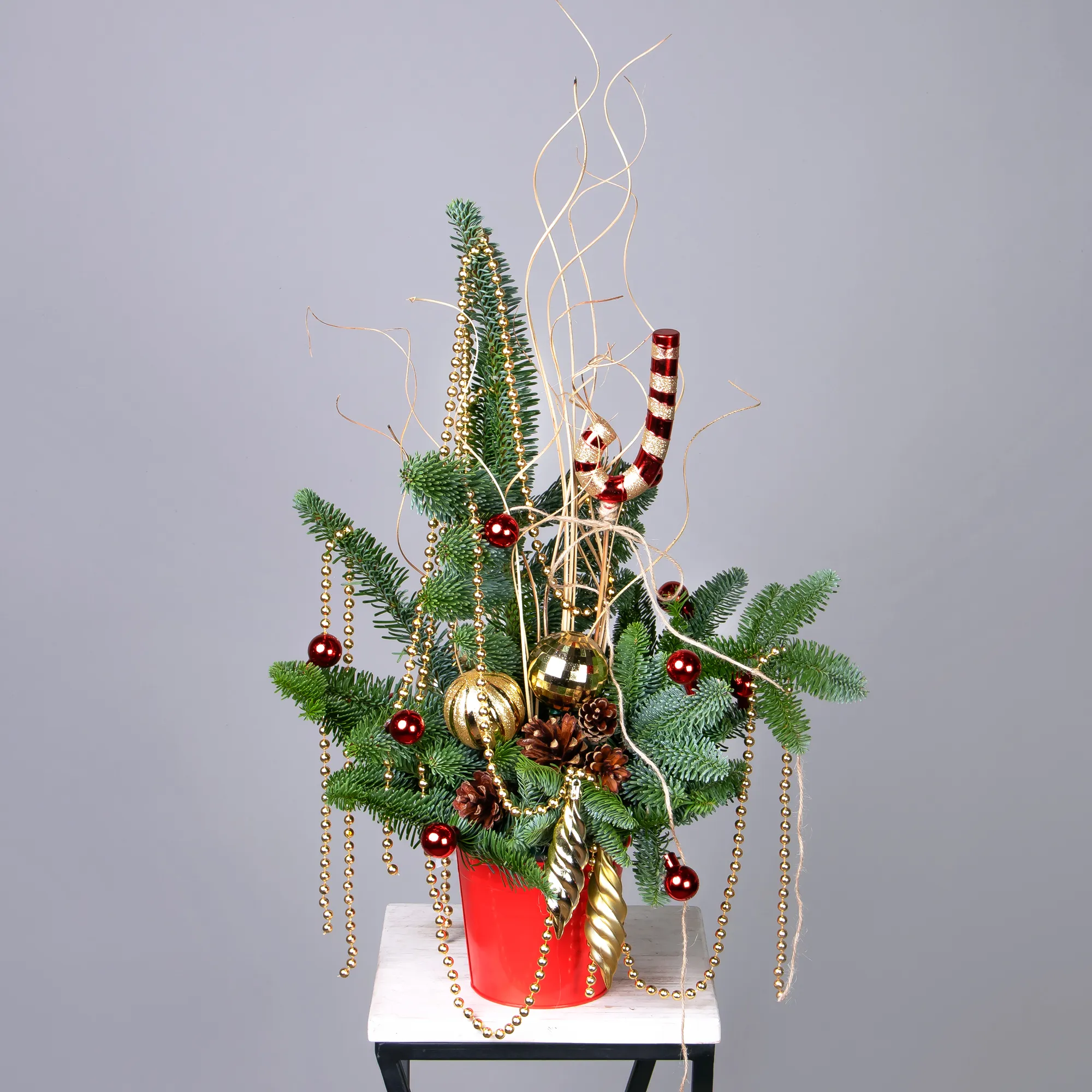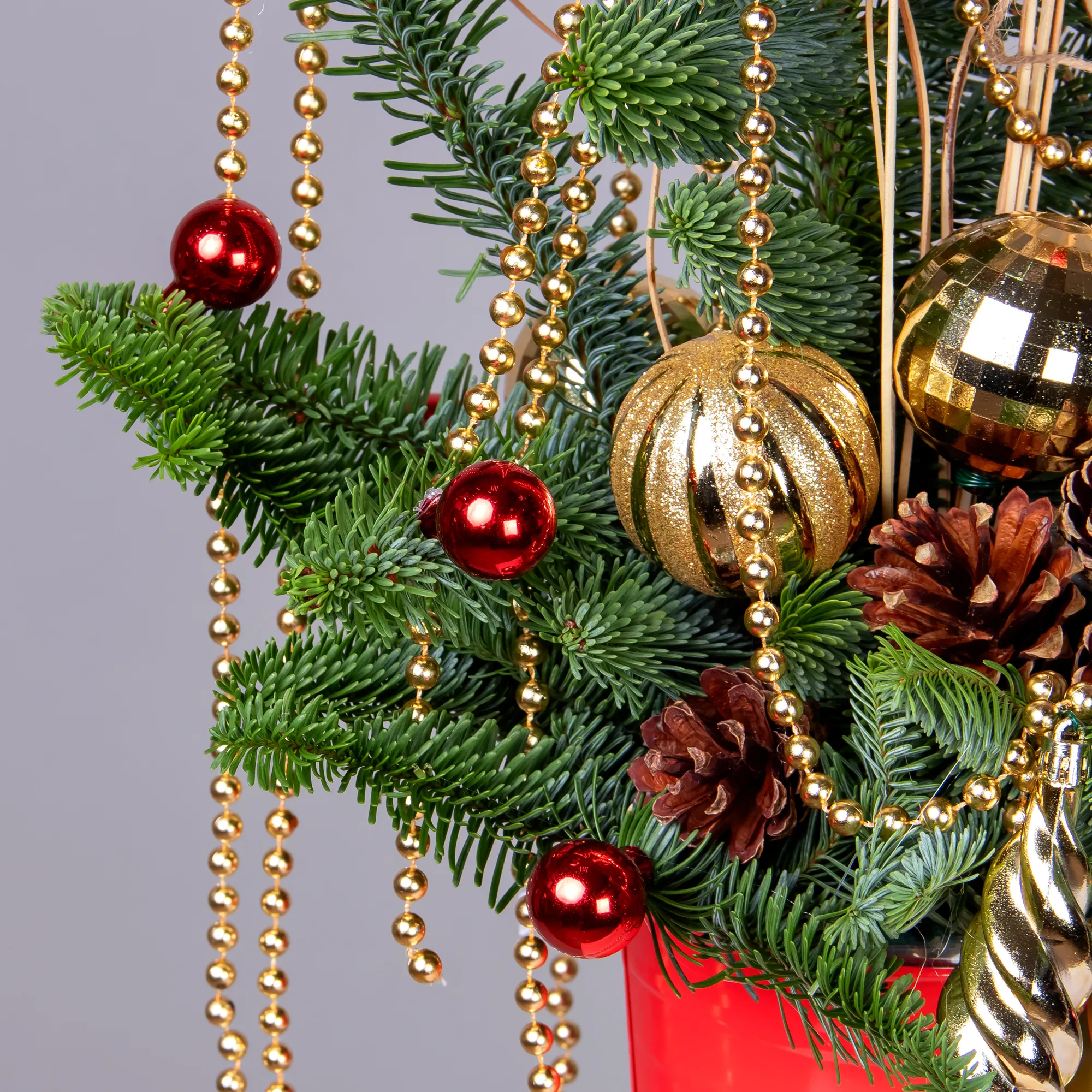 Композиция "Новогодняя с золотыми бусами в красном кашпо"