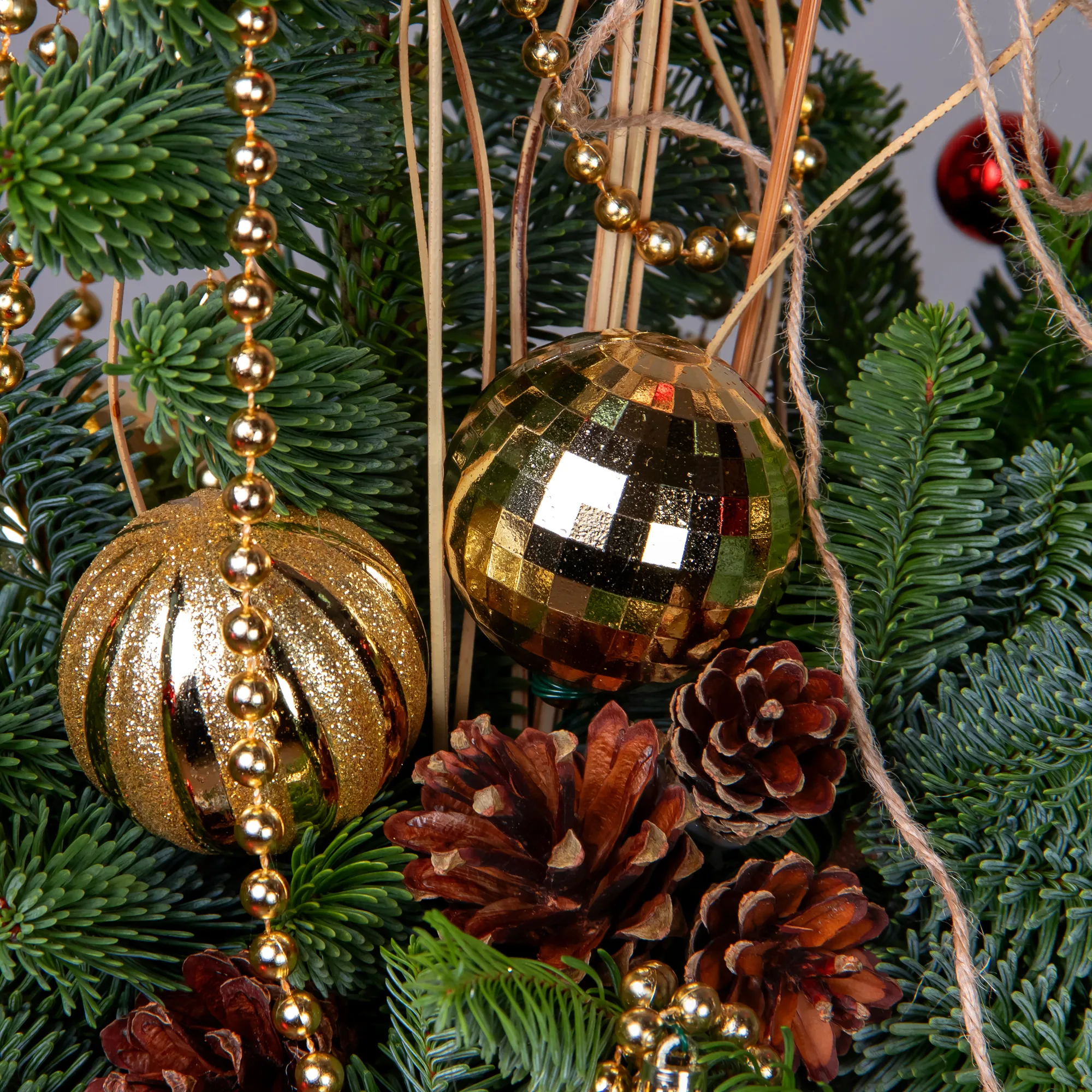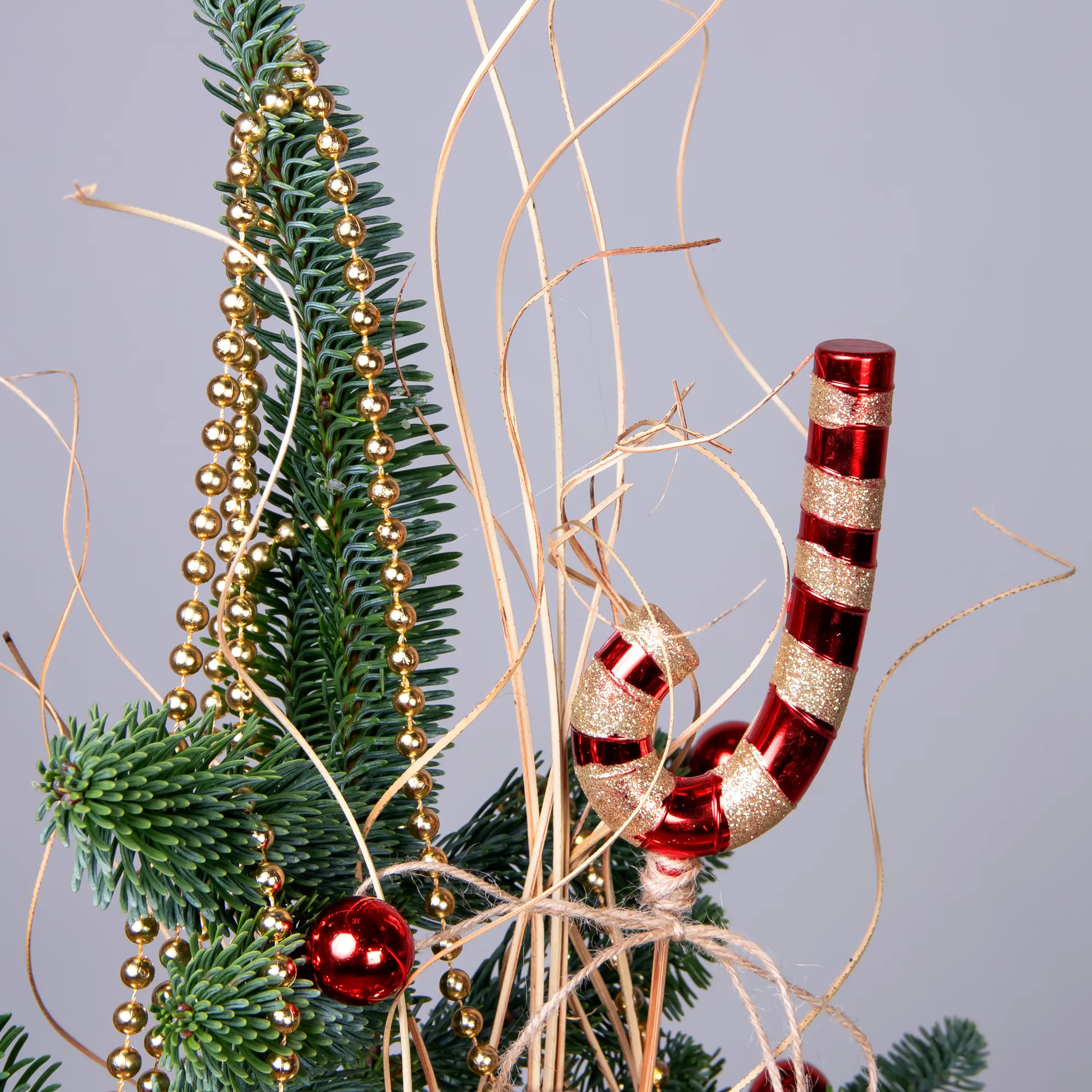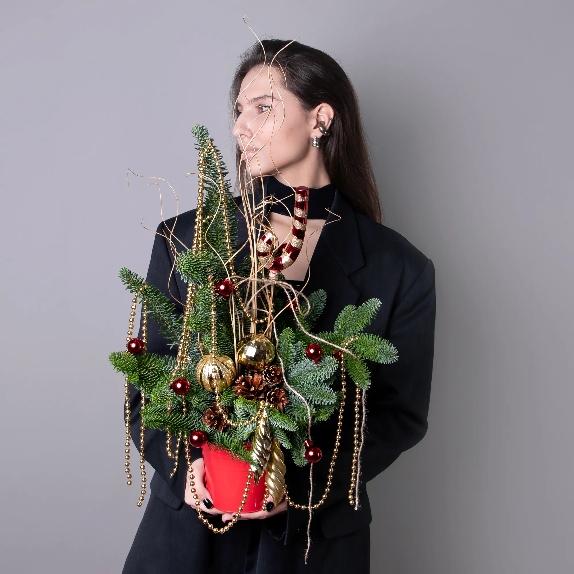 Композиция "Новогодняя с золотыми бусами в красном кашпо"