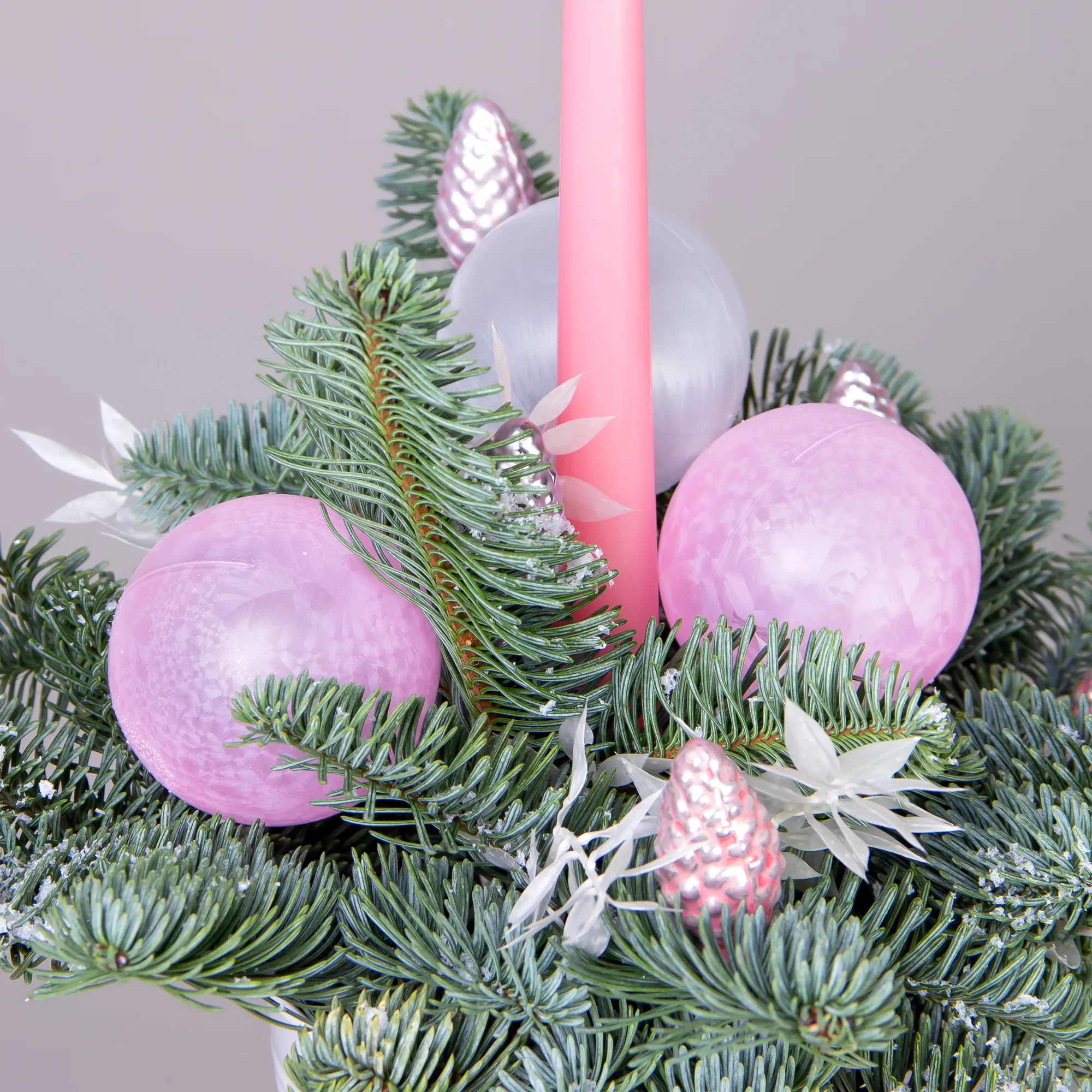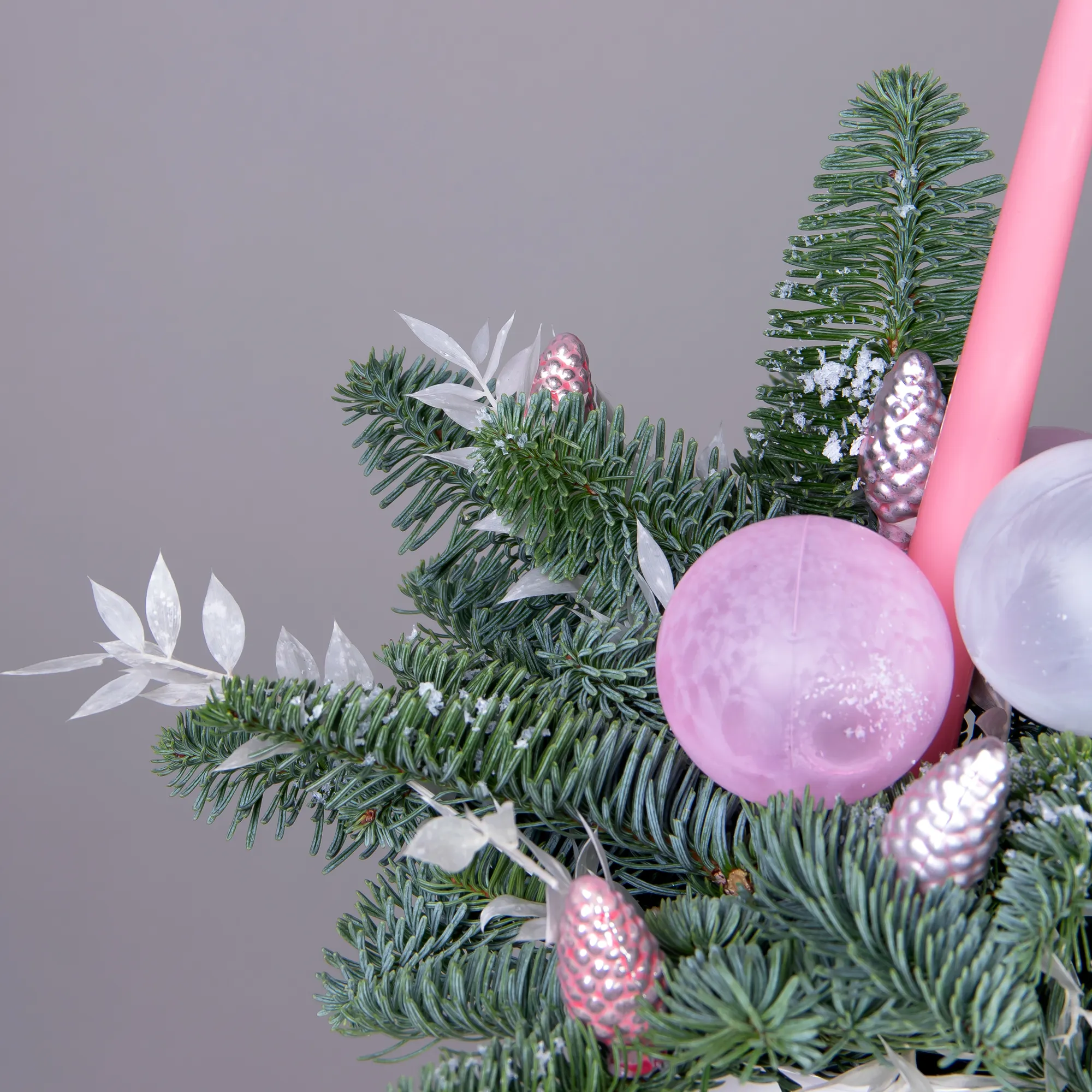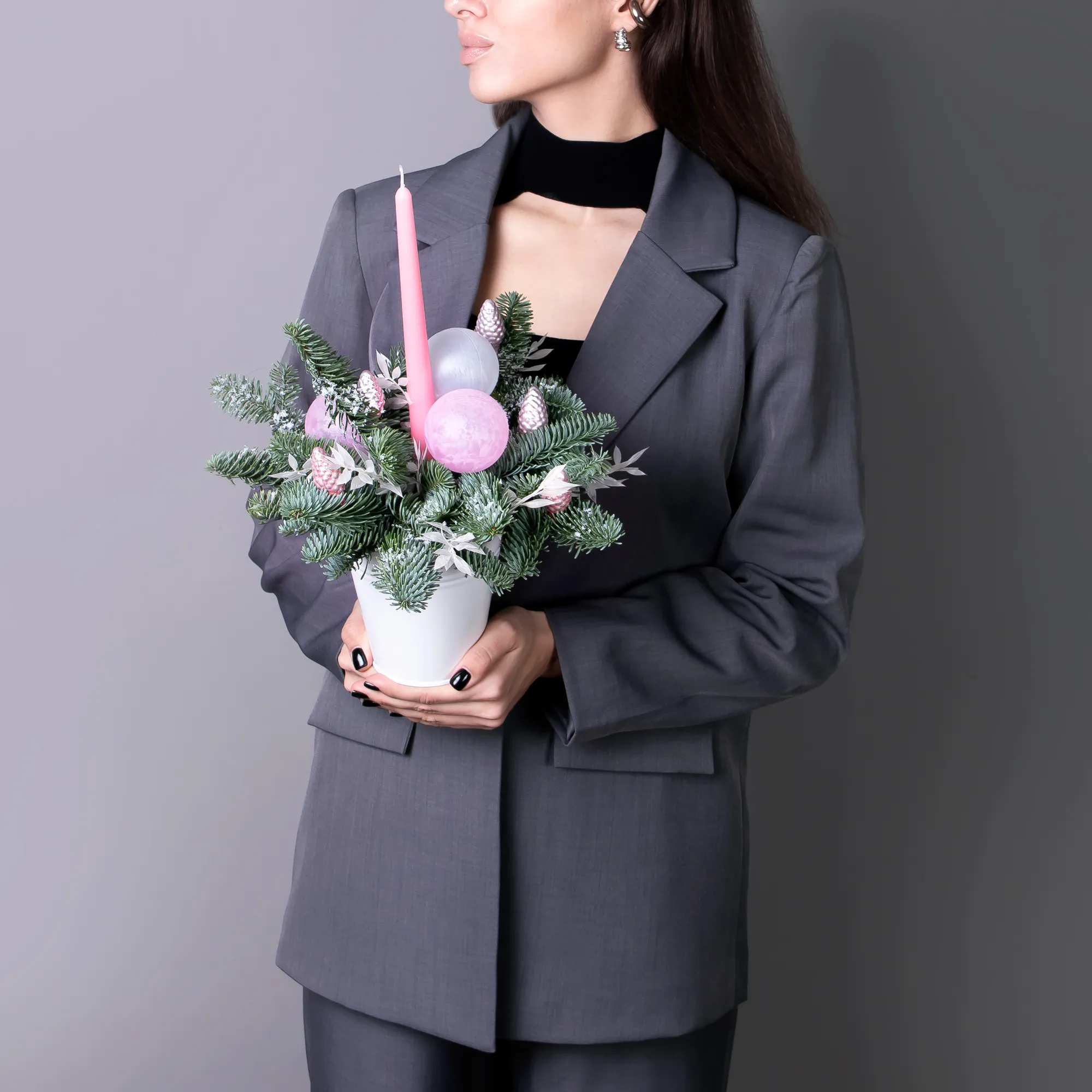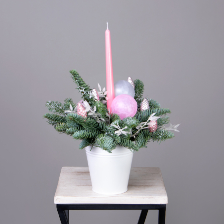Эта композиция состоит из изящной новогодней ёлочки, выполненной из натральных веточек лапника датской пихты сорта нобилис. Ёлочка украшена большим количеством ярких и красивых игрушек, которые придают ей праздничный и нарядный вид.