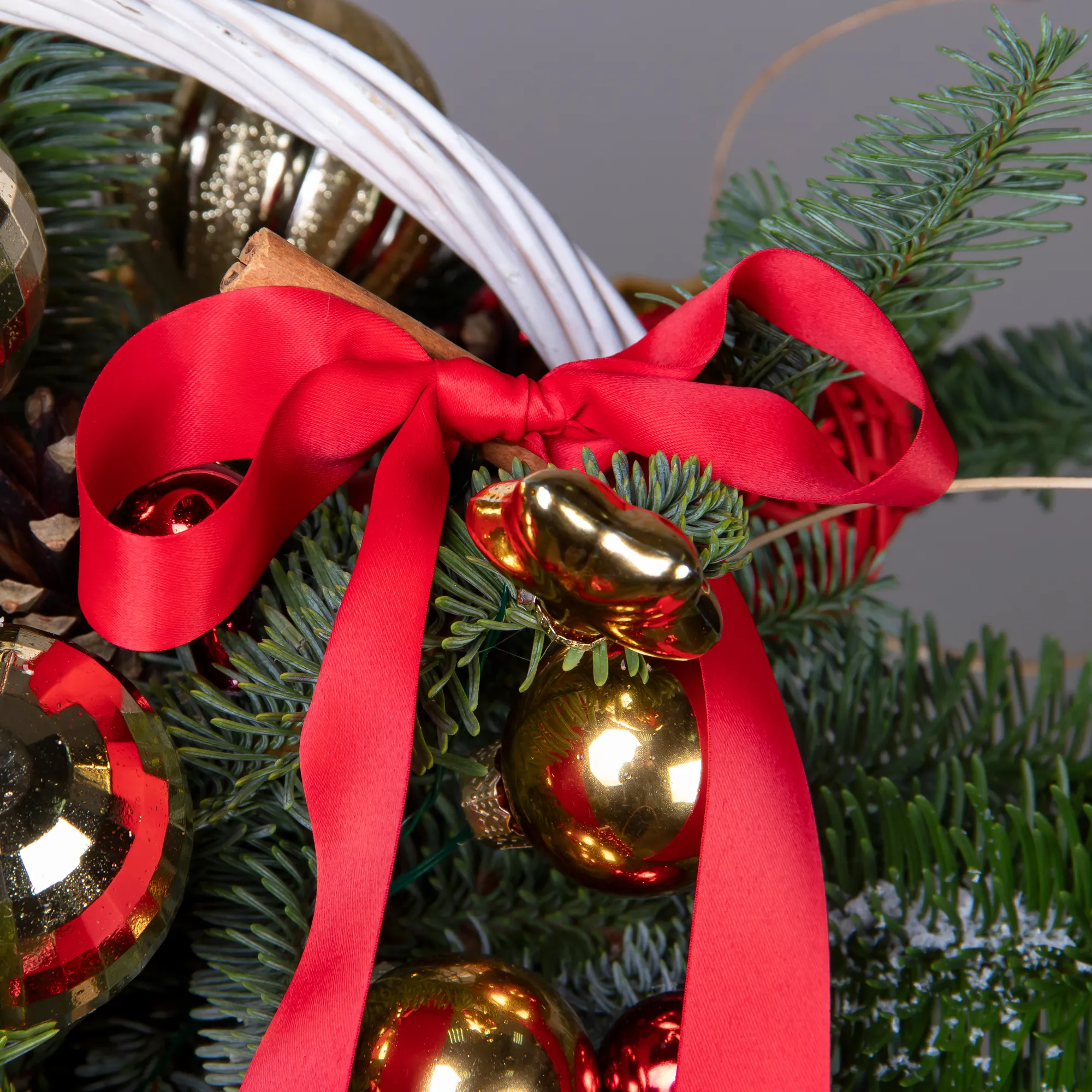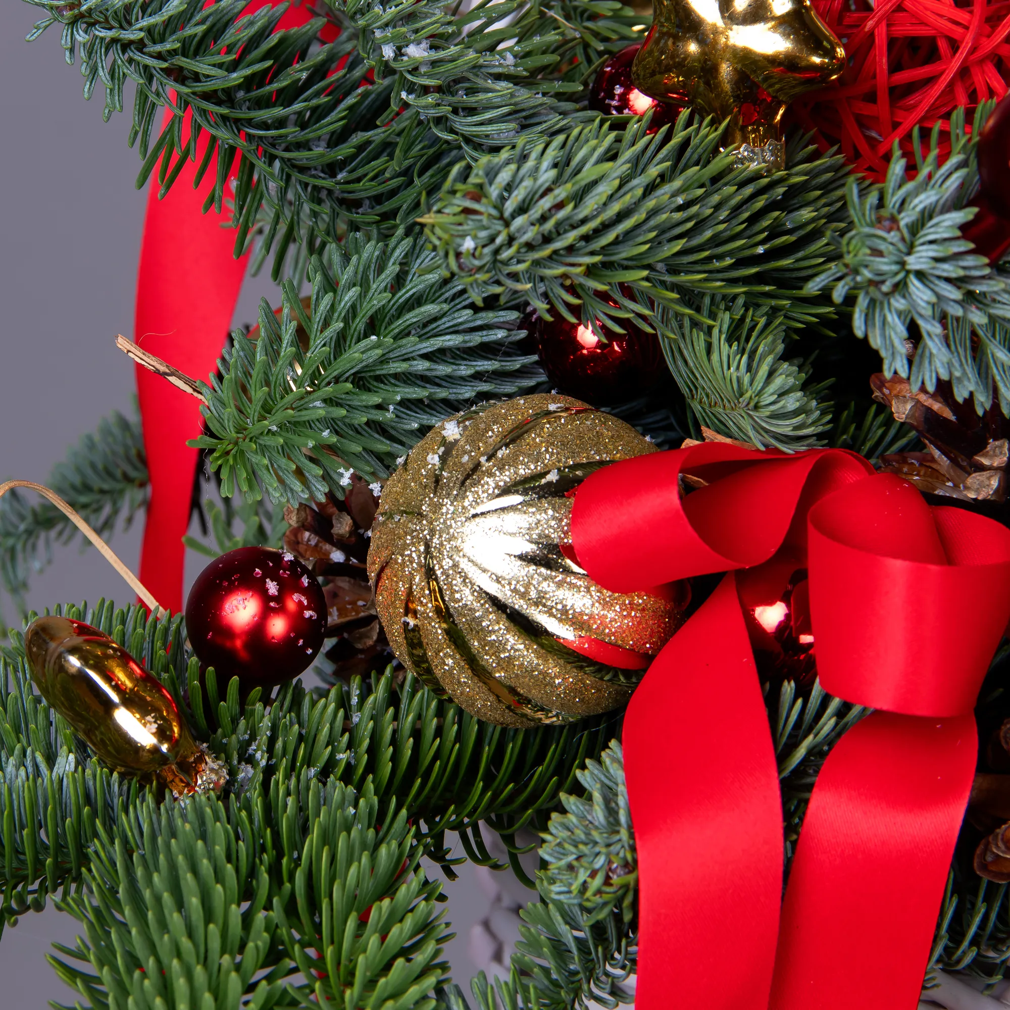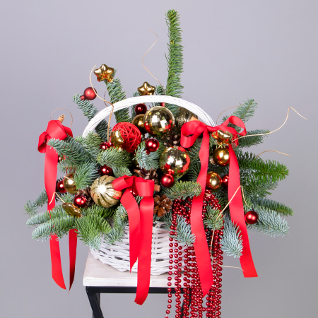 Эта композиция состоит из изящной новогодней ёлочки, выполненной из натральных веточек лапника датской пихты сорта нобилис. Ёлочка украшена большим количеством ярких и красивых игрушек, которые придают ей праздничный и нарядный вид.