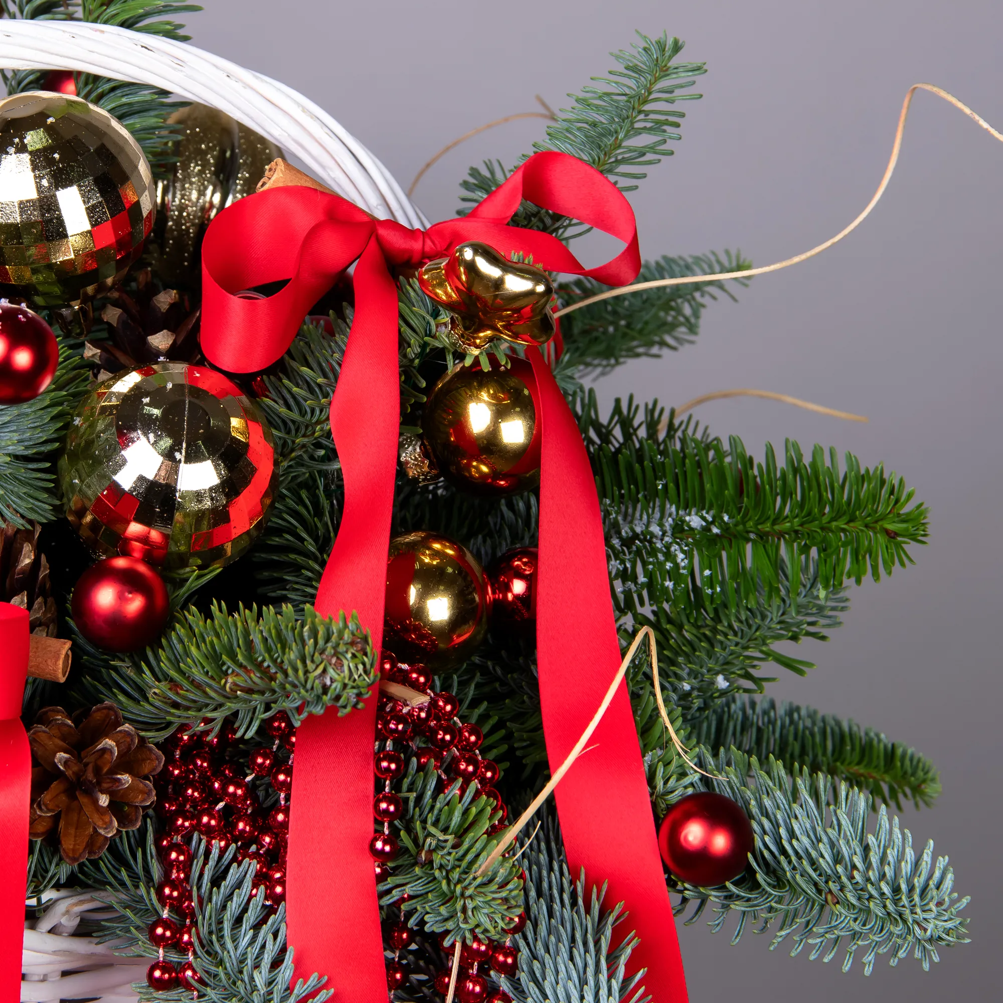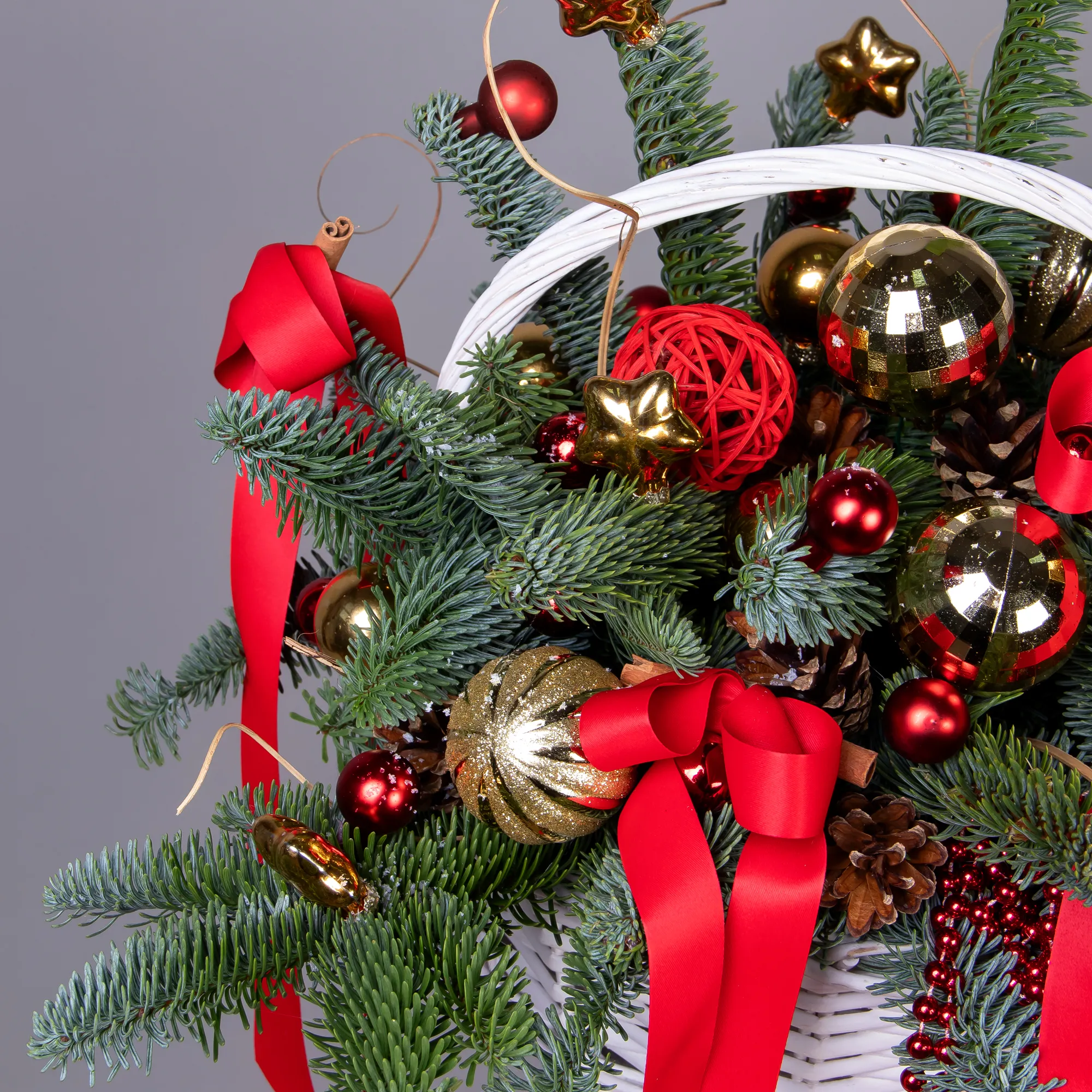 Всё это создает атмосферу радости и праздника, композиция наполнит дом ароматом живой ели и станет прекрасным украшением для вашего дома в новогодние праздники.