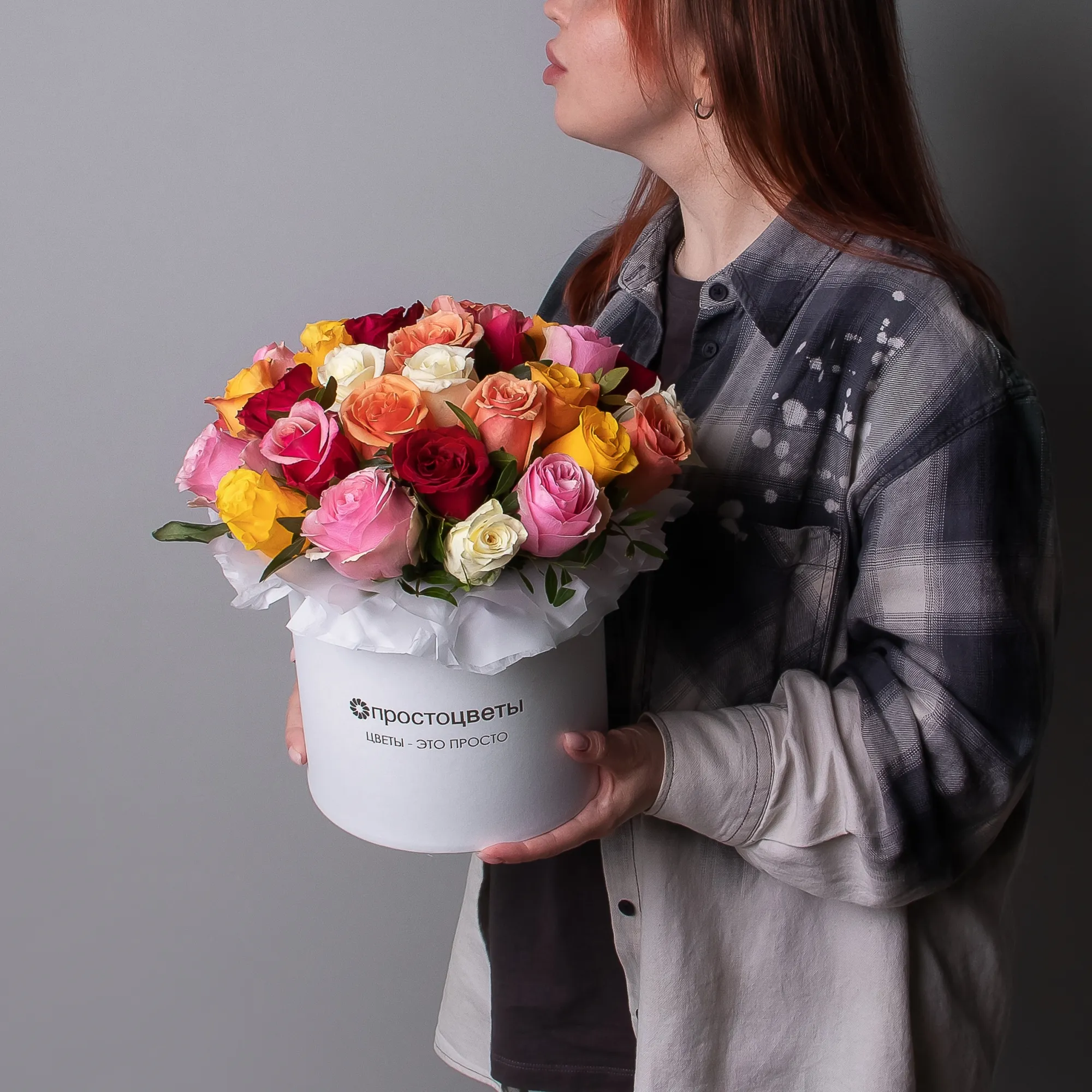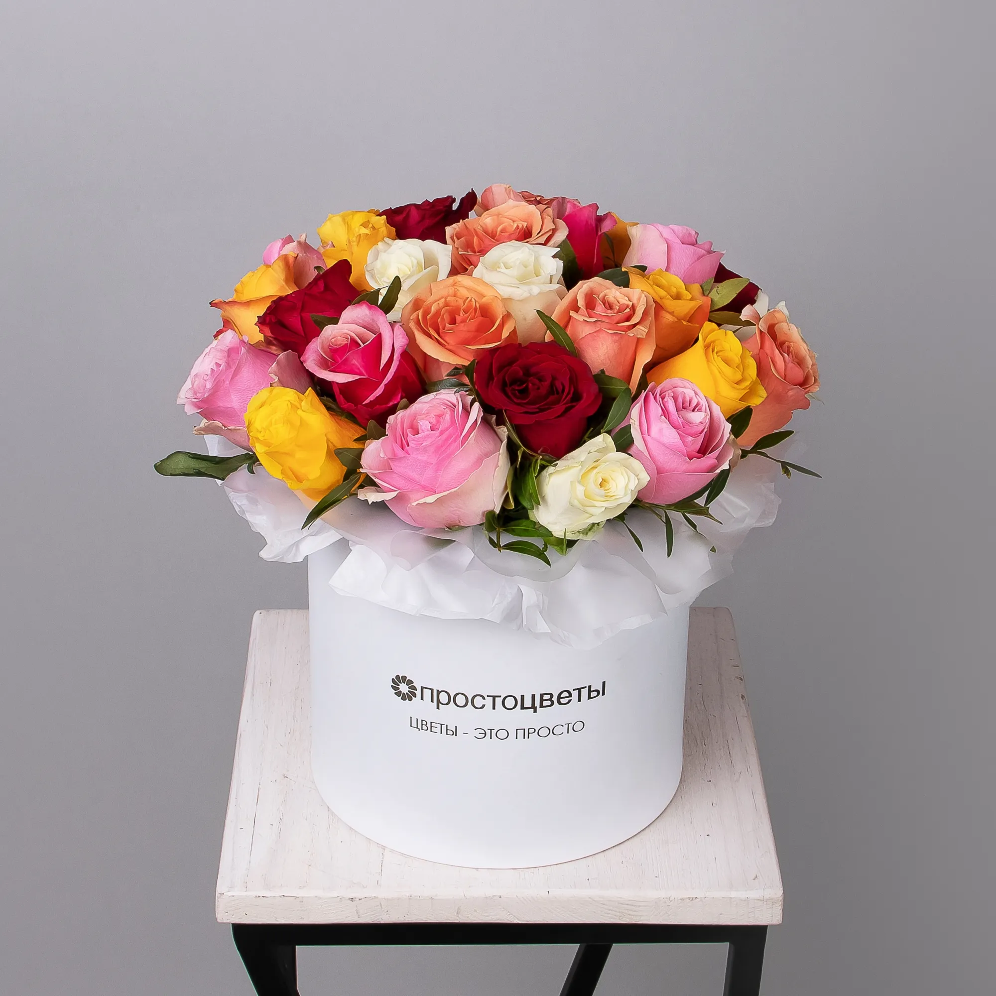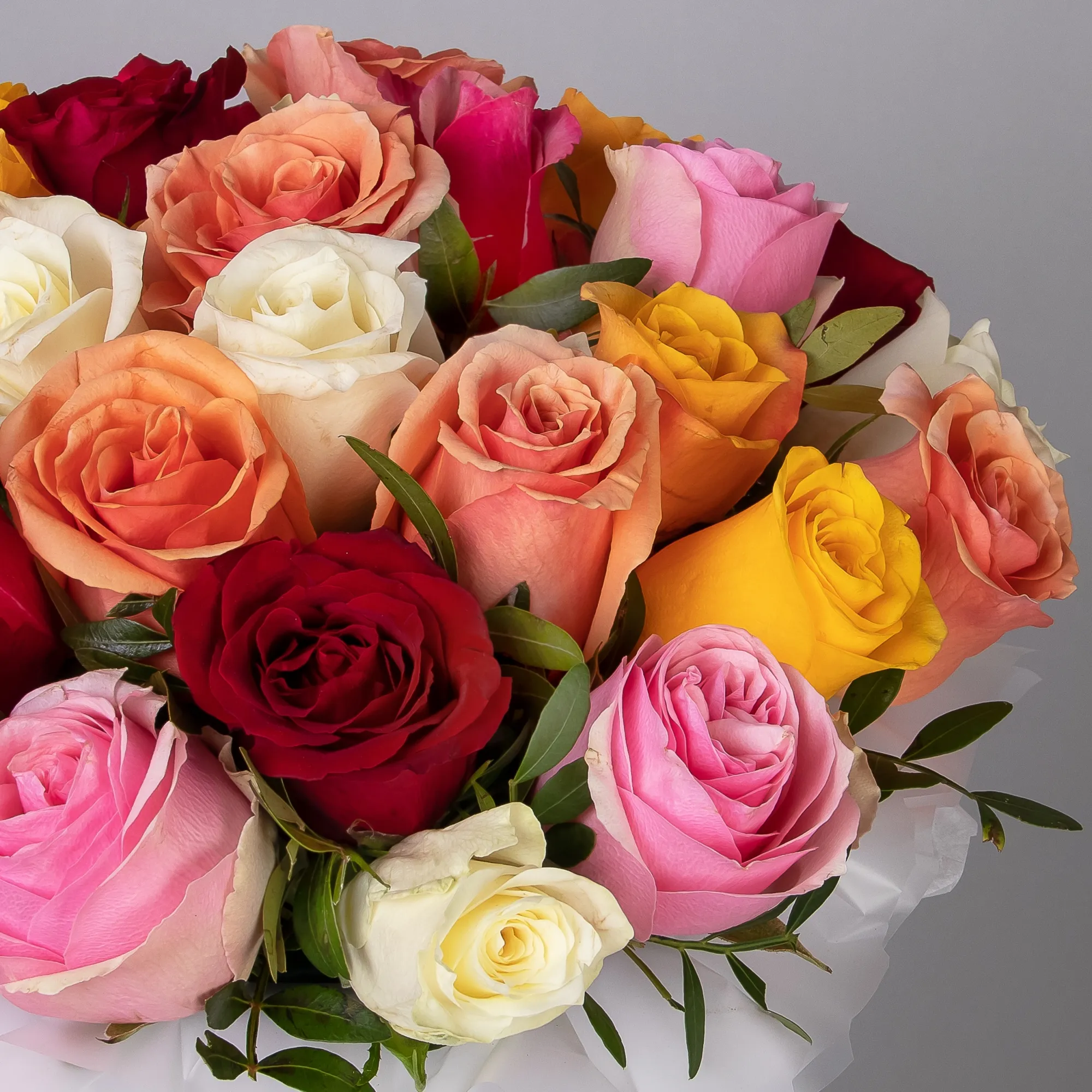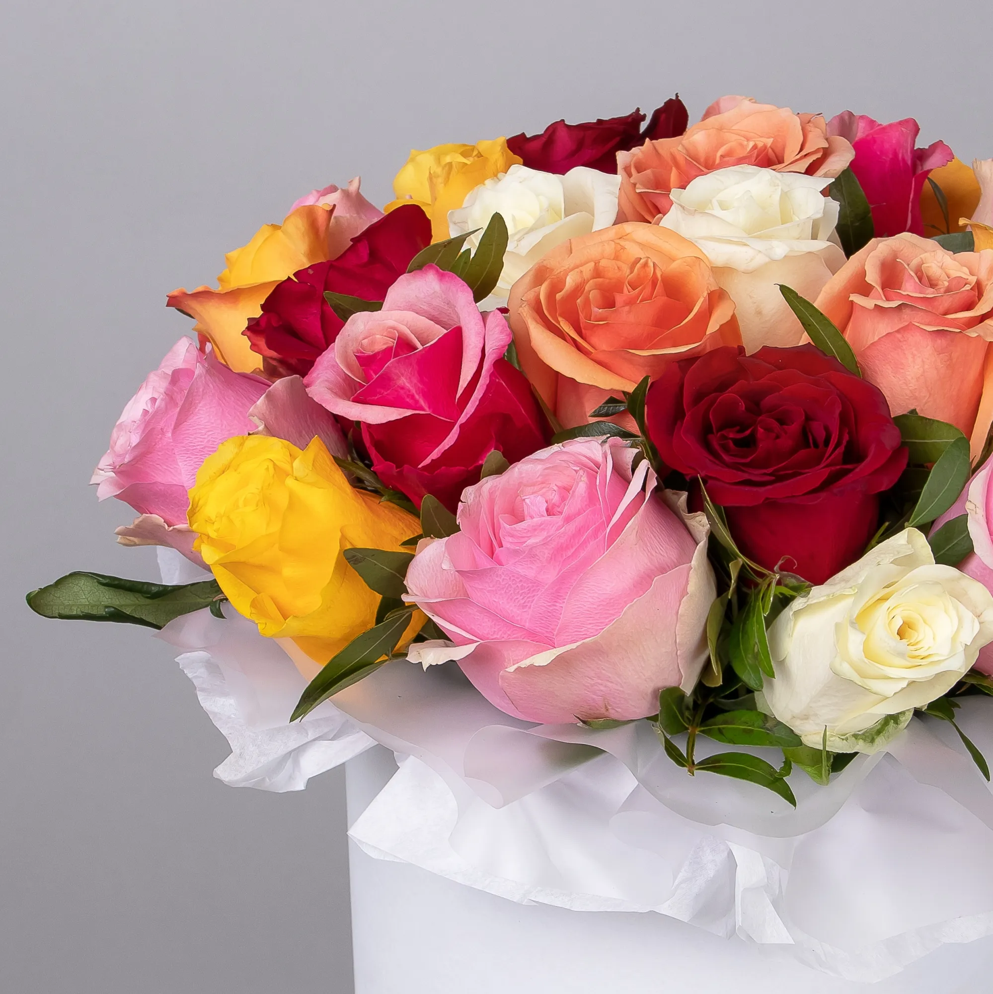 Композиция собрана из роз разного цвета и дополнена веточками фисташки.