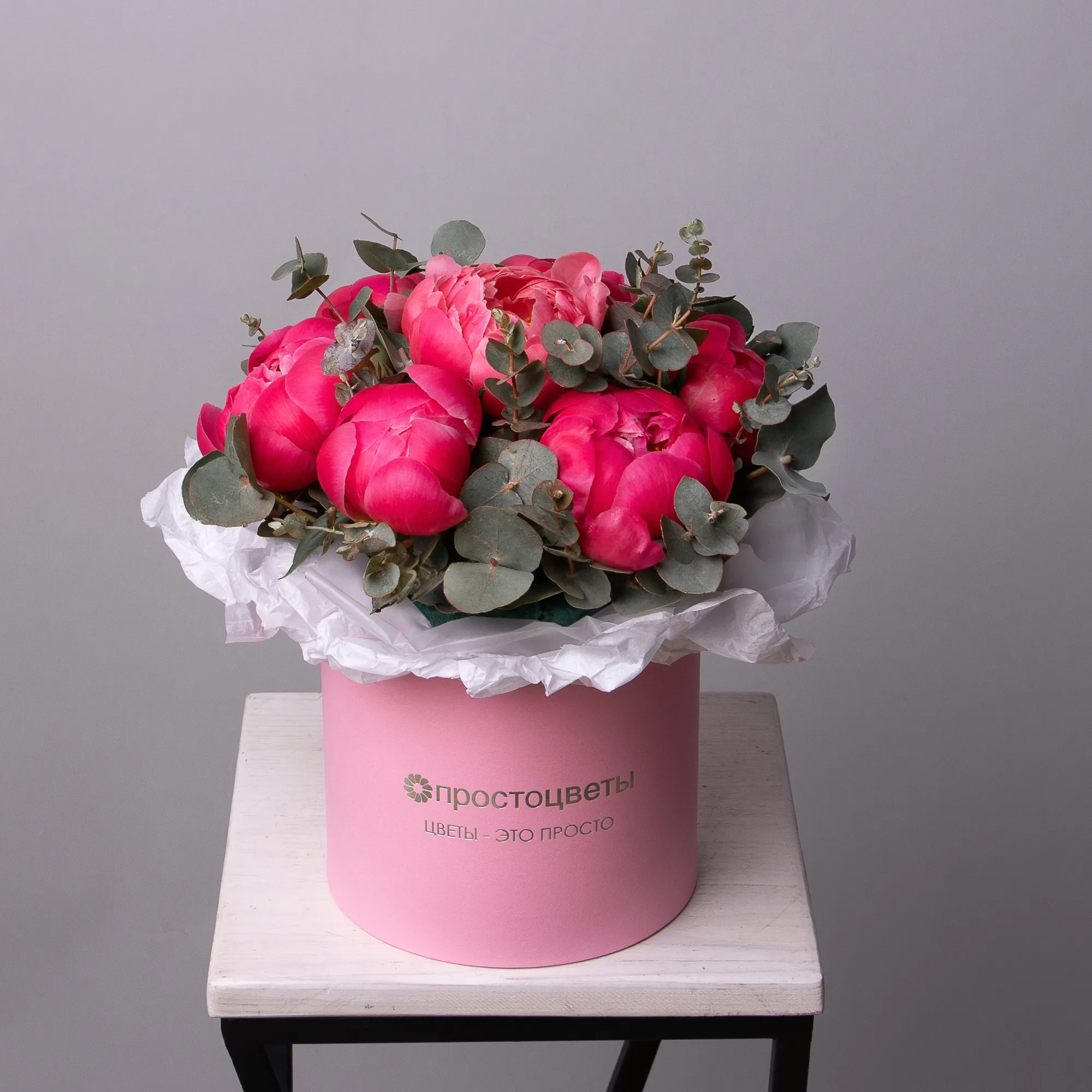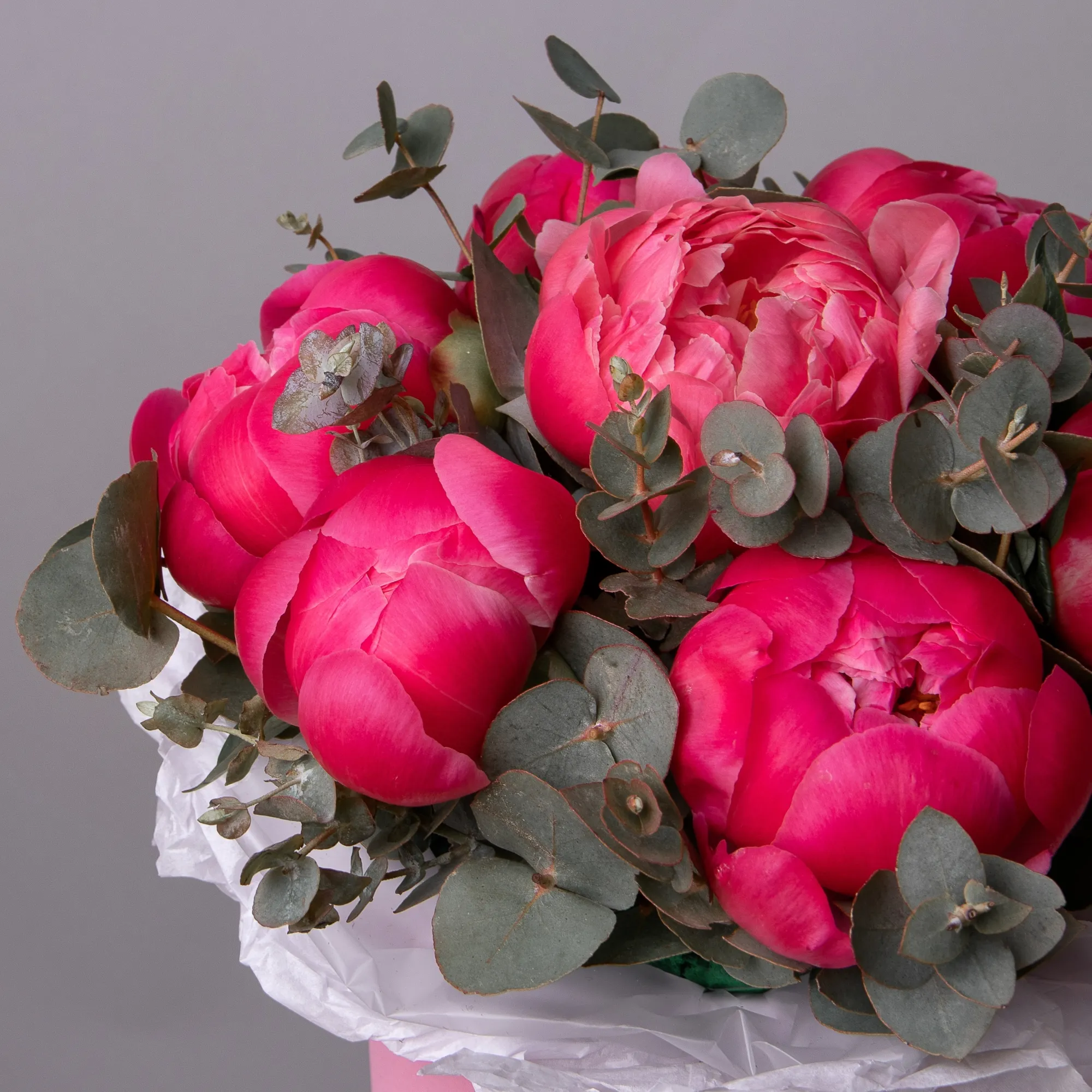 Композиция собрана из 7 шикарных пионов, одного из самых популярных сортов Корал Шарм, дополнена веточками эвкалипта.