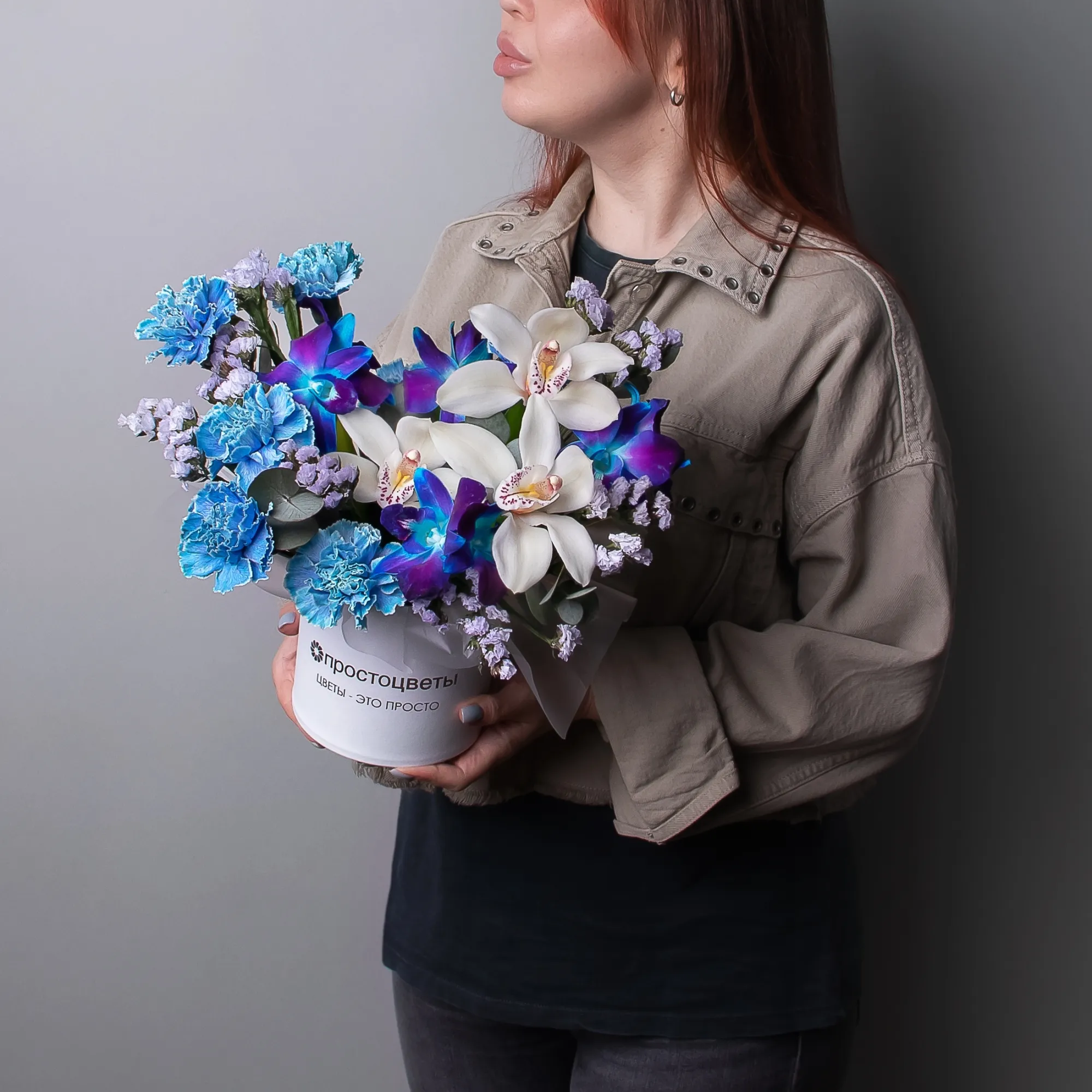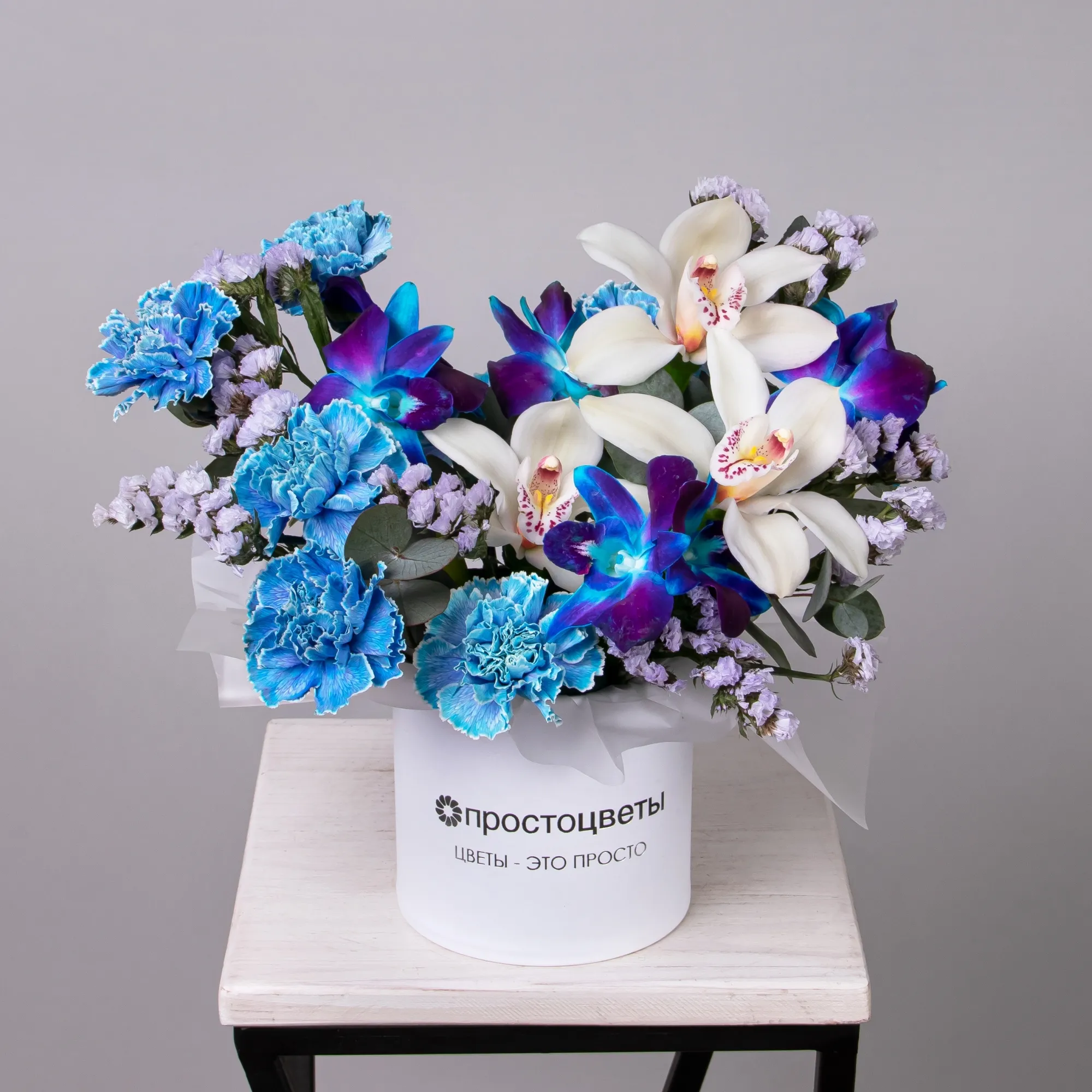 В составе этой шляпной коробки красная роза и синий дендробиумом - это сочетание, которое символизирует любовь и нежность. Красная роза - символ любви, а синий дендробиум - символ нежности и доверия.