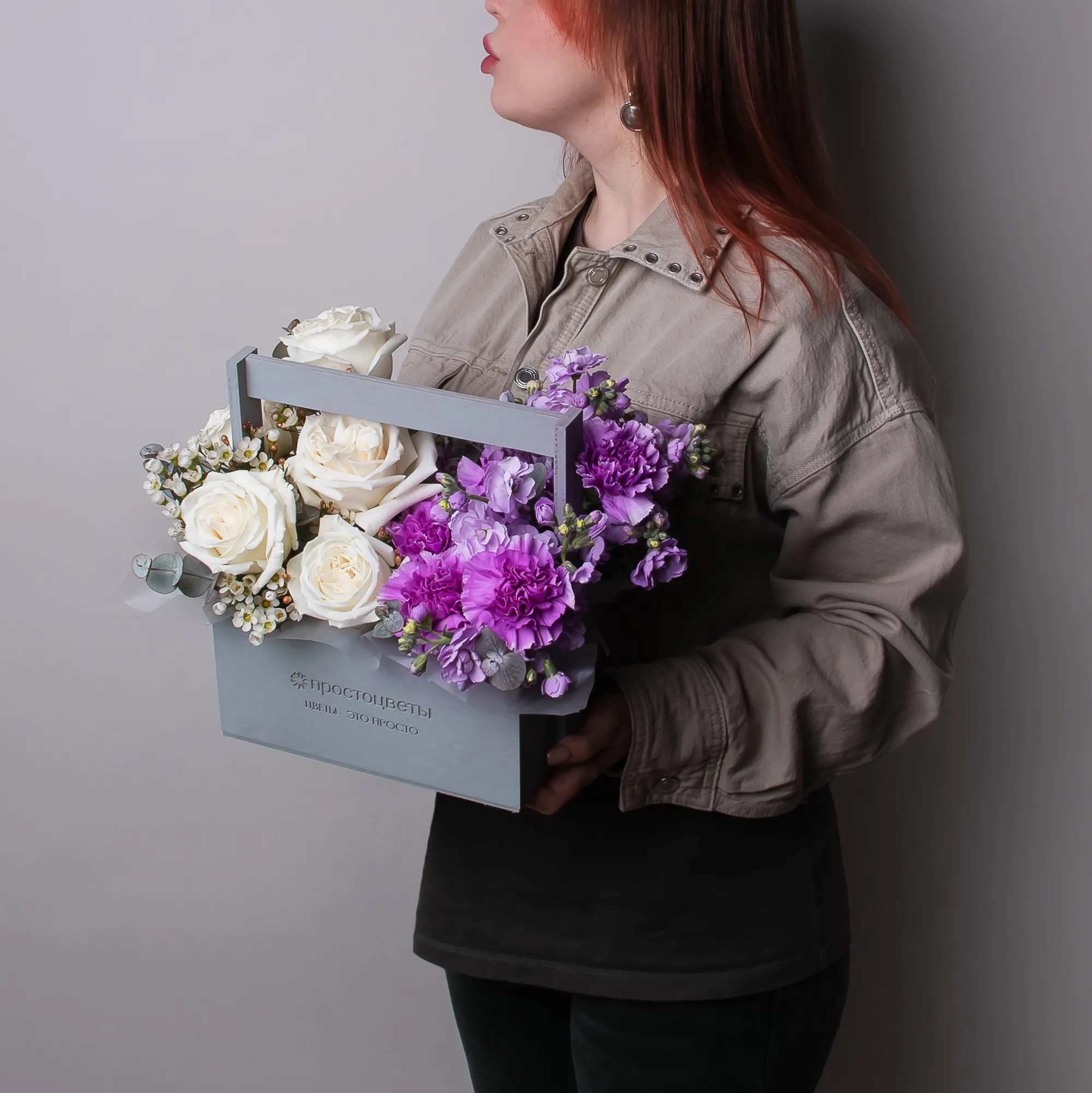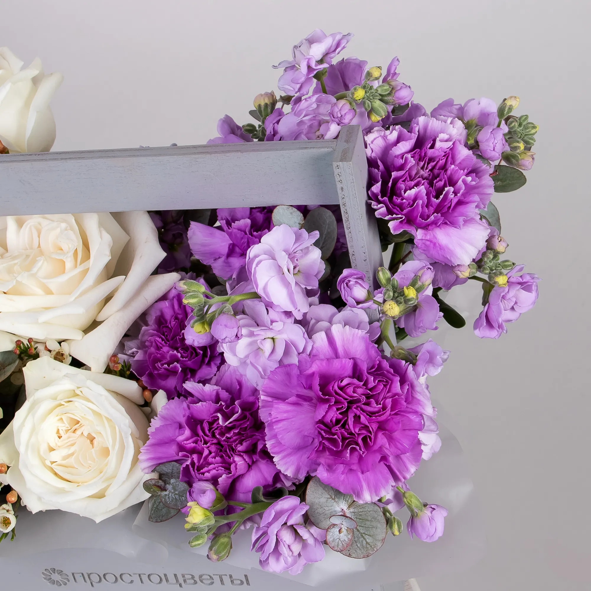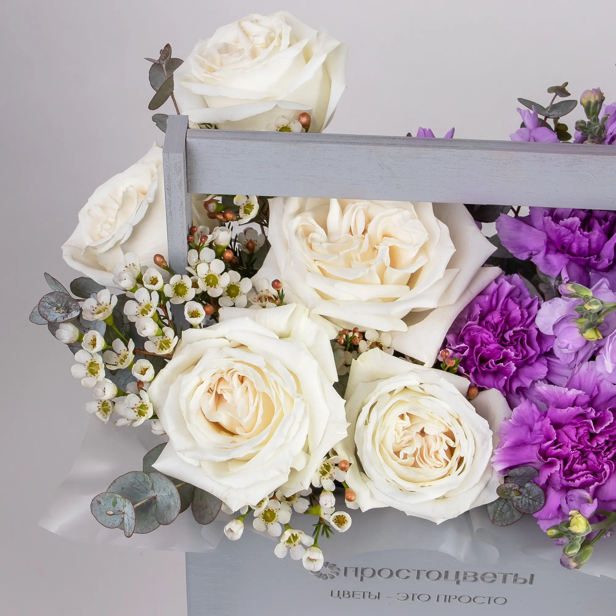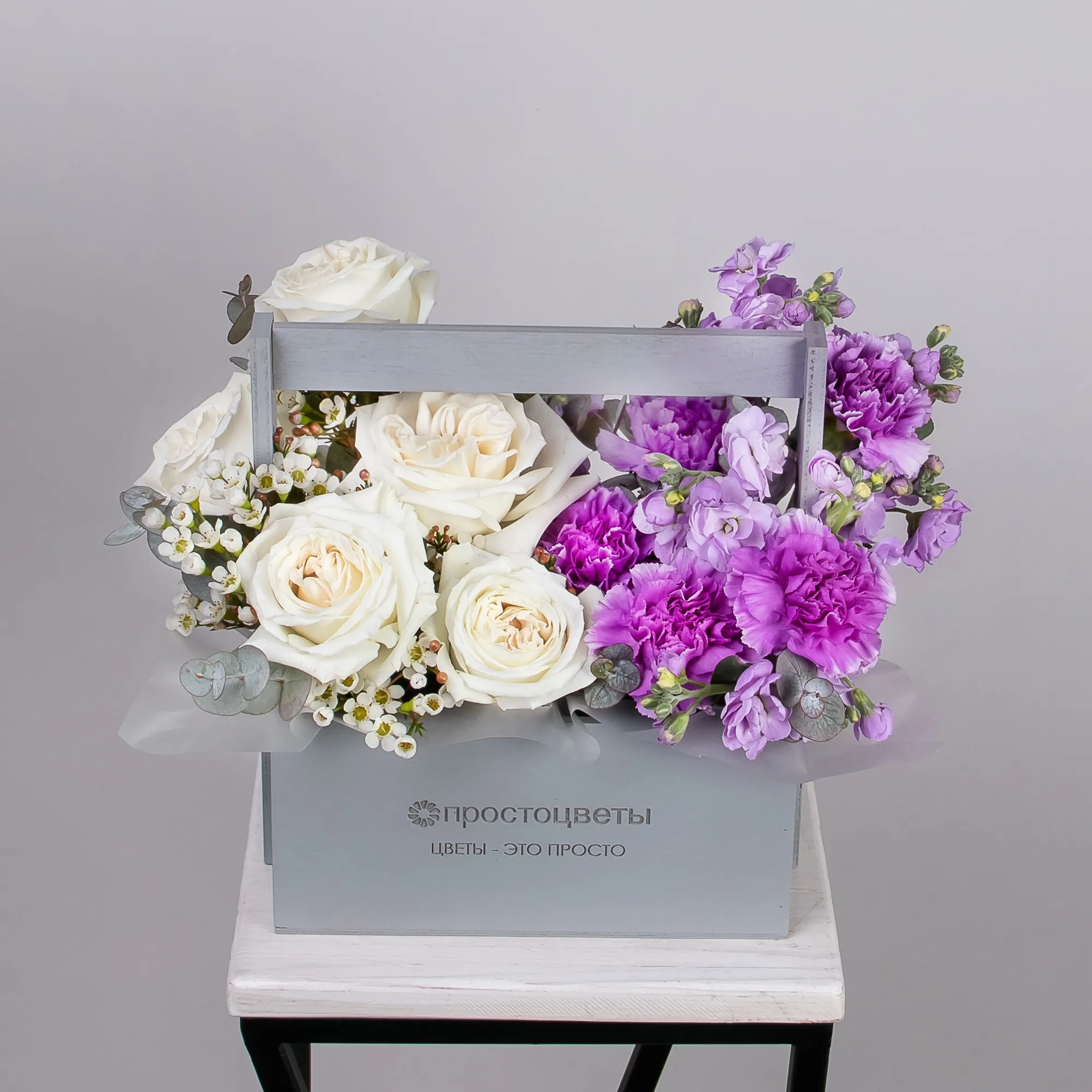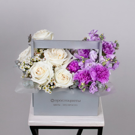 Композиция "Ящик №1" с белой розой, матиоллой и диантусом.