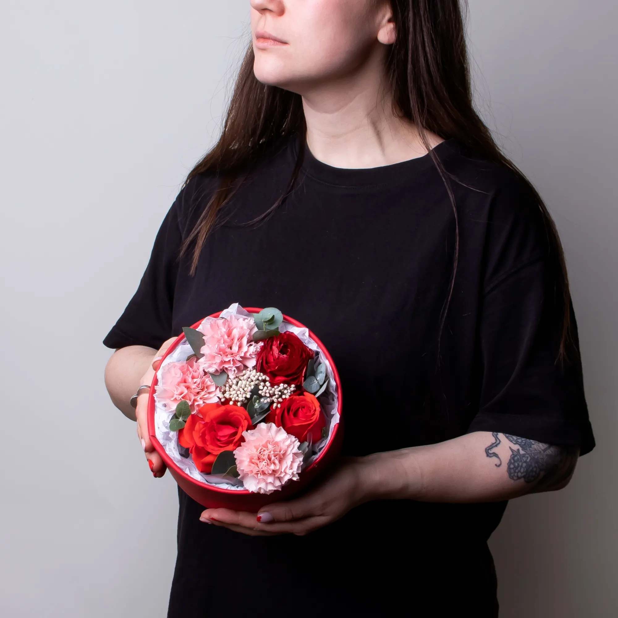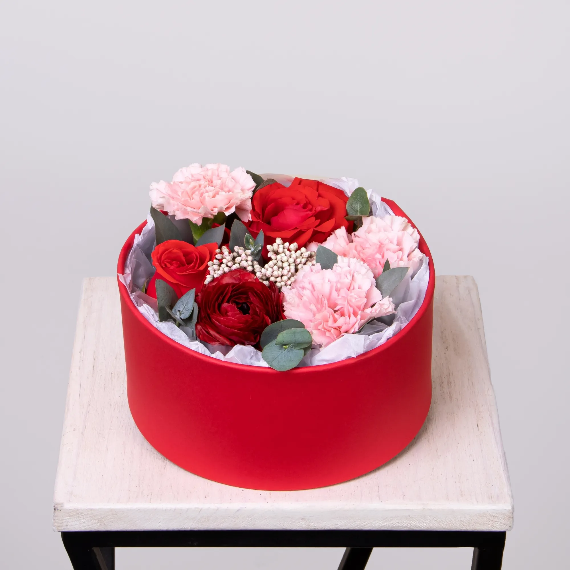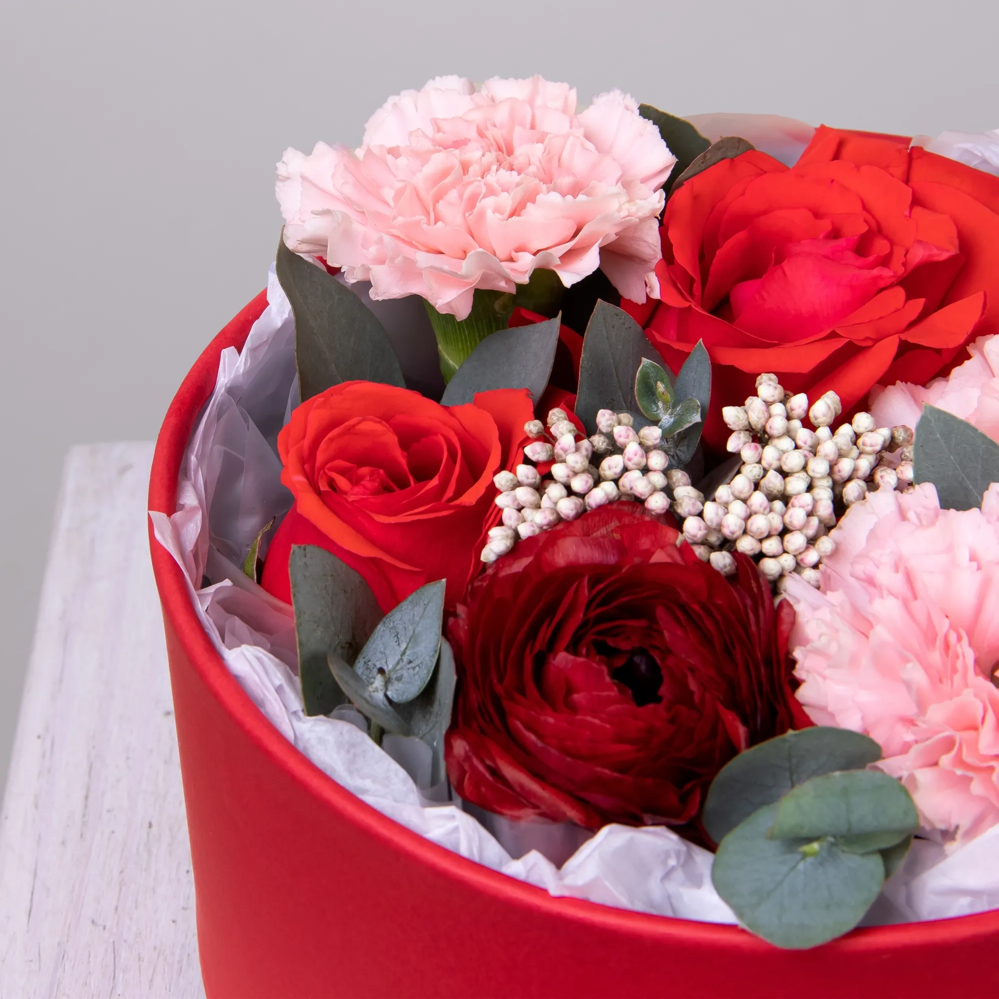 Яркая коробочка с цветами - вариант нетривиального эксклюзивного подарка. В составе ярко-алая роза сорта "Нина", красный ранункулюс, нежно-розовая гвоздика, розовый озатамнус и листья эвкалипта.