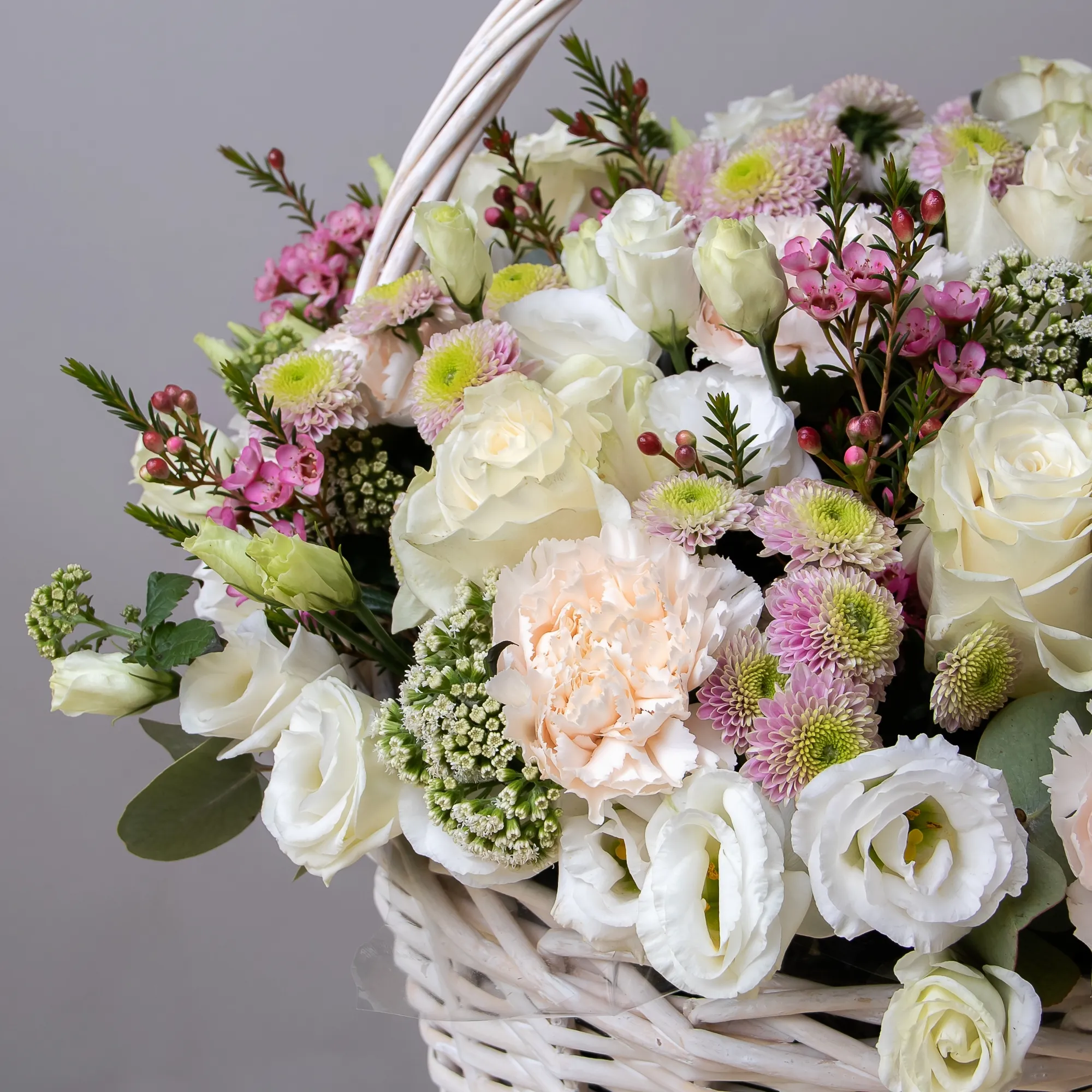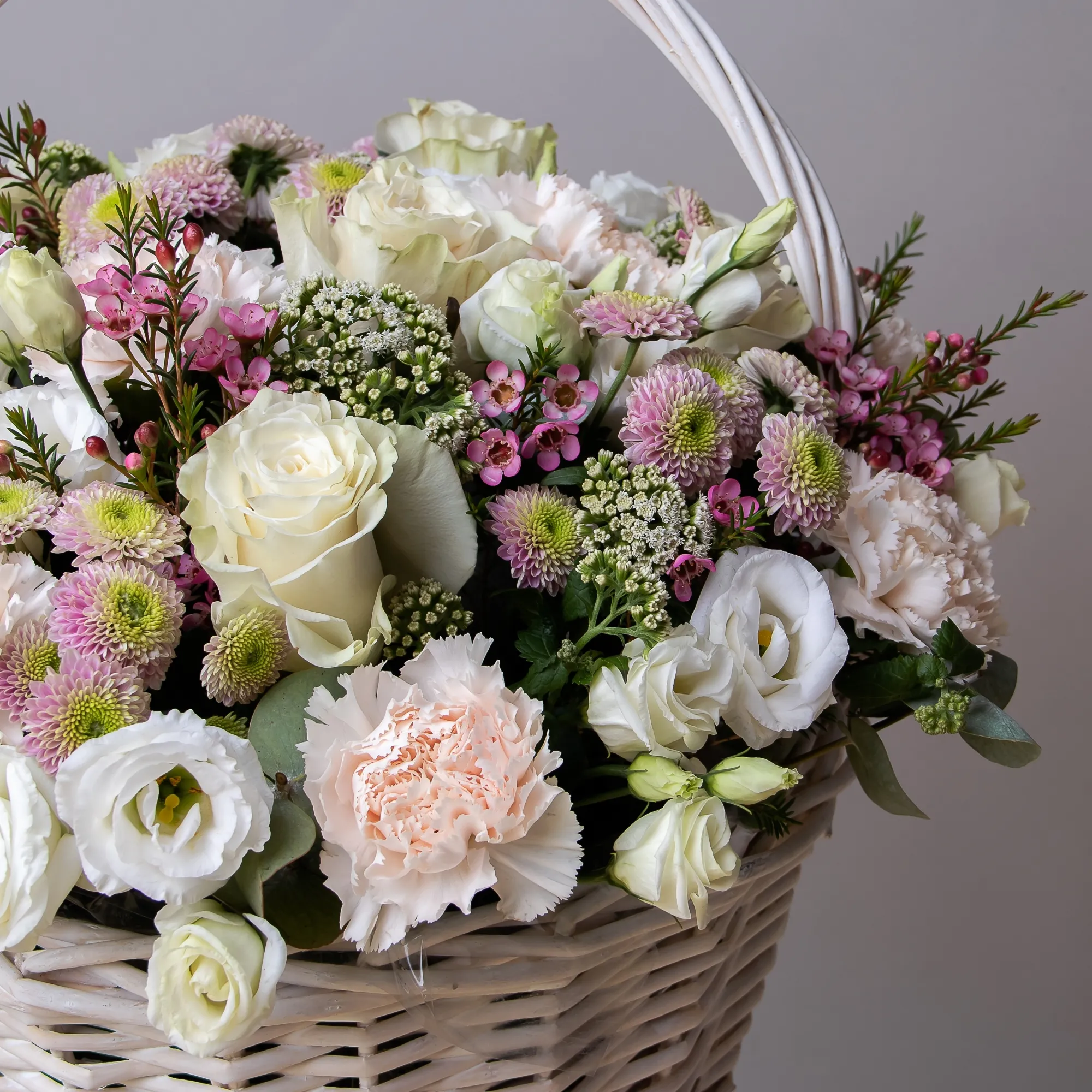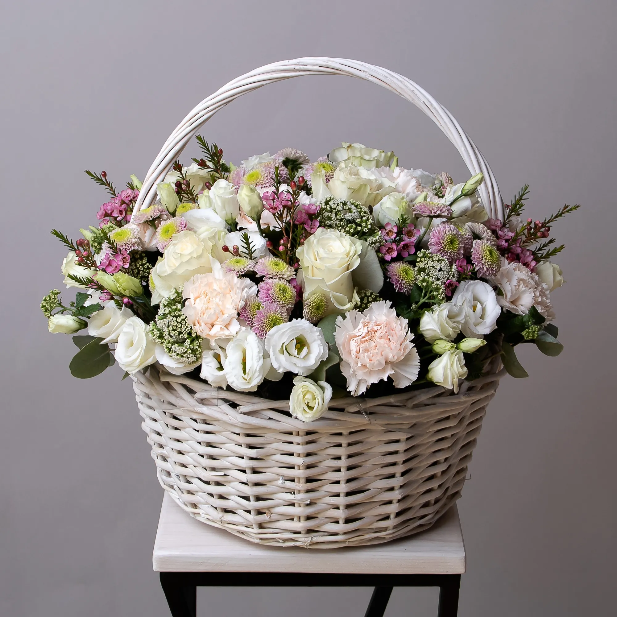 Гвоздика-9, Роза-7, Хризантема-5, Альстромерия-5, Листья эвкалипта-3