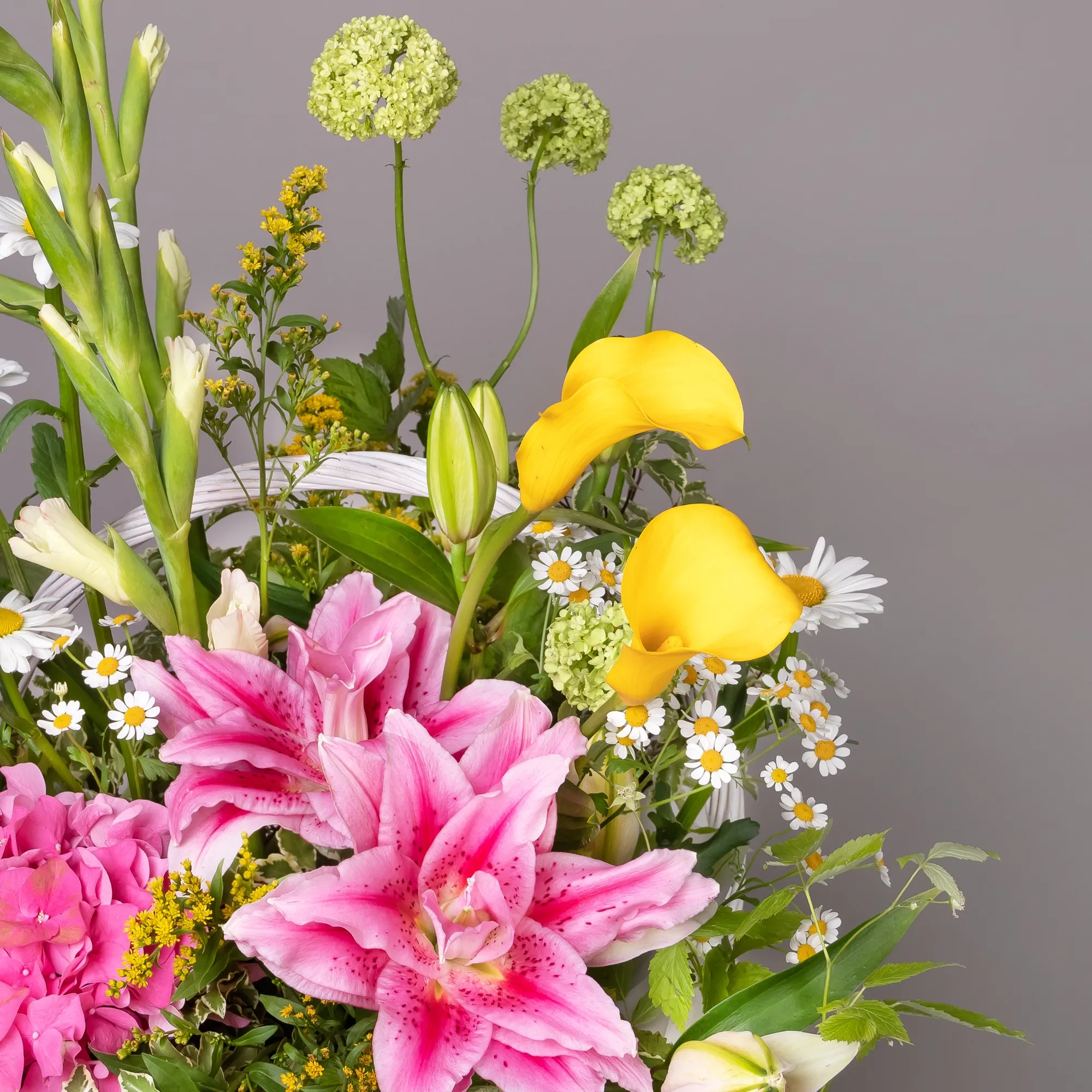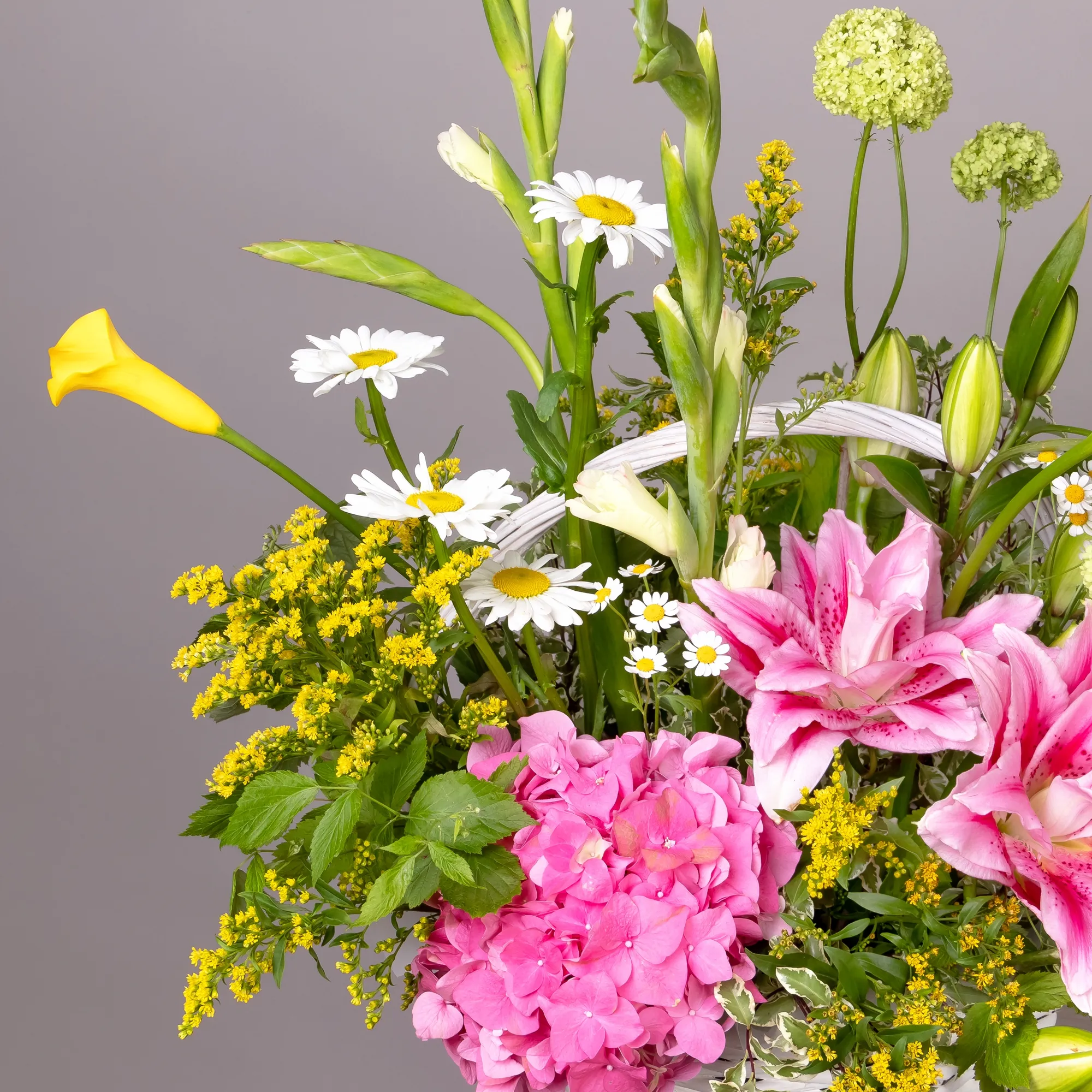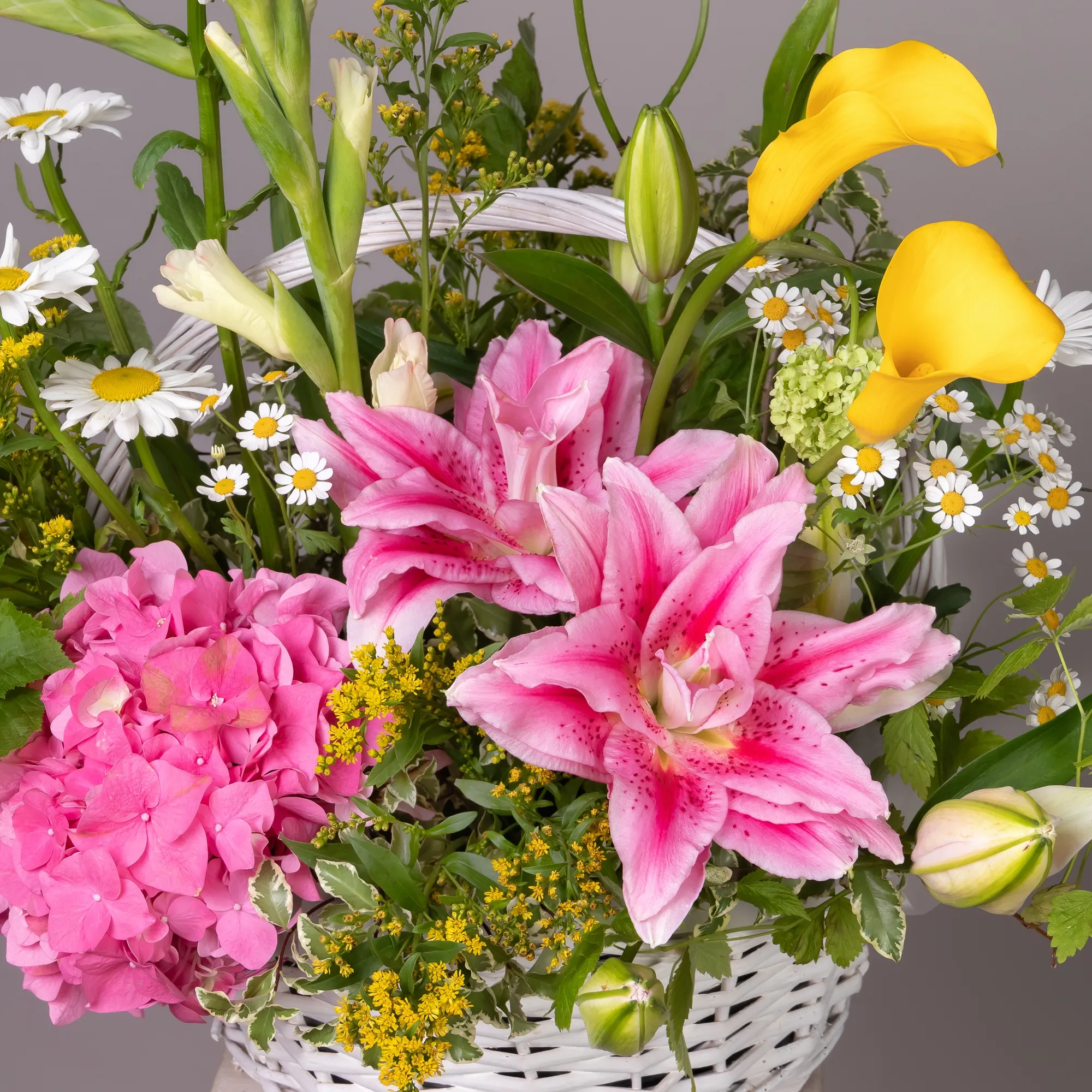 Гладиолус-2, Гортензия-1, Ромашка-6, Лилия-2, Калла-3, Солидаго-4, Ветки малины-2, Листья питтоспорум-4