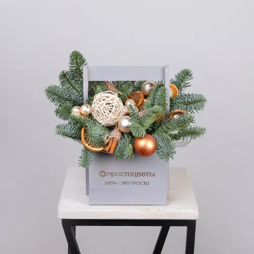 Композиция «Новогодний ящик №2» мини с нобилисом и ёлочными украшениями — это идеальное сочетание природных элементов и праздничного декора. В этой композиции нобилис, также известный как «рождественский куст», играет главную роль, придавая объём и пышность. Его хвойный аромат создаёт атмосферу праздника. Дополняют композицию ёлочные игрушки разных форм и размеров, которые украшают ветки нобилиса, добавляя ярких красок и праздничного настроения.