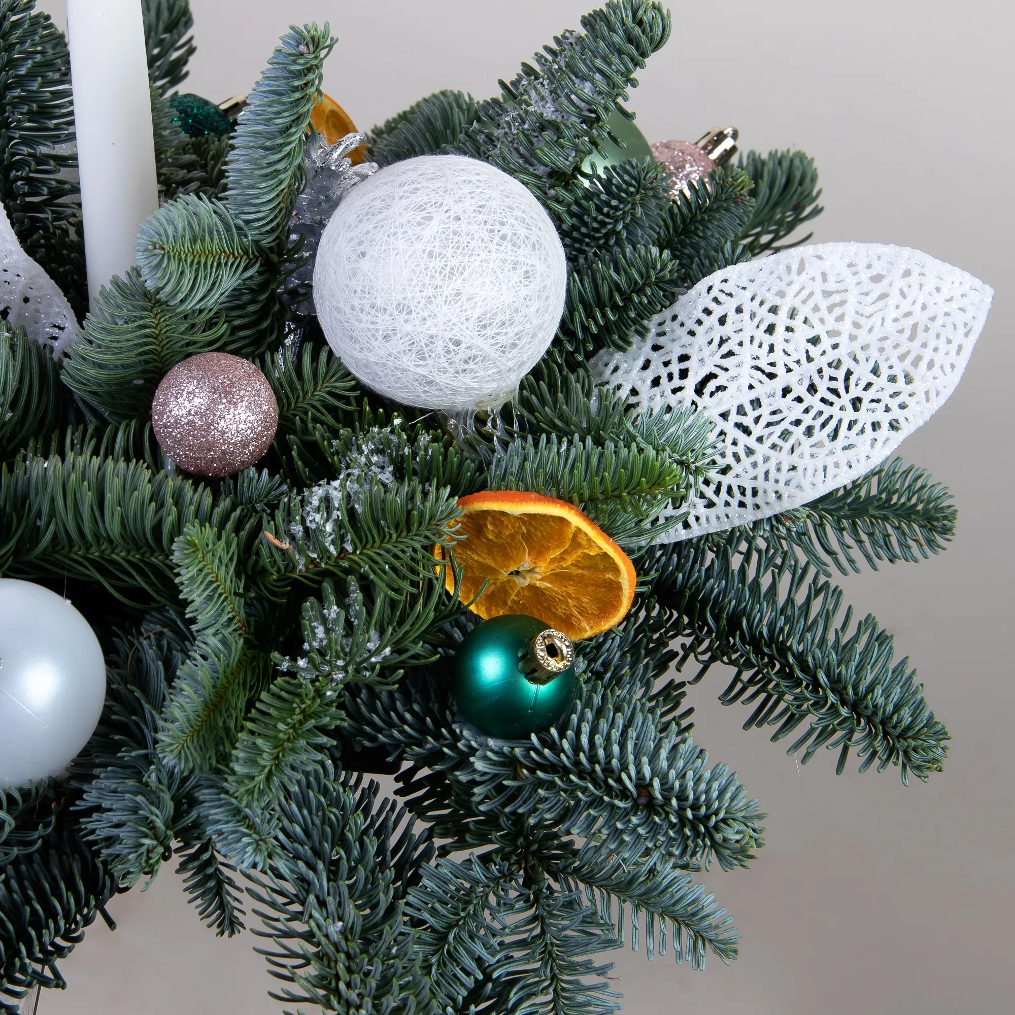 Композиция «Новогодняя со свечой Белая L» создана из живых ветвей датской пихты сорта нобилис.