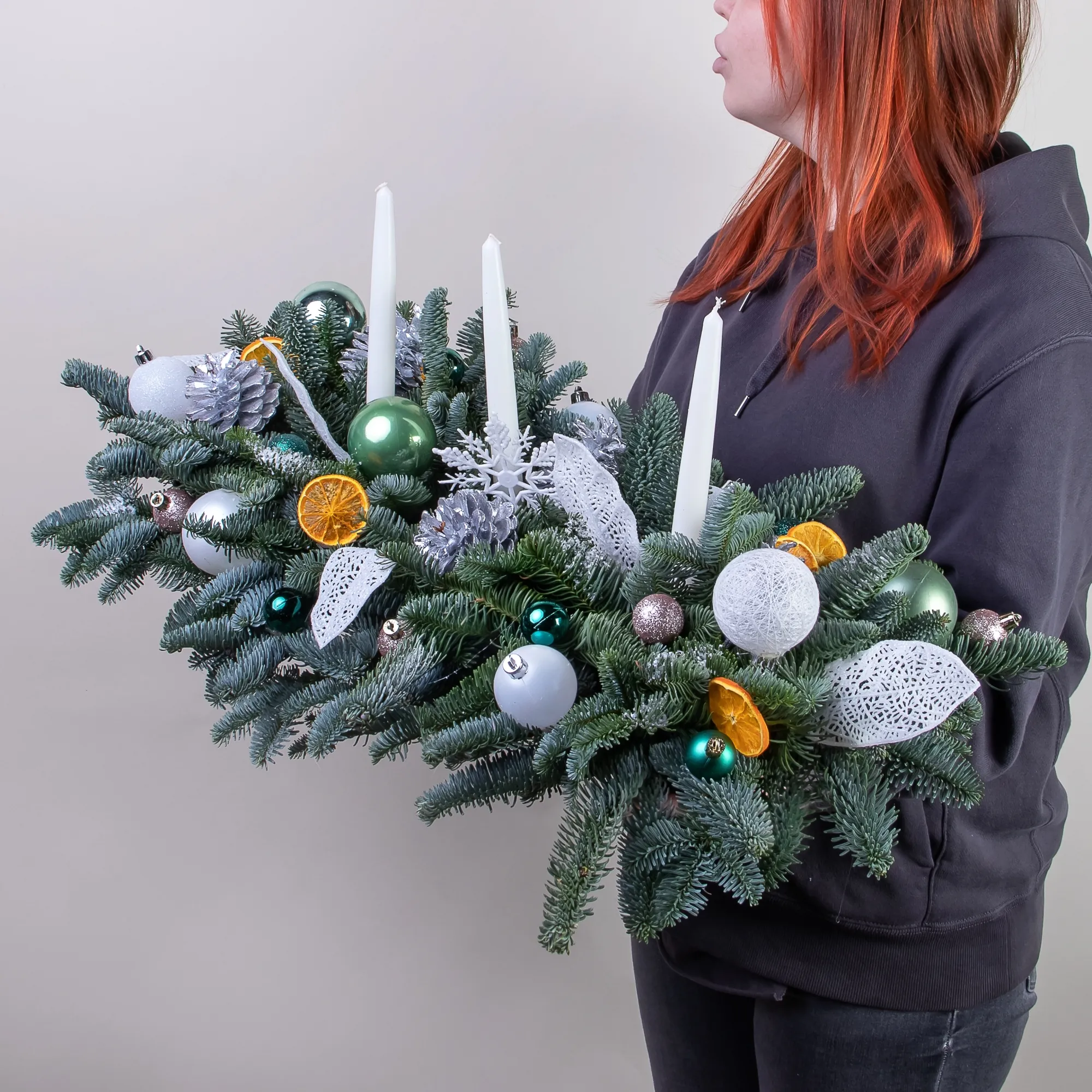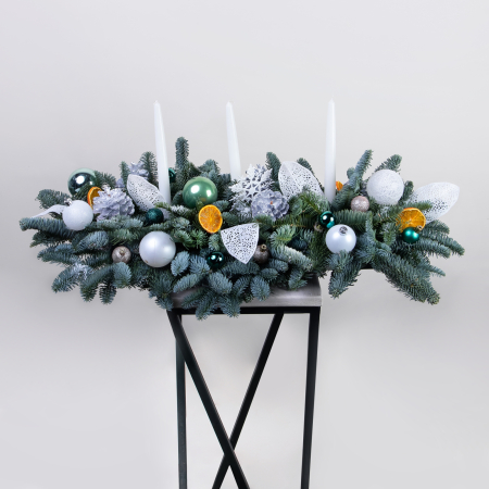 В центре композиции расположена белая свеча, которая символизирует любовь и счастье. Вокруг свечи размещены пышные ветки нобилиса, покрытые мягкими игольчатыми листьями сине-зелёного цвета. Хвоя сохраняет свою свежесть и красоту на протяжении всего периода использования композиции, создавая ощущение свежести и чистоты.