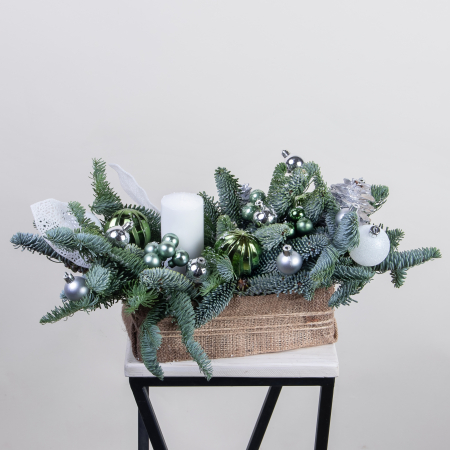 В центре композиции расположена белая свеча, которая символизирует любовь и счастье. Вокруг свечи размещены пышные ветки нобилиса, покрытые мягкими игольчатыми листьями сине-зелёного цвета. Хвоя сохраняет свою свежесть и красоту на протяжении всего периода использования композиции, создавая ощущение свежести и чистоты.