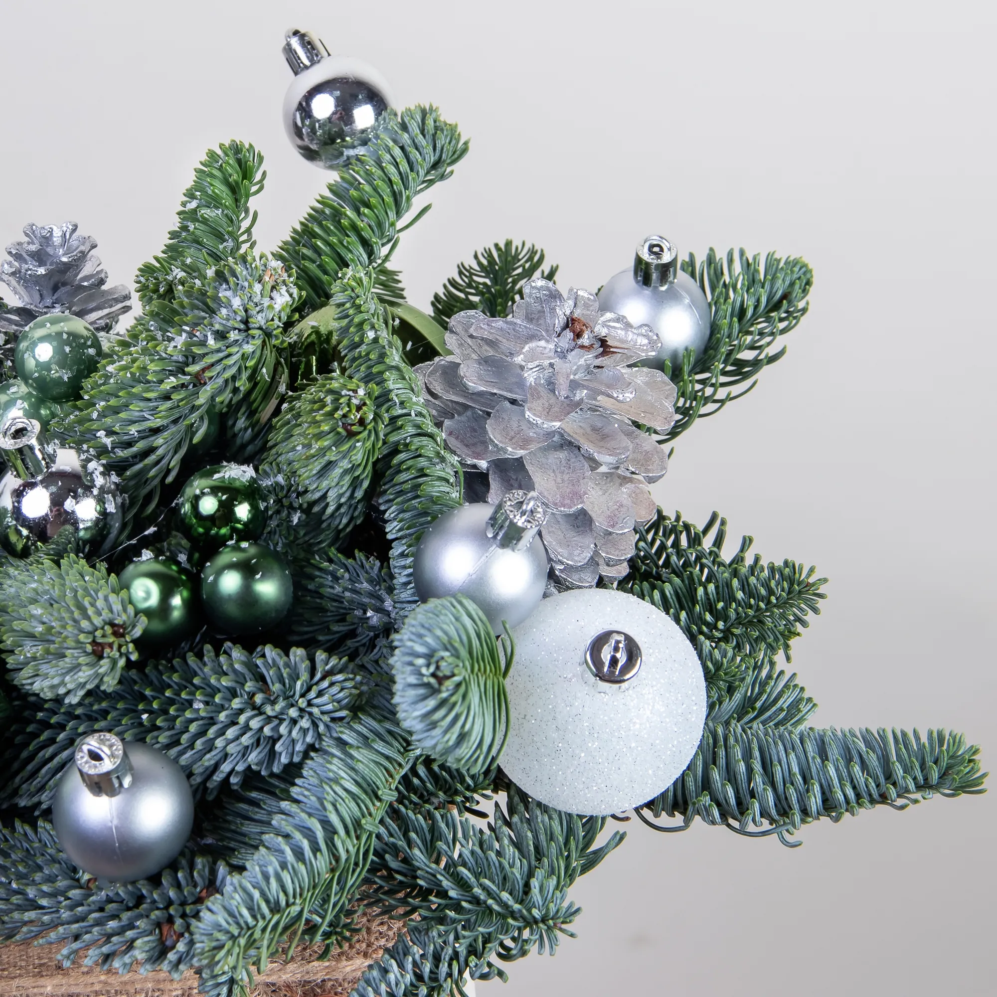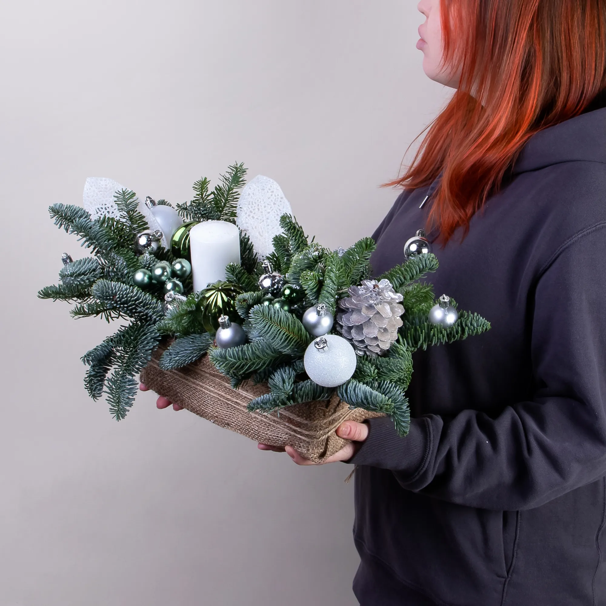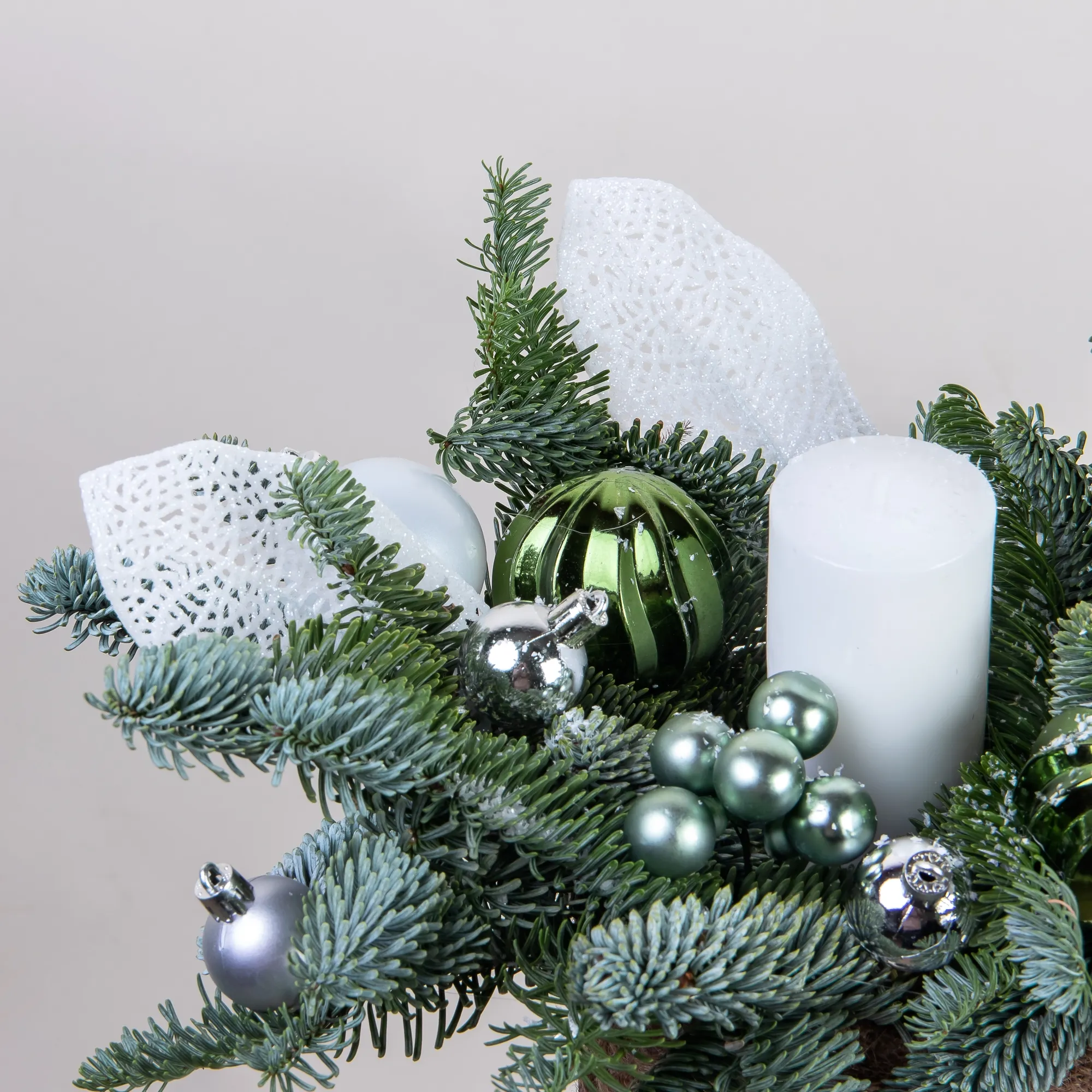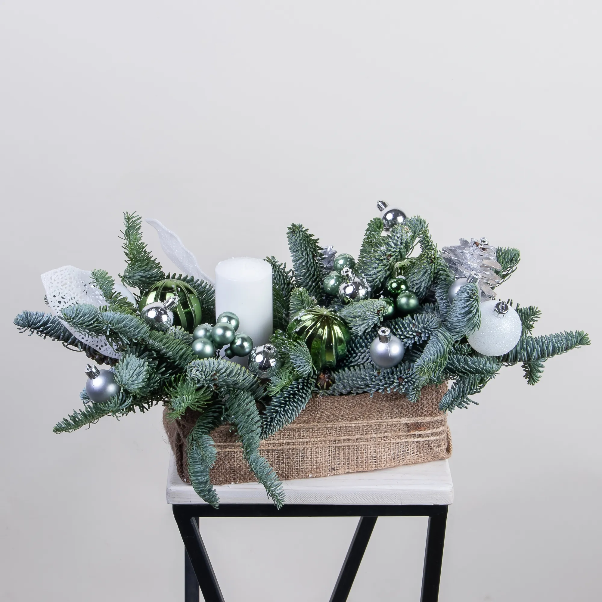 Композиция «Новогодняя со свечой Белая М» создана из живых ветвей датской пихты сорта нобилис.