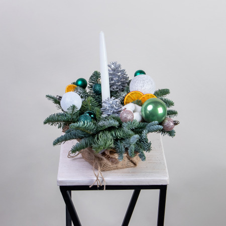 В центре композиции расположена белая свеча, которая символизирует любовь и счастье. Вокруг свечи размещены пышные ветки нобилиса, покрытые мягкими игольчатыми листьями сине-зелёного цвета. Хвоя сохраняет свою свежесть и красоту на протяжении всего периода использования композиции, создавая ощущение свежести и чистоты.