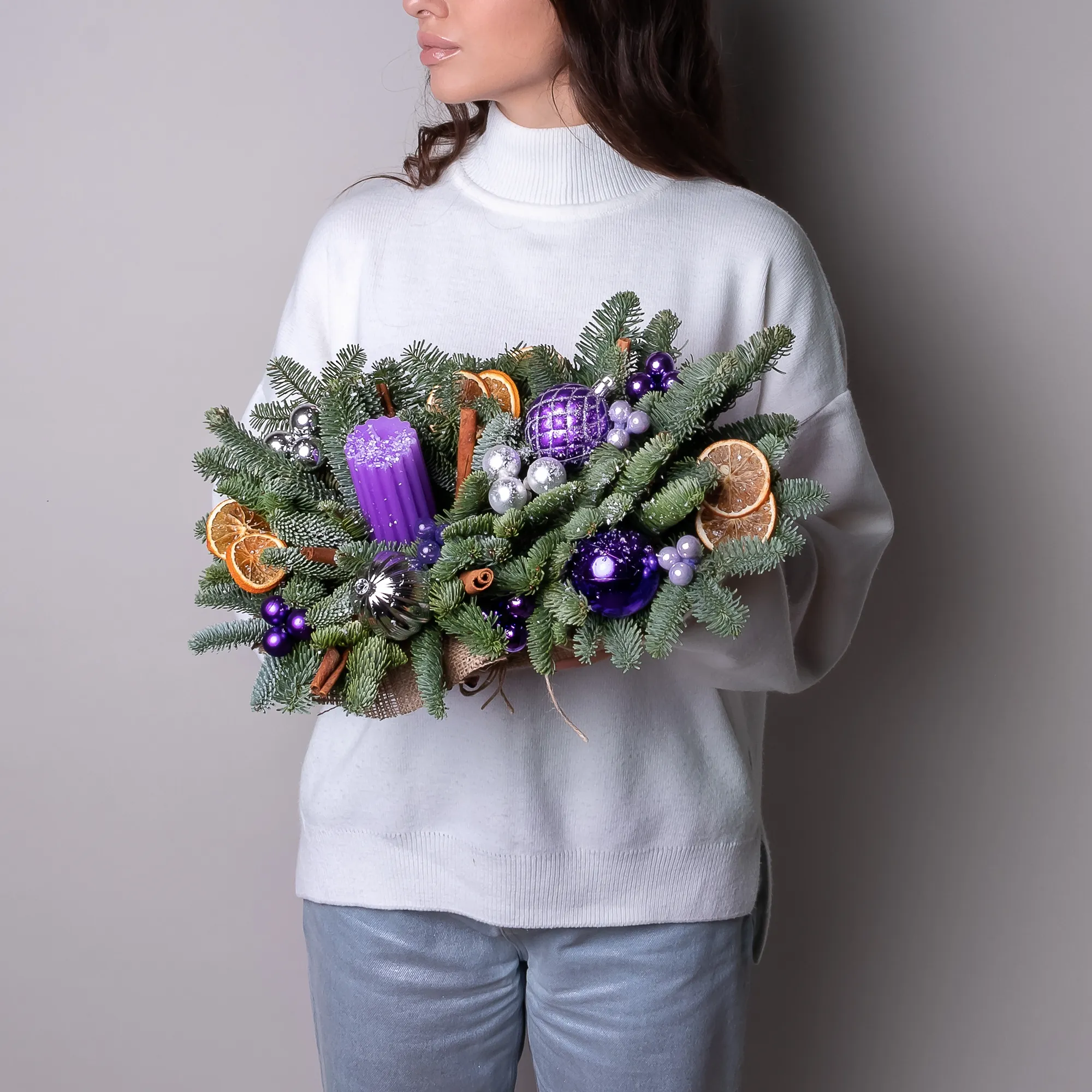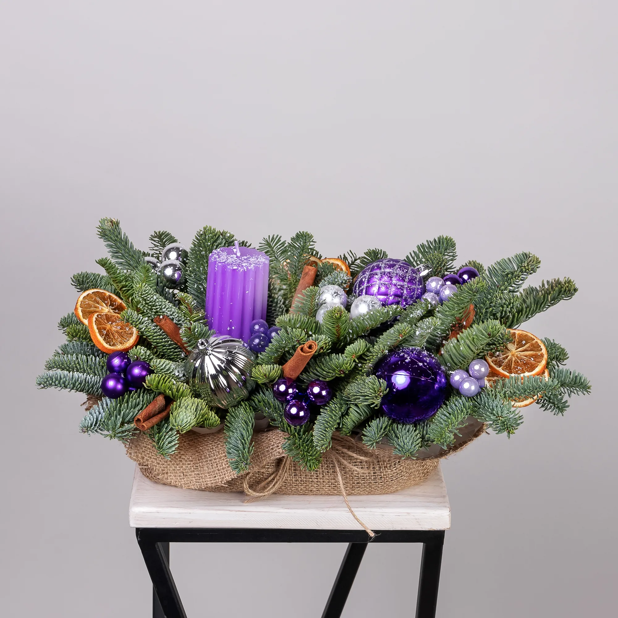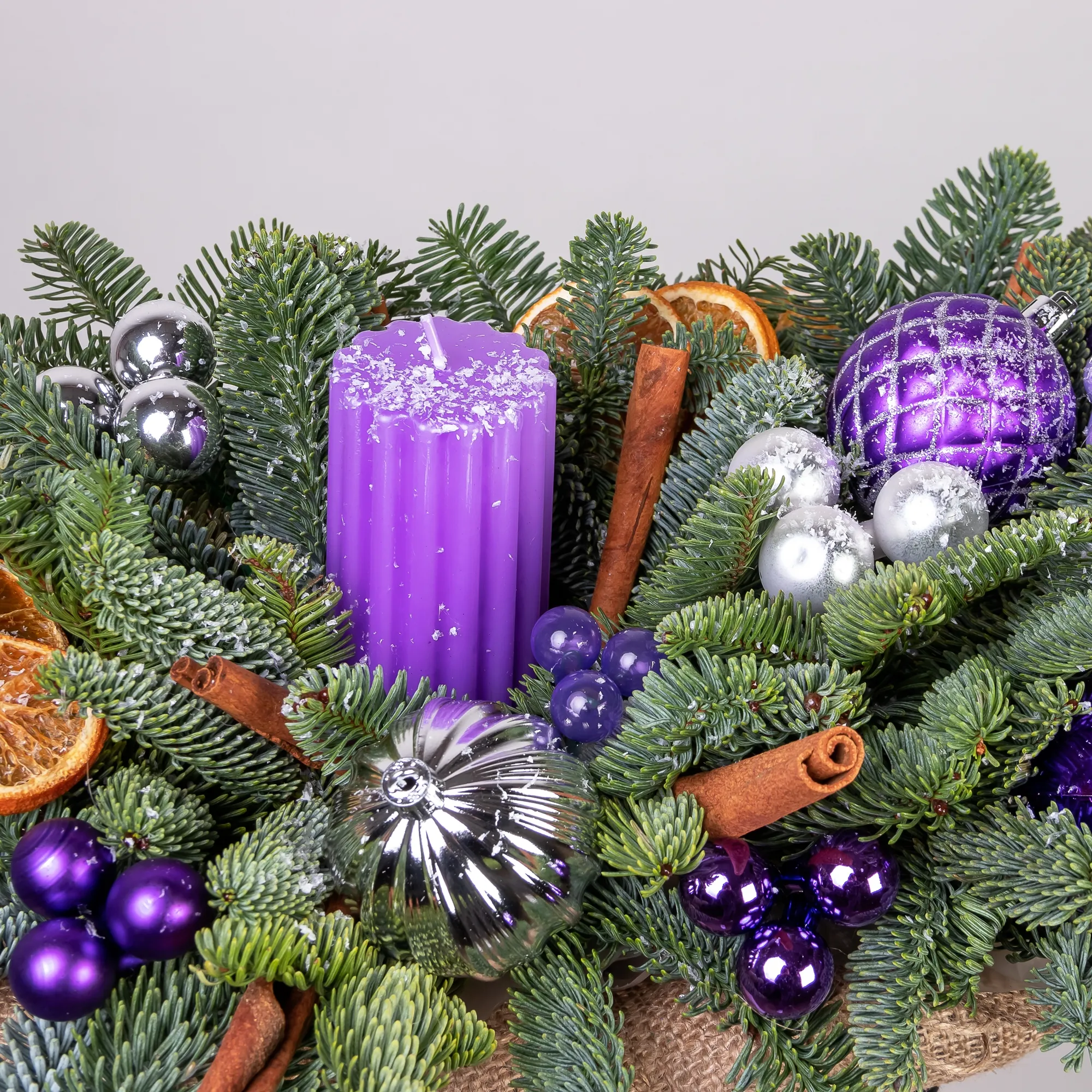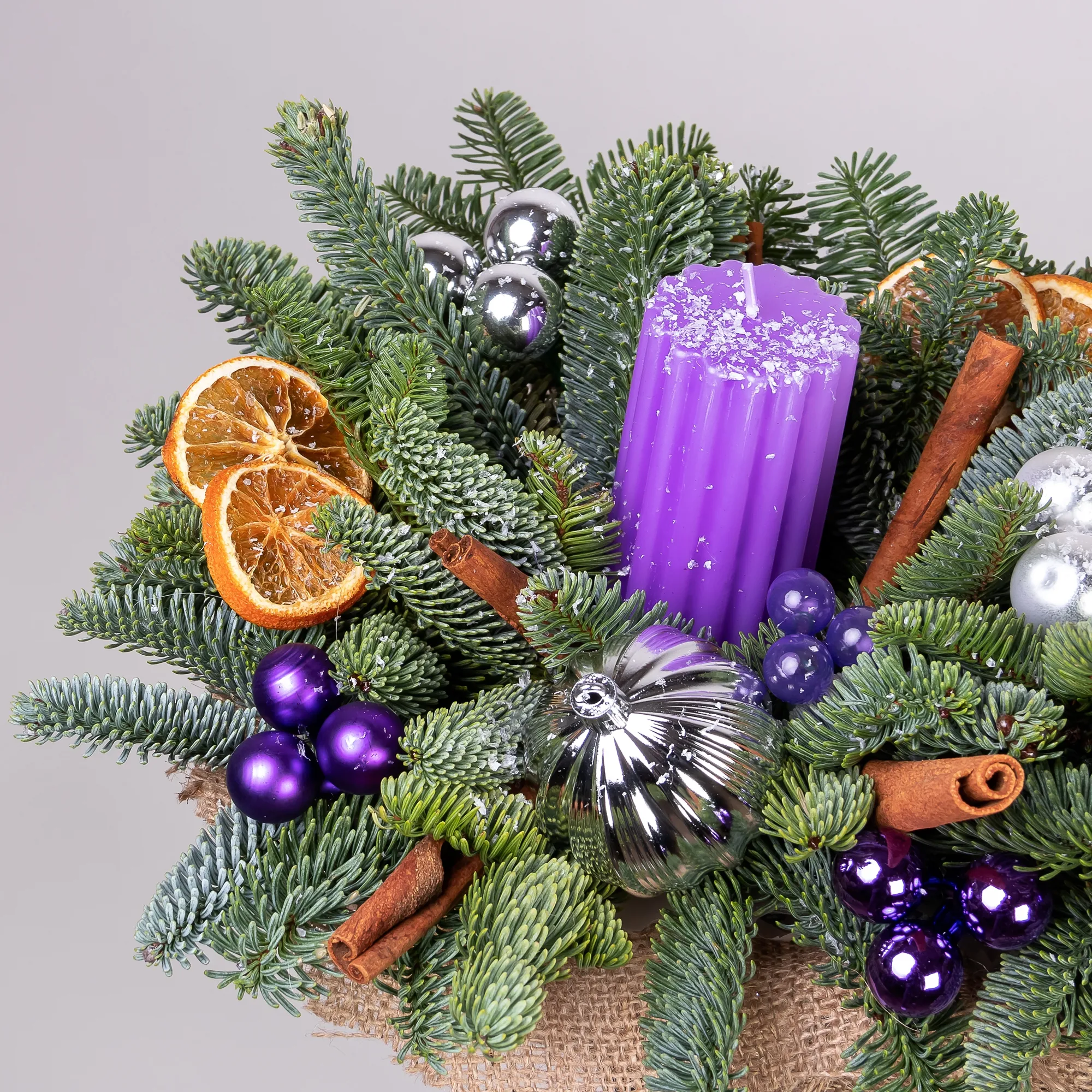 Композиция «Новогодняя со свечой Фиолетовая M» создана из живых ветвей датской пихты сорта нобилис.