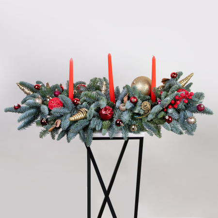 В центре композиции расположена красная свеча, которая символизирует любовь и счастье. Вокруг свечи размещены пышные ветки нобилиса, покрытые мягкими игольчатыми листьями сине-зелёного цвета. Хвоя сохраняет свою свежесть и красоту на протяжении всего периода использования композиции, создавая ощущение свежести и чистоты.