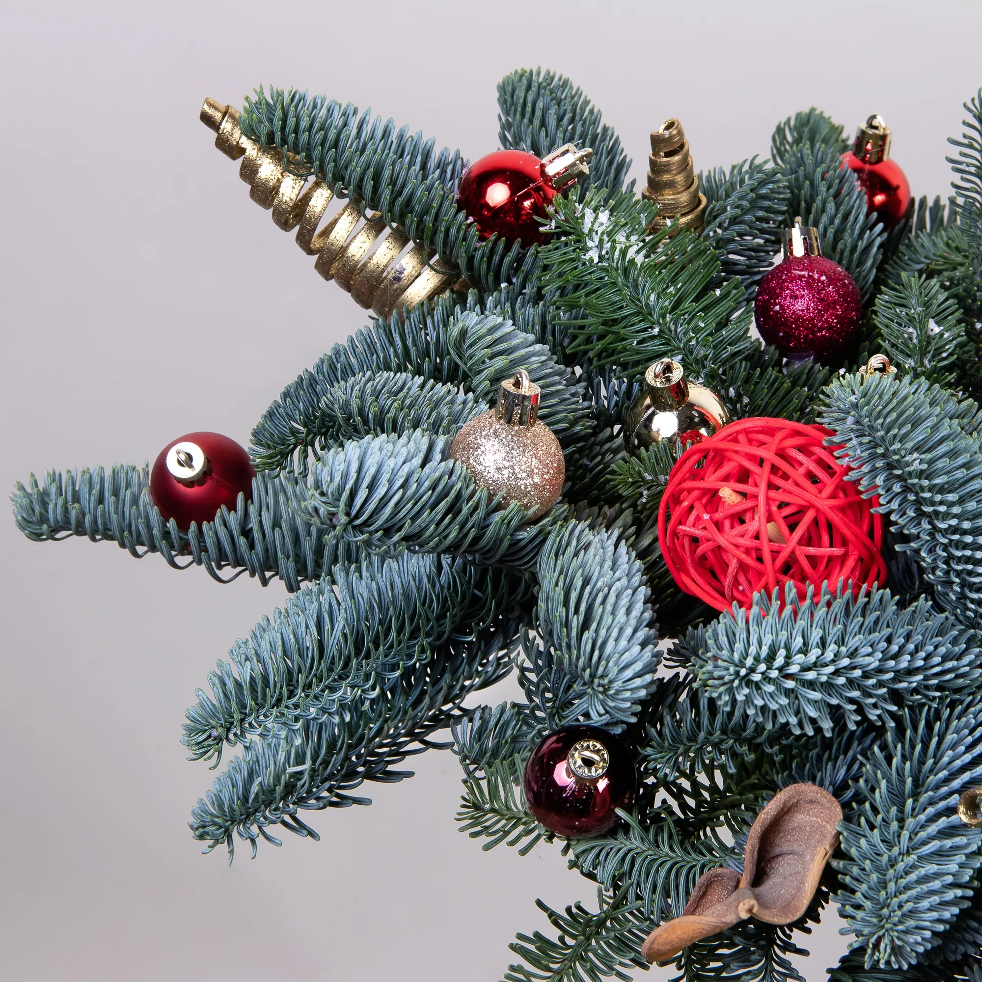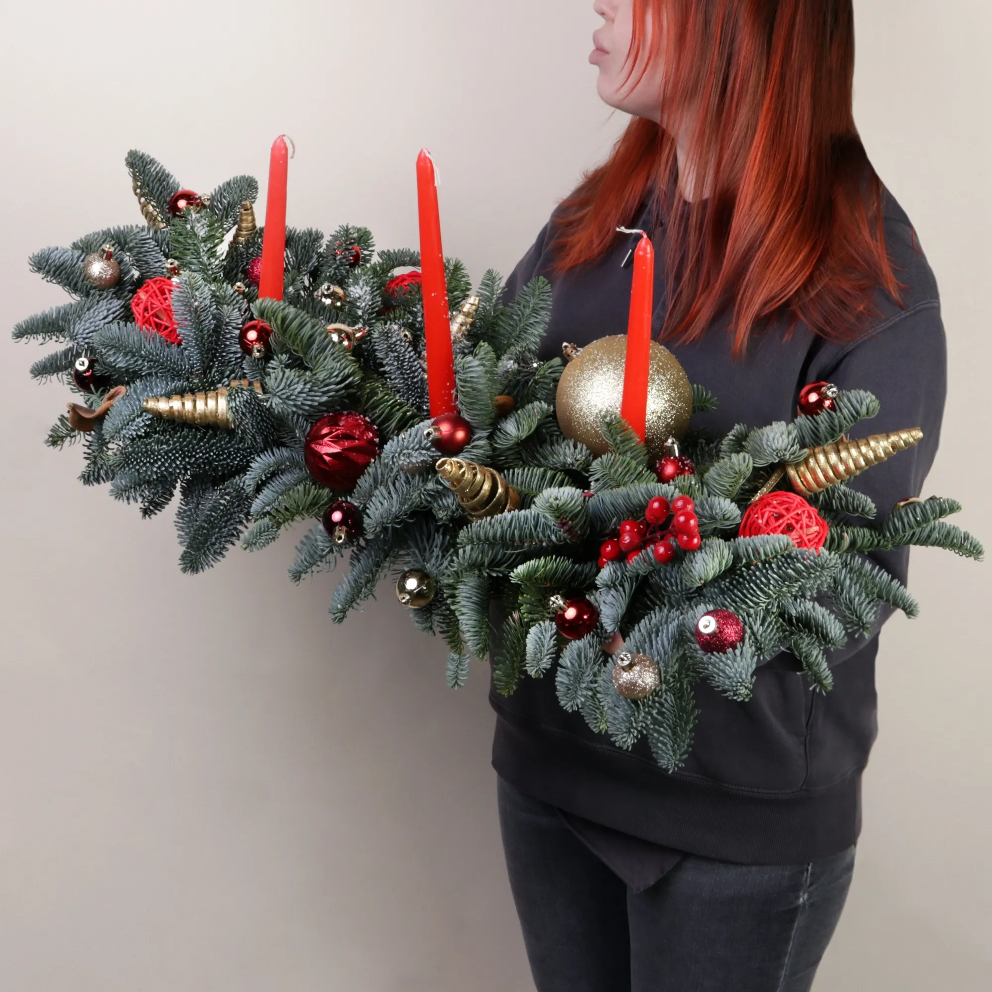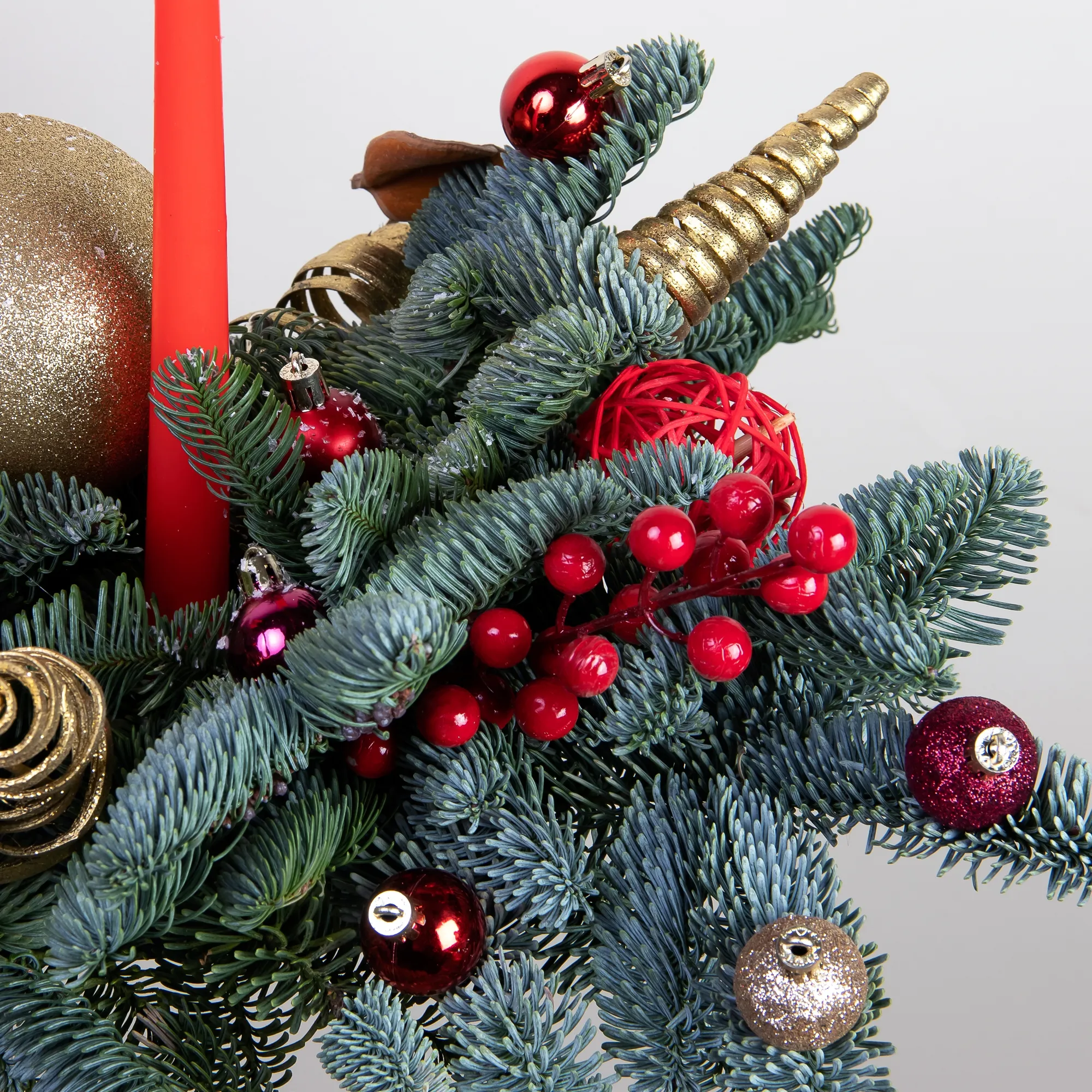 Композиция «Новогодняя со свечой Красная L» создана из живых ветвей датской пихты сорта нобилис.