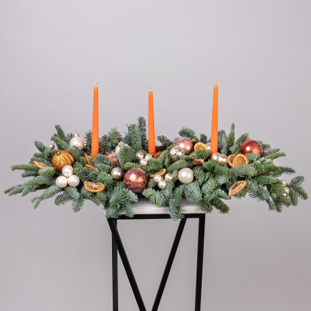 В центре композиции расположена оранжевая свеча, которая символизирует любовь и счастье. Вокруг свечи размещены пышные ветки нобилиса, покрытые мягкими игольчатыми листьями сине-зелёного цвета. Хвоя сохраняет свою свежесть и красоту на протяжении всего периода использования композиции, создавая ощущение свежести и чистоты.