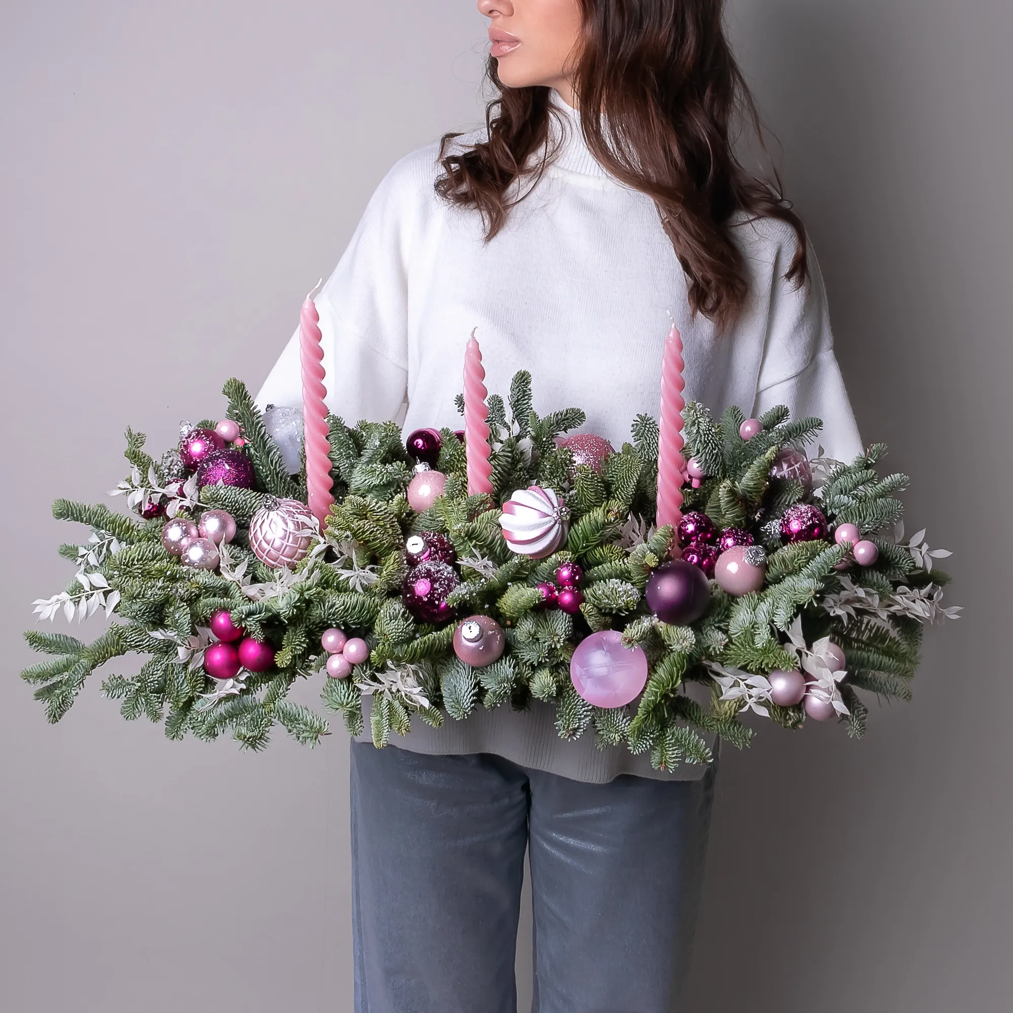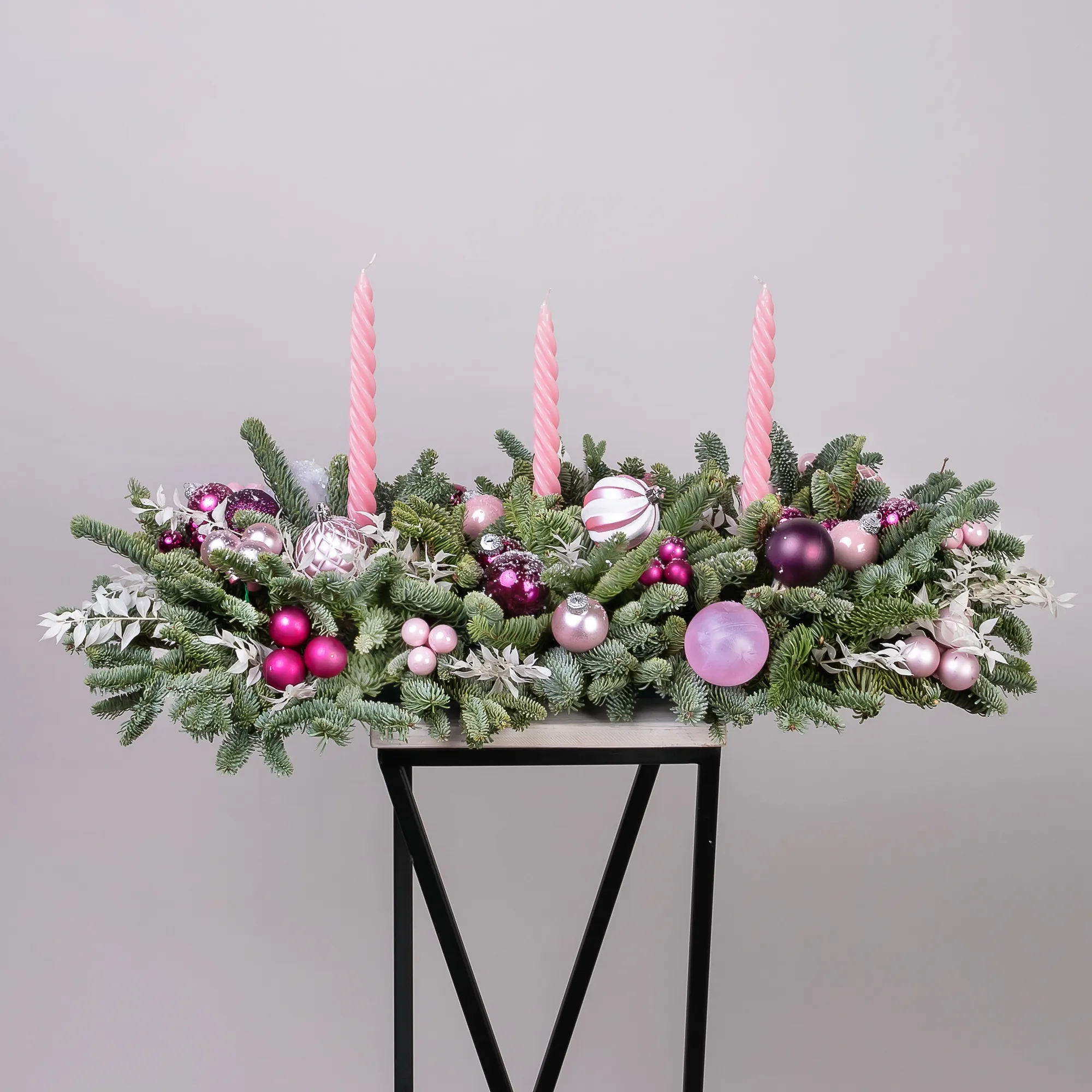 В центре композиции расположена розовая свеча, которая символизирует любовь и счастье. Вокруг свечи размещены пышные ветки нобилиса, покрытые мягкими игольчатыми листьями сине-зелёного цвета. Хвоя сохраняет свою свежесть и красоту на протяжении всего периода использования композиции, создавая ощущение свежести и чистоты.