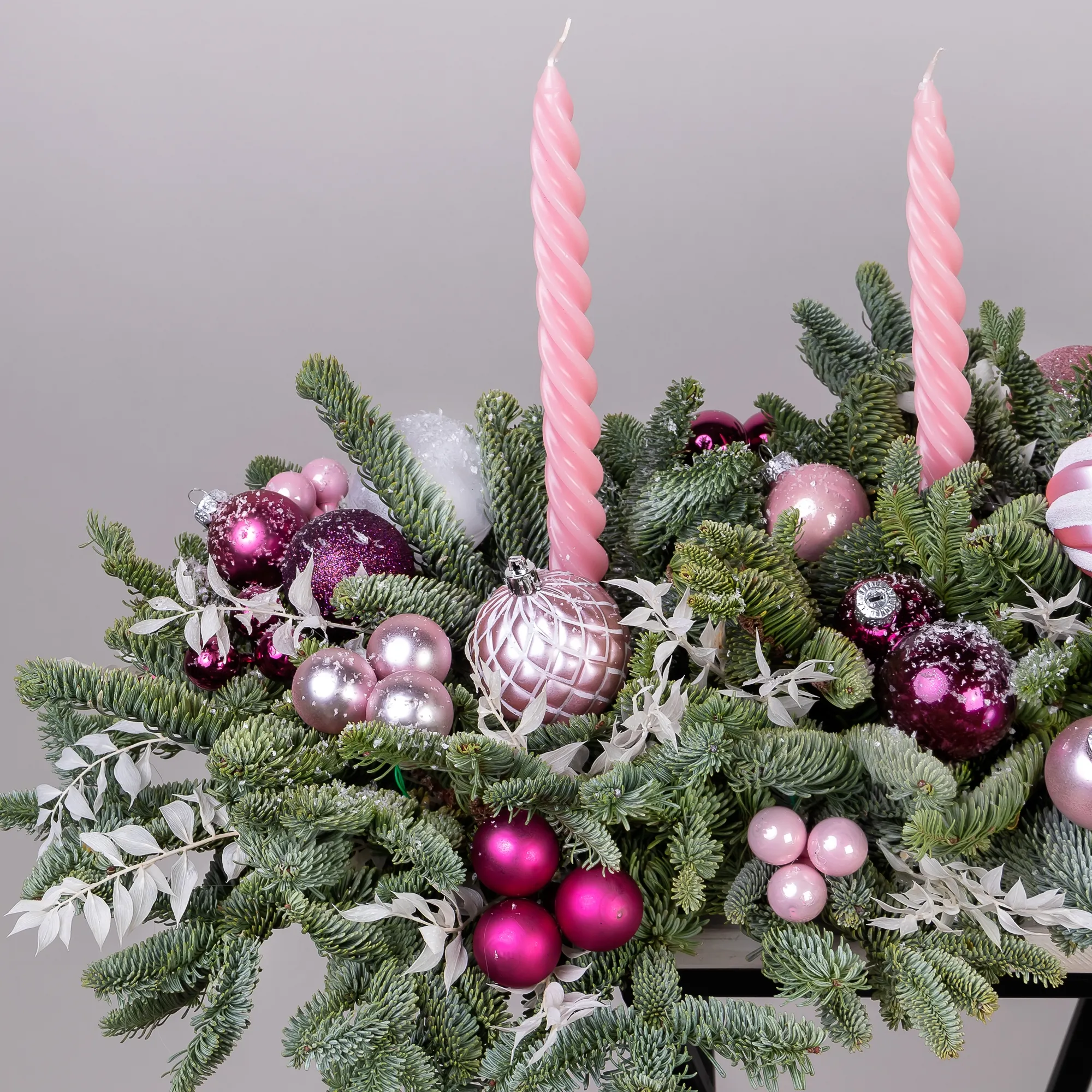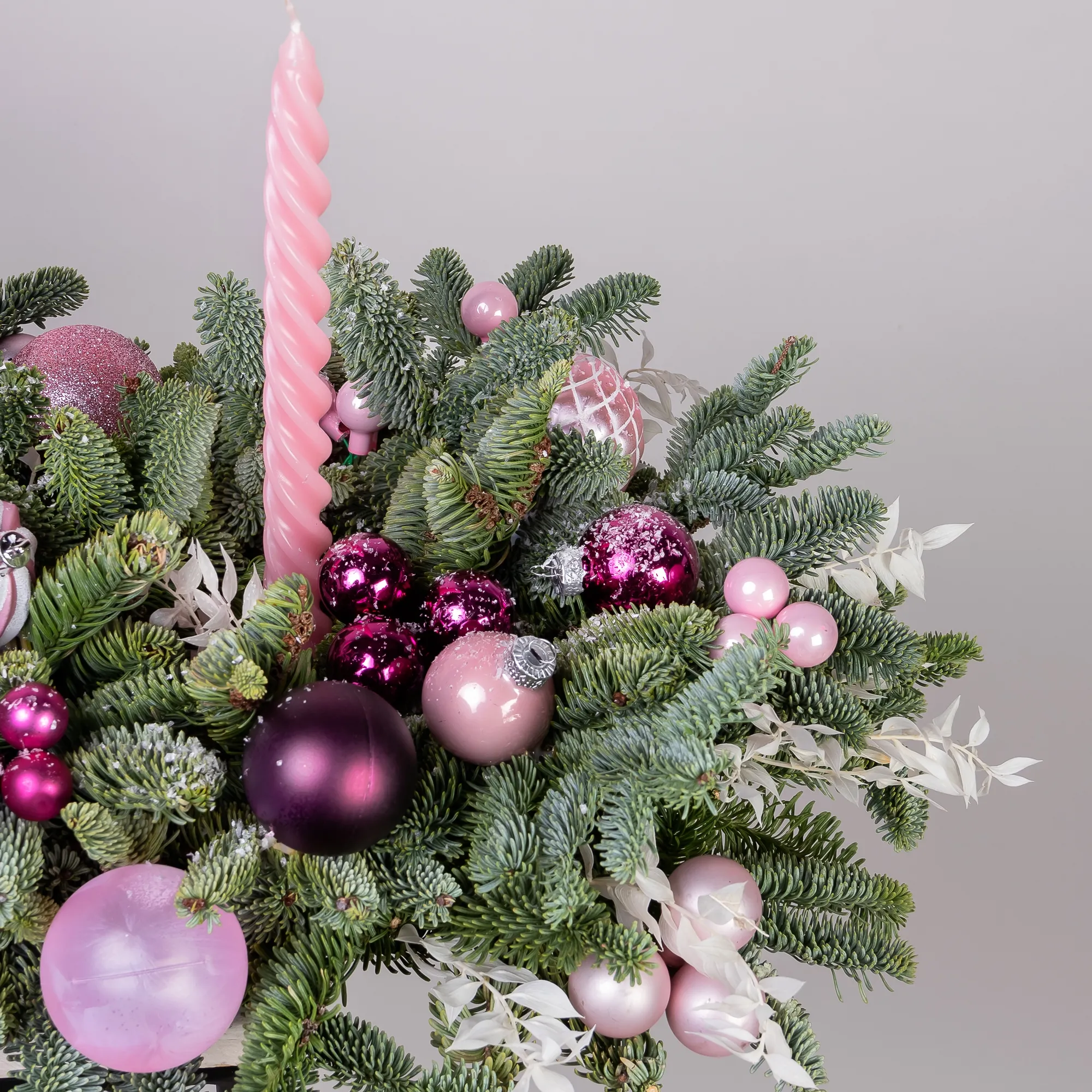 Композиция «Новогодняя со свечой Розовая L» создана из живых ветвей датской пихты сорта нобилис.
