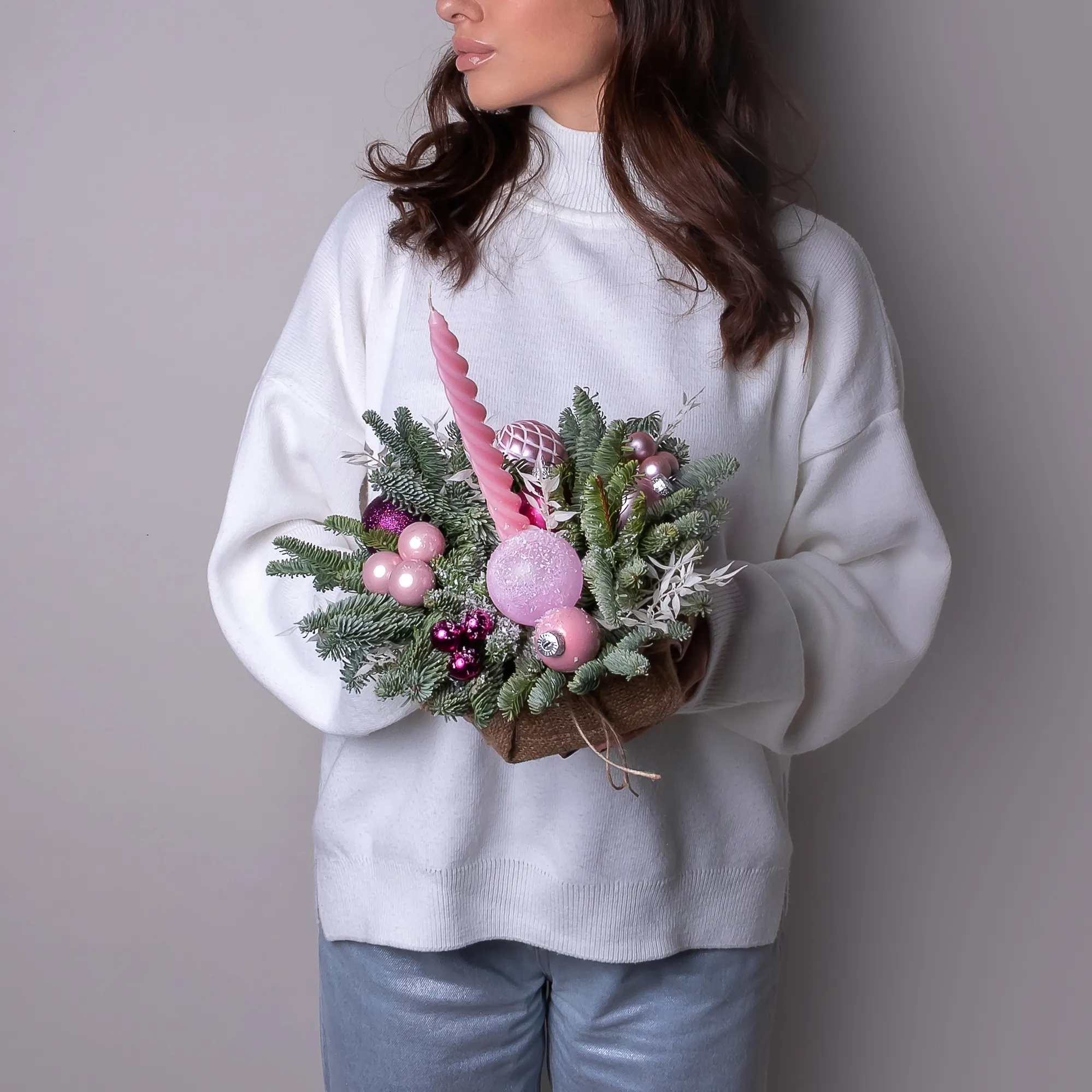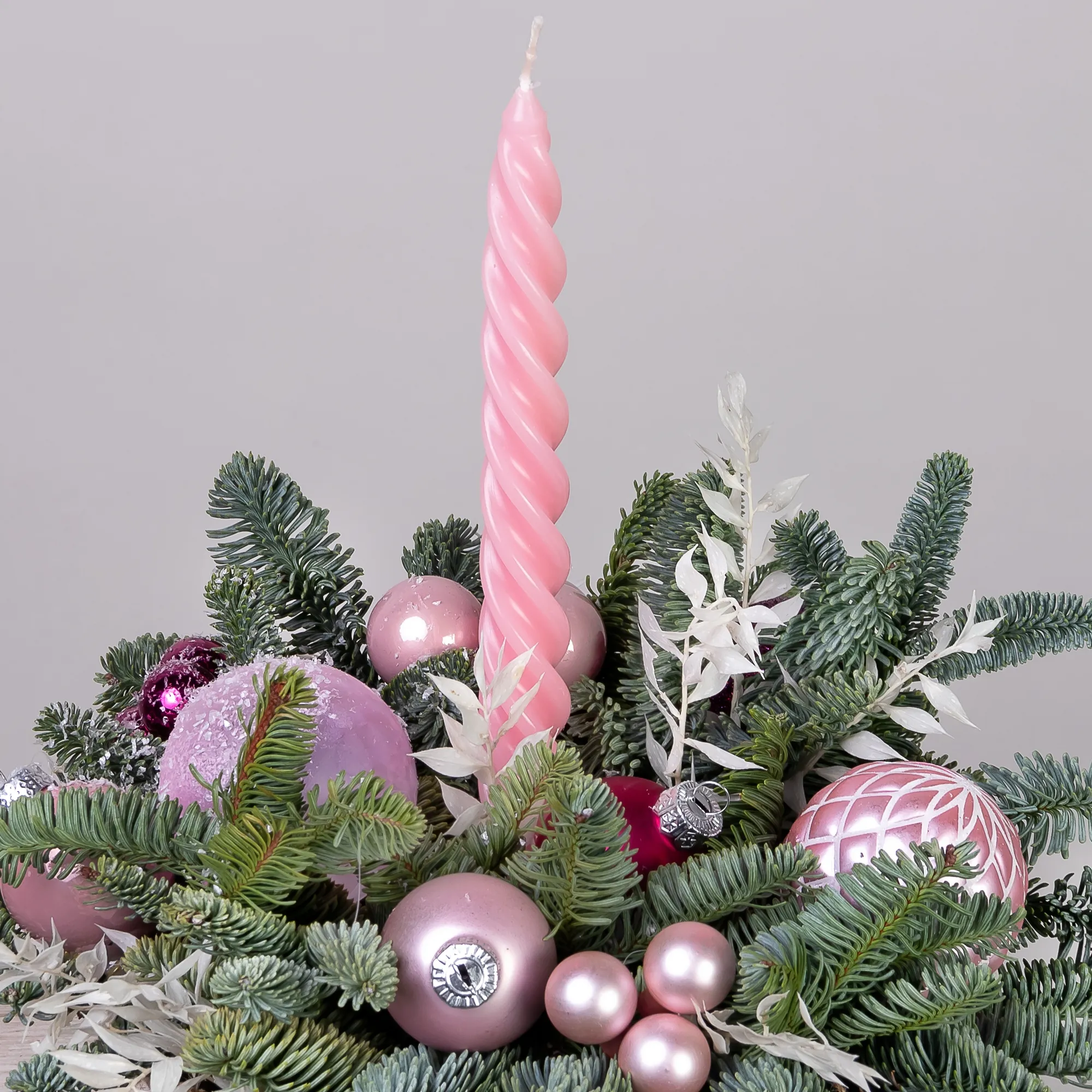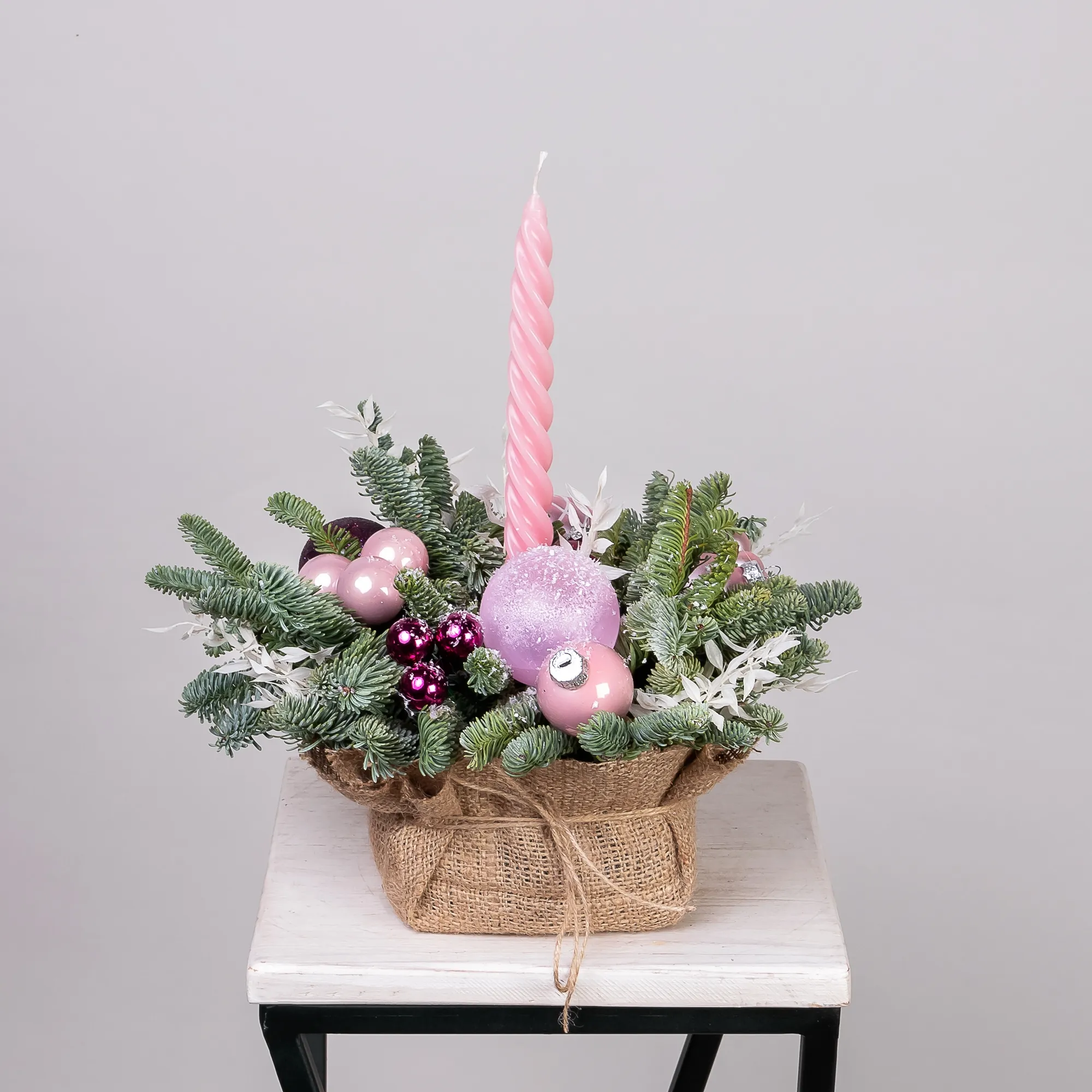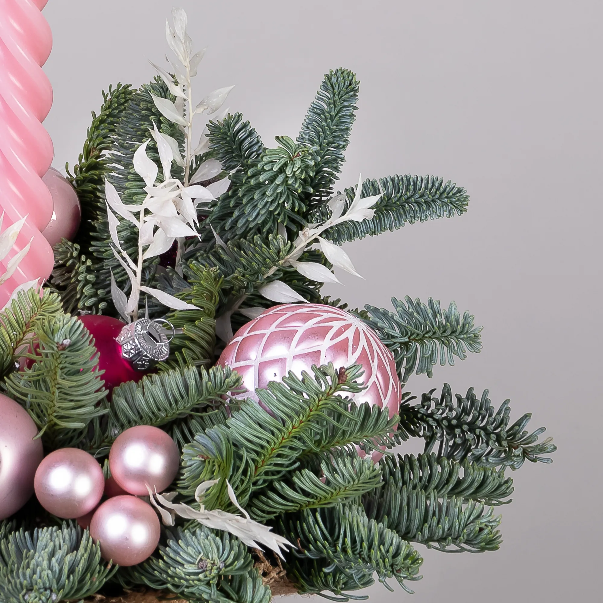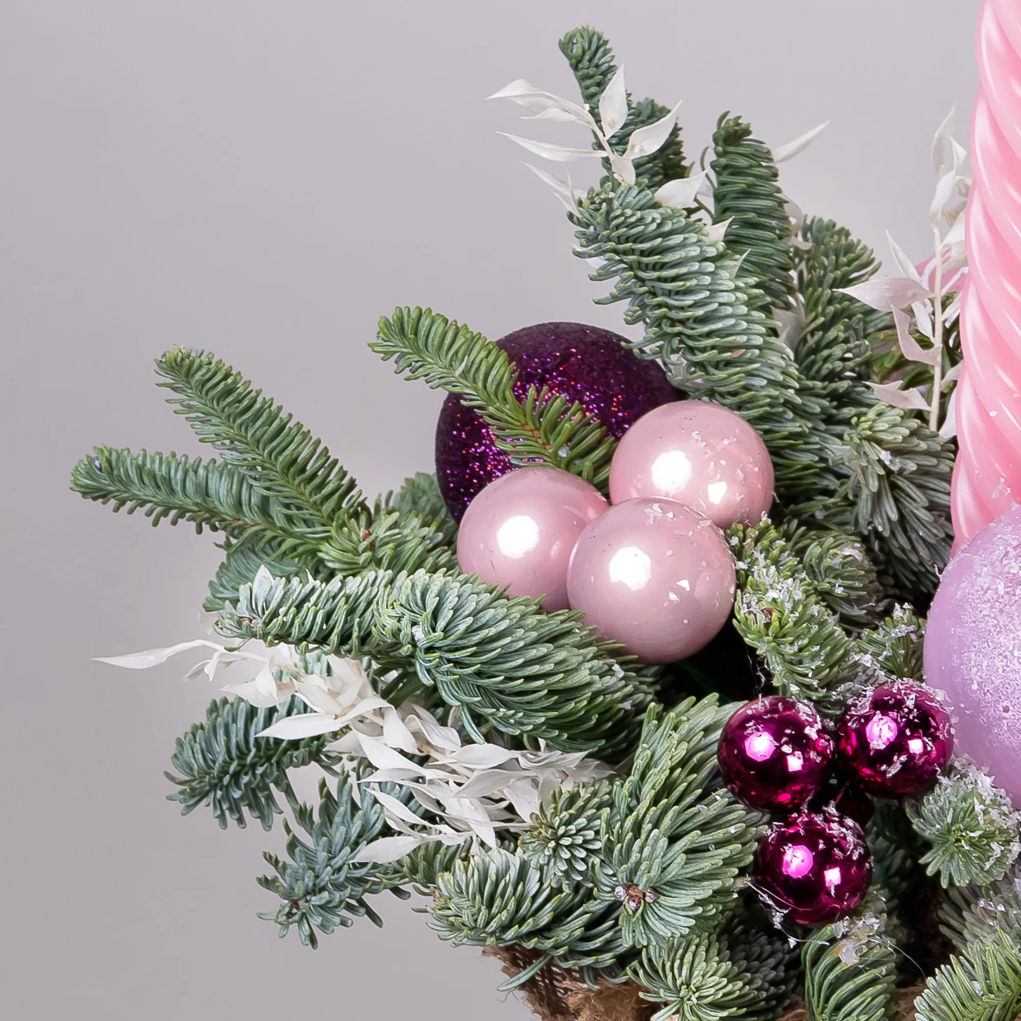 Композиция «Новогодняя со свечой Розовая S» создана из живых ветвей датской пихты сорта нобилис.