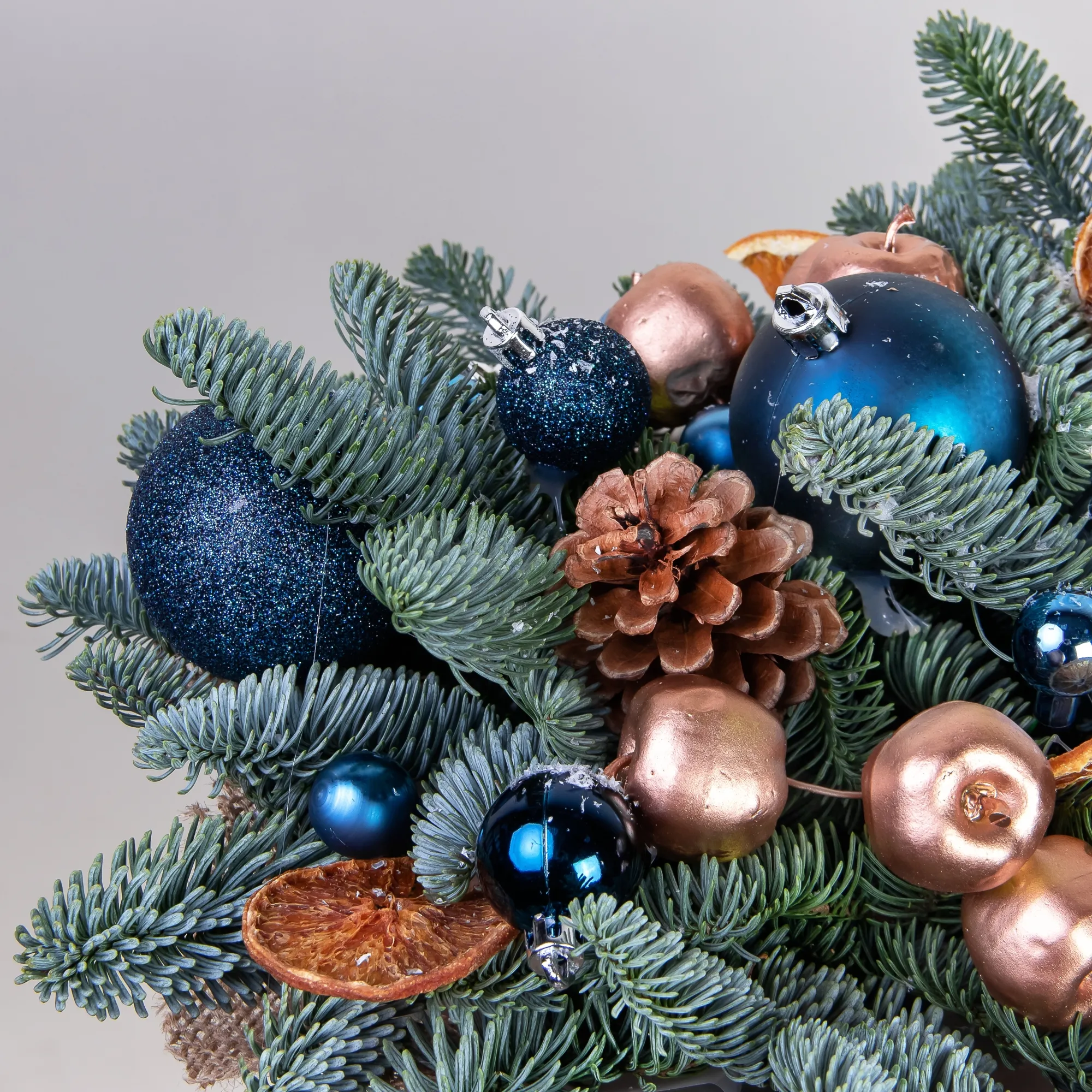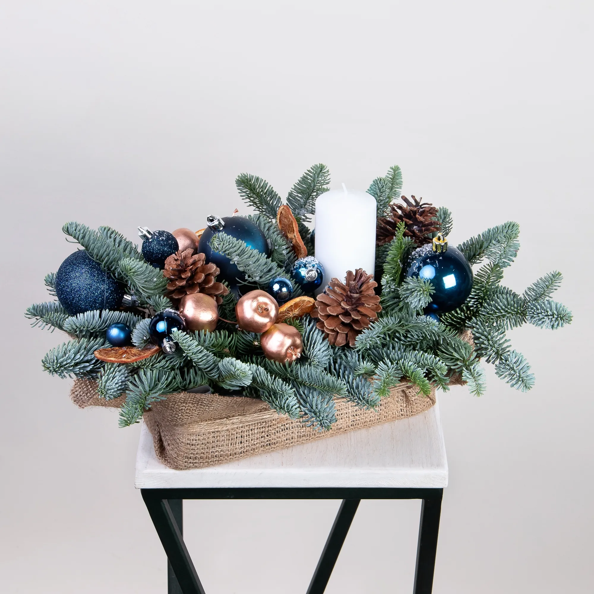 Композиция «Новогодняя со свечой Синяя M» создана из живых ветвей датской пихты сорта нобилис.