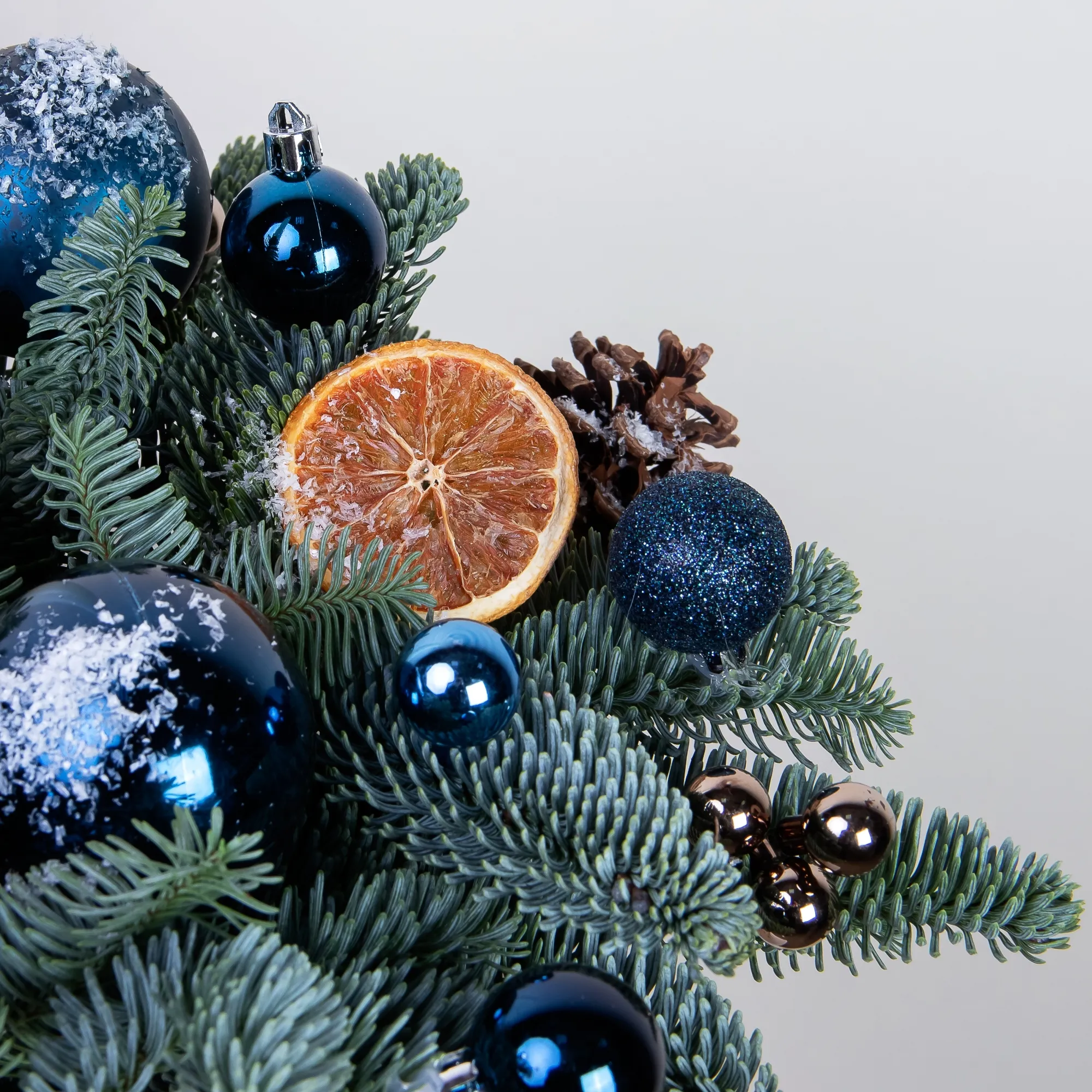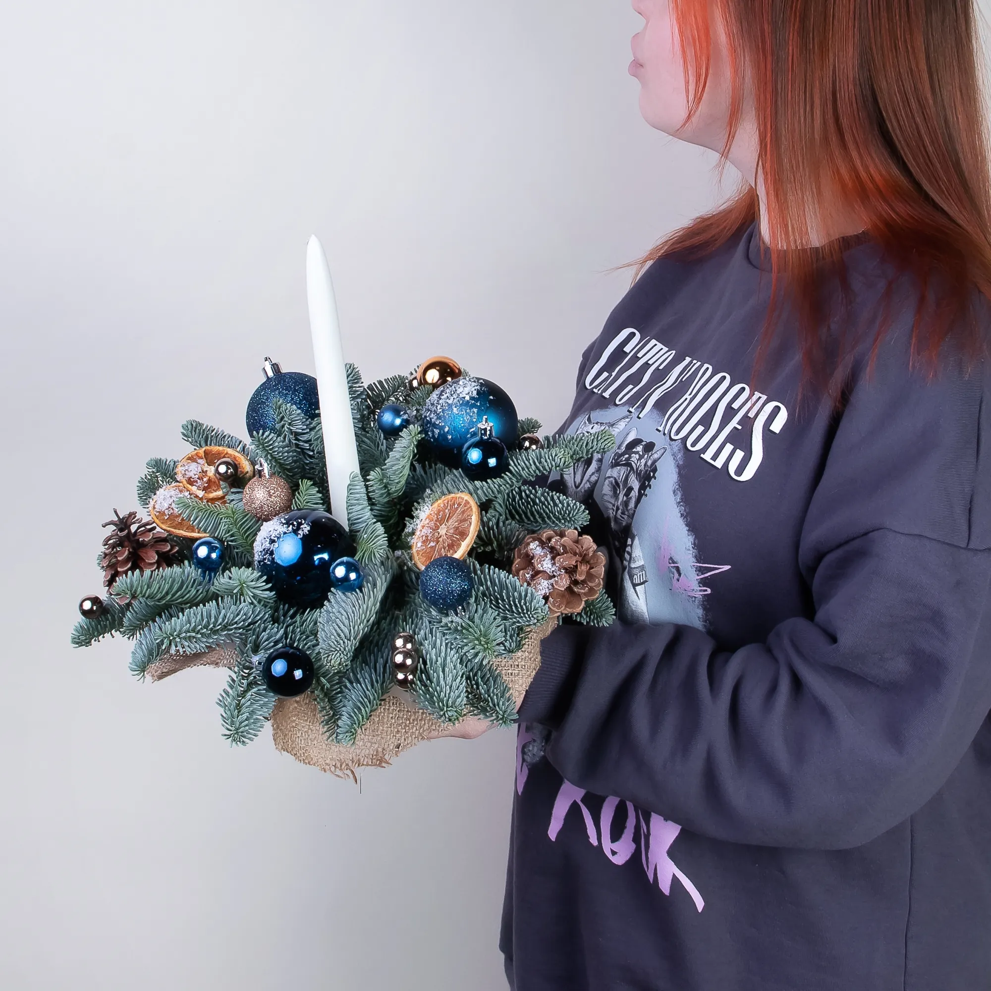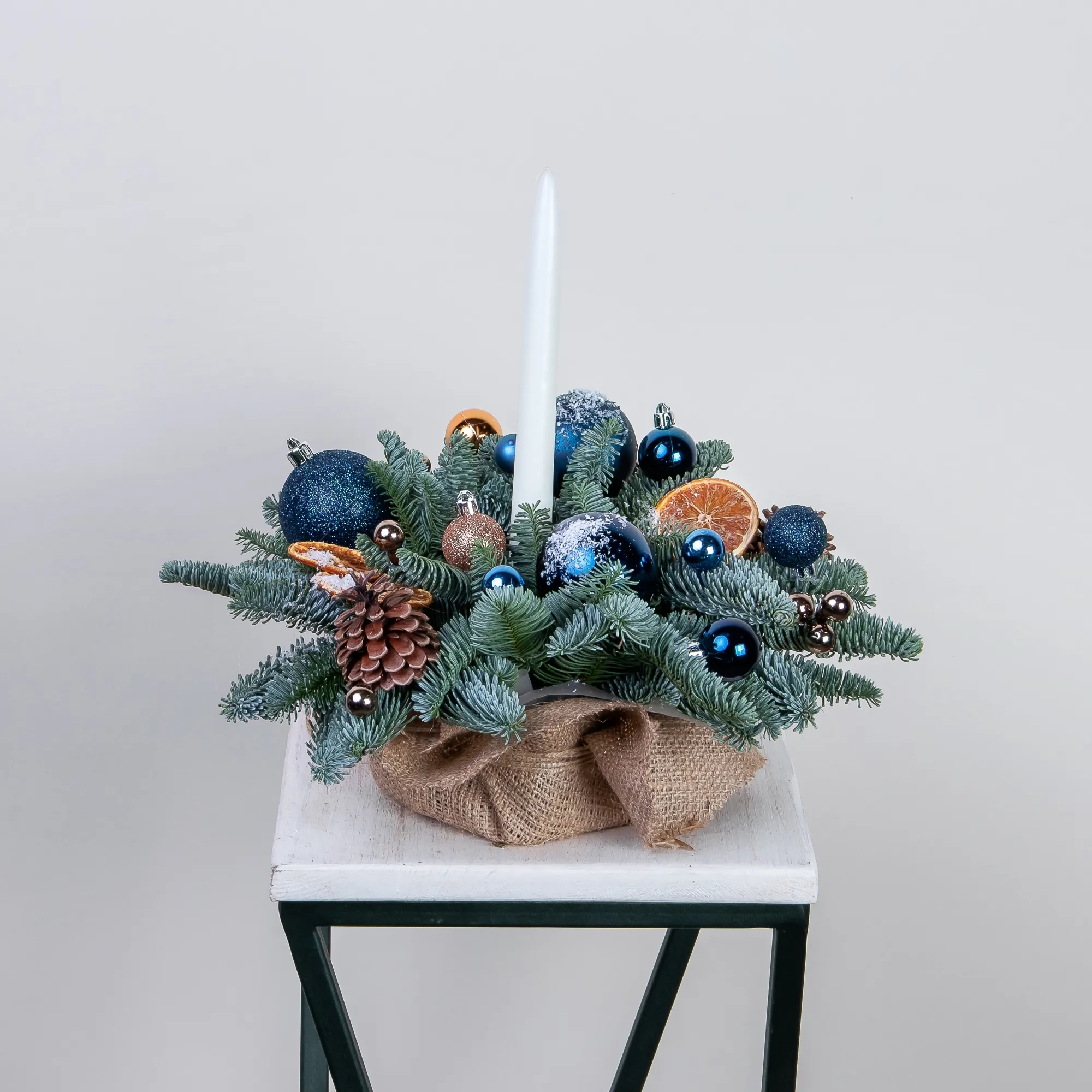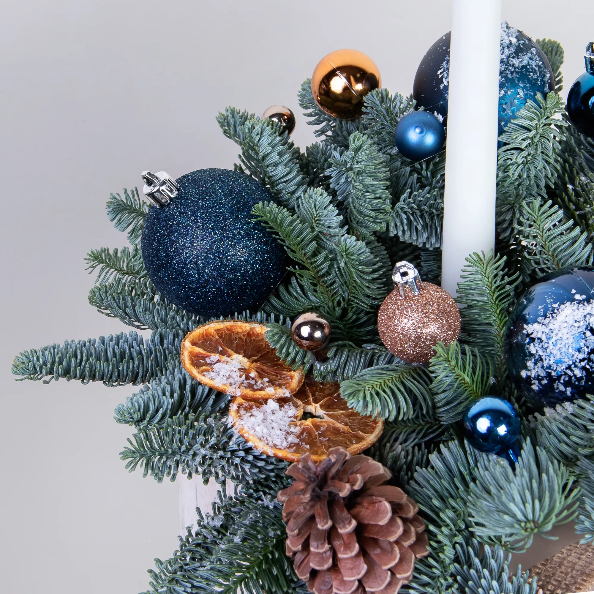 Композиция «Новогодняя со свечой Синяя S» создана из живых ветвей датской пихты сорта нобилис.