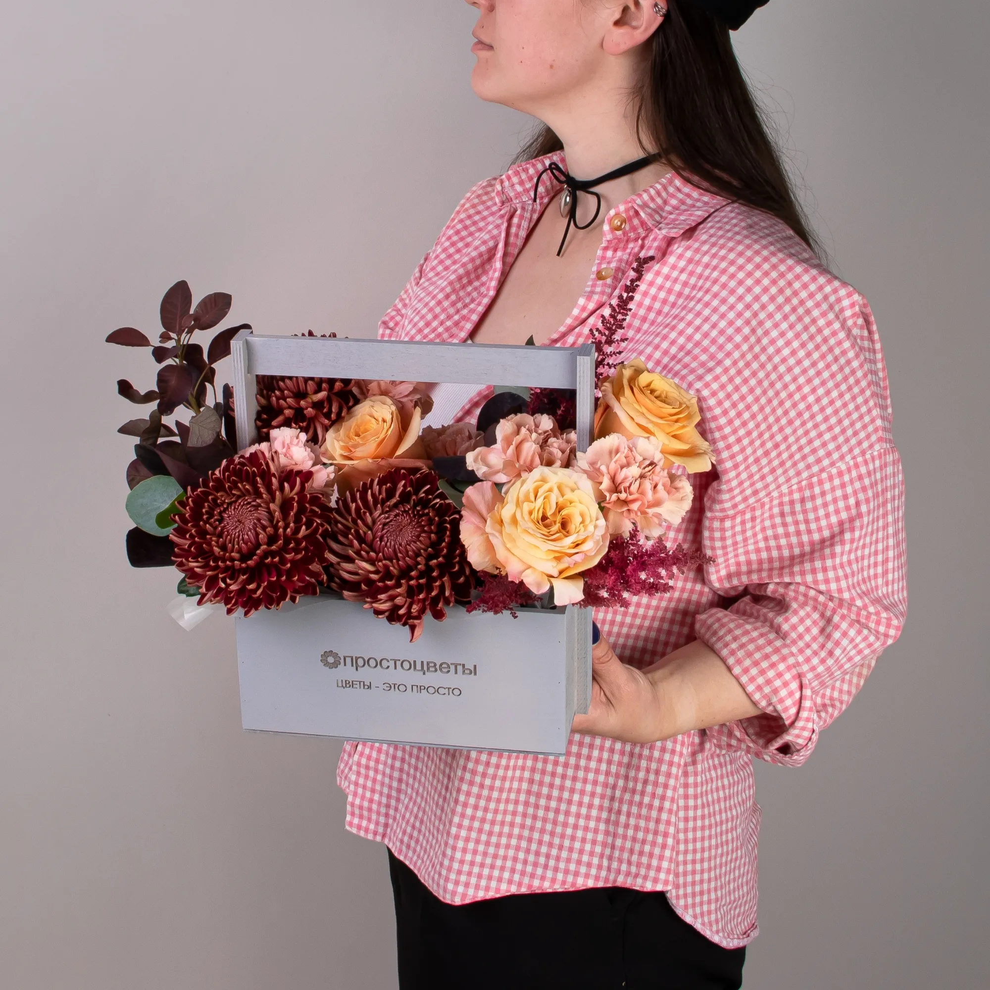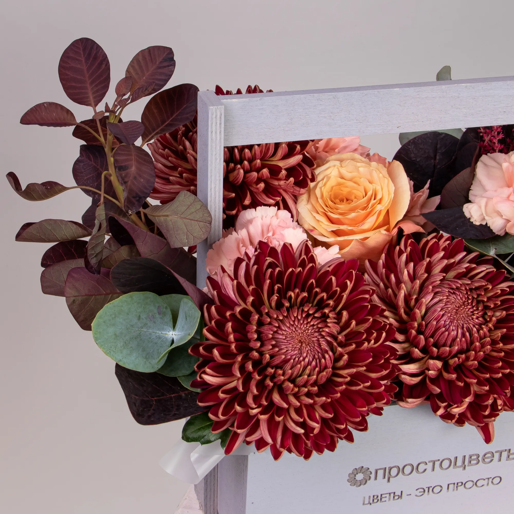 Гвоздика-5, Роза-3, Хризантема-3, Листья эвкалипта-1