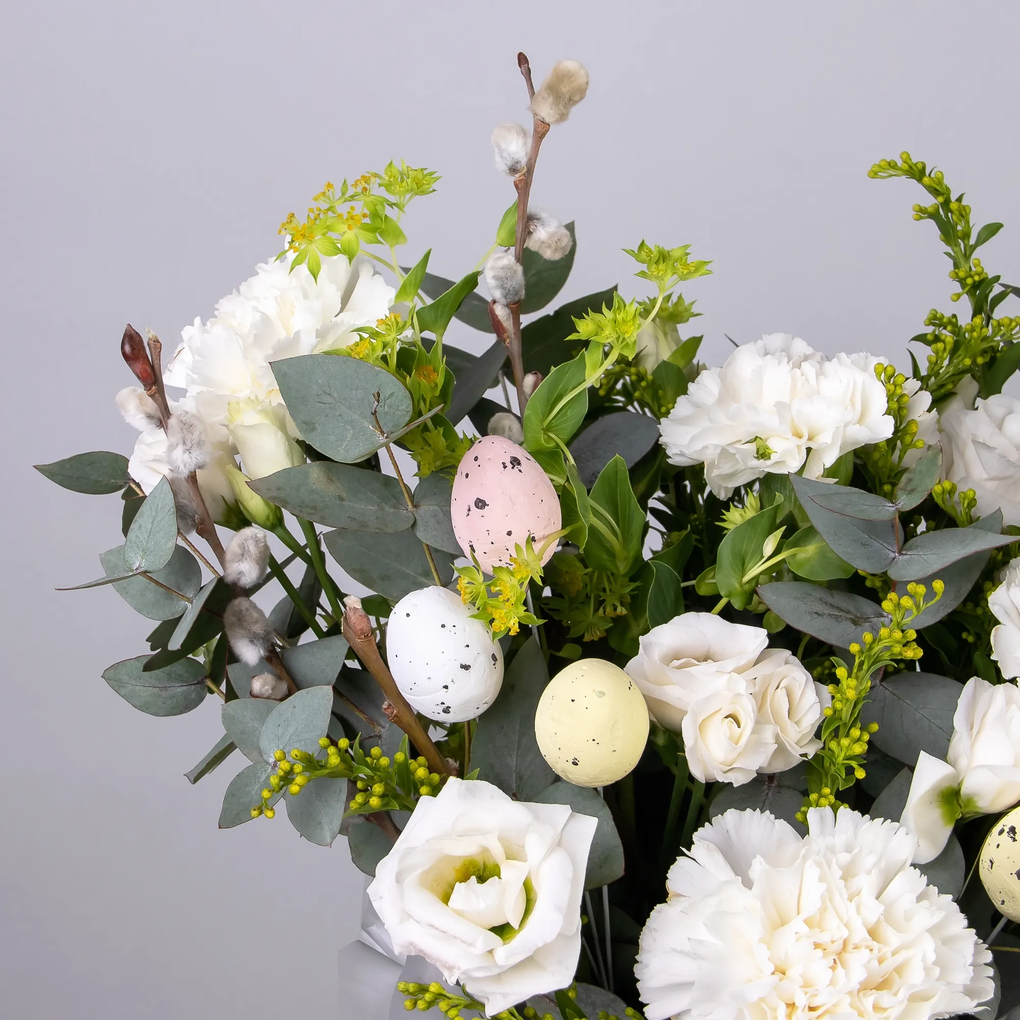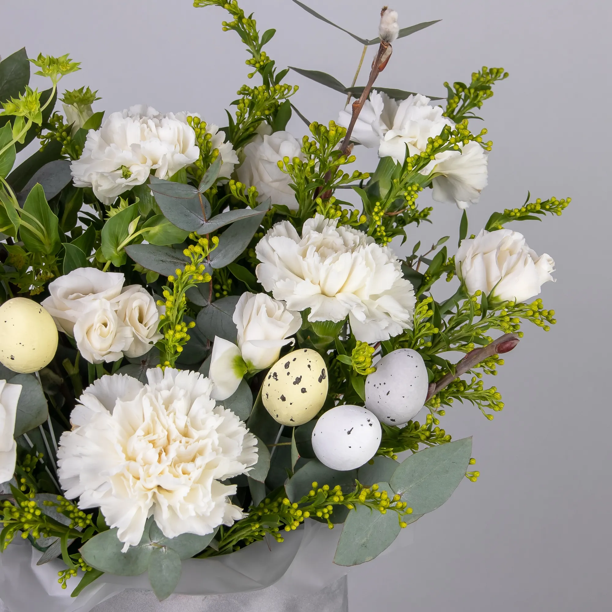 Верба-2, Гвоздика-5, Эустома-2, Солидаго-2, Буплерум-1, Листья эвкалипта-3