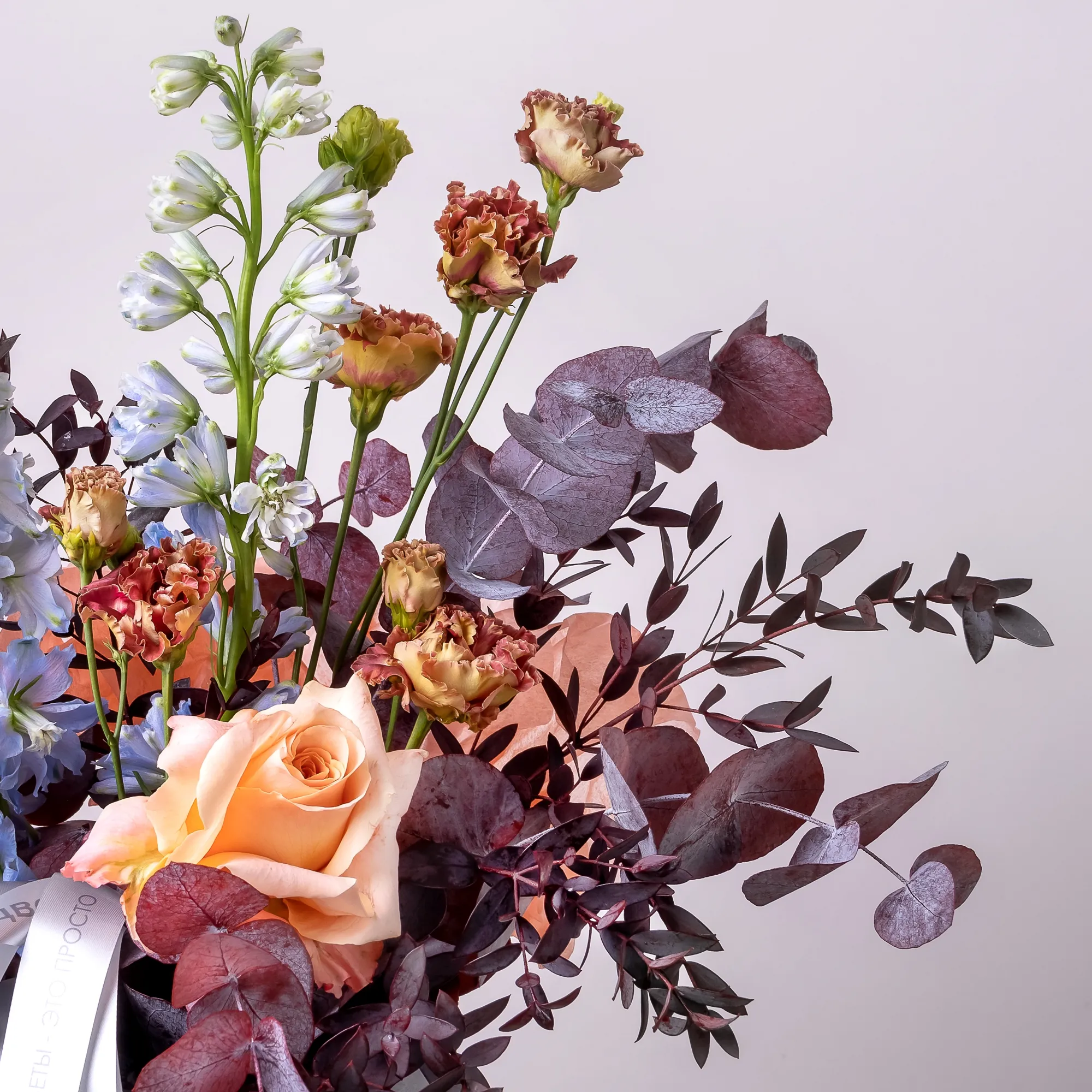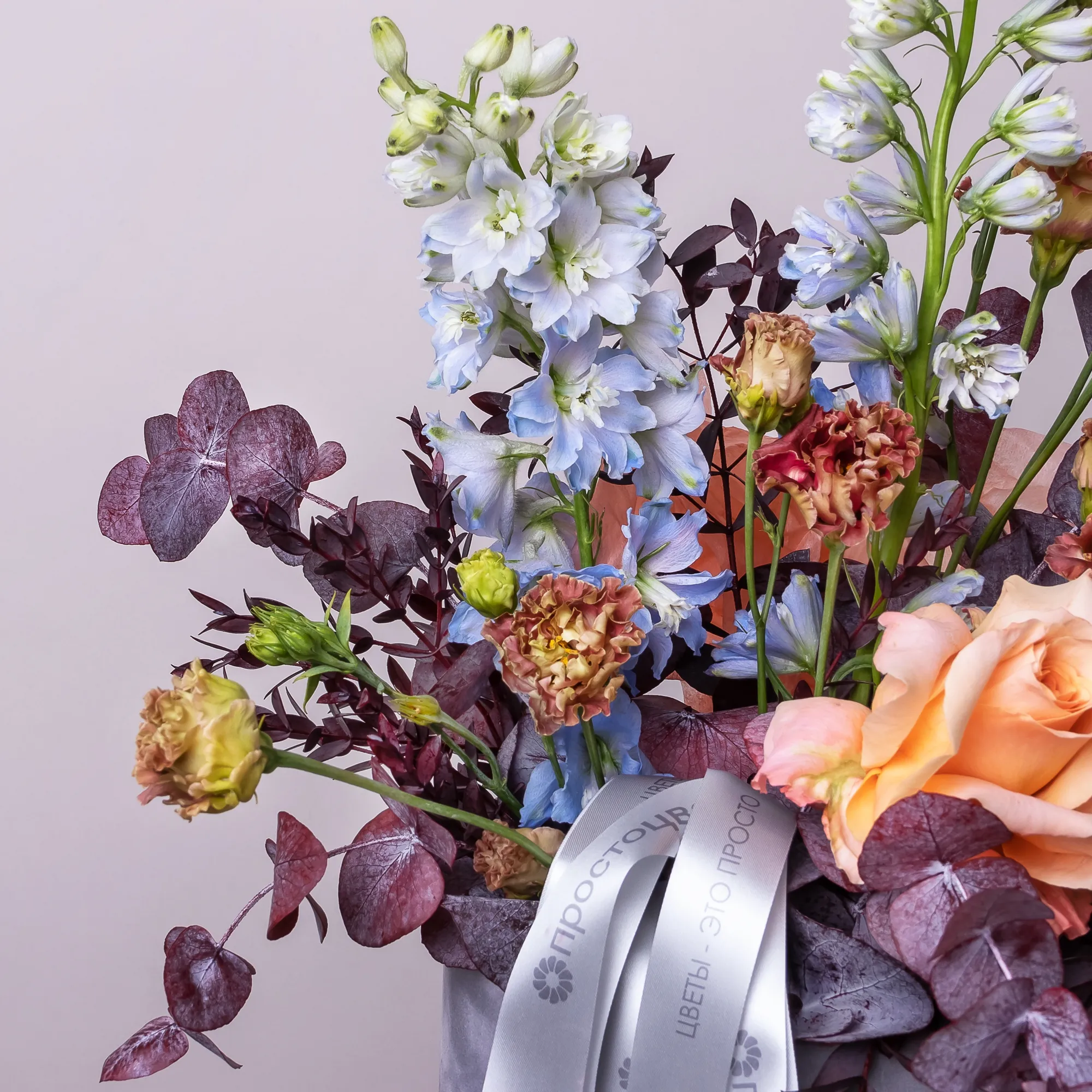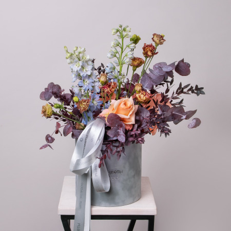 Цветовая гамма композиции богата необычными сочетаниями и визуальными контрастами. В составе голубой дельфиниум, шоколадный лизиантус, бежево-оранжевая роза сорта "Шиммер", а также крашеные листья эвкалипта, добавляющие изюминку. Композиция дополнена длинной брендированной лентой.
