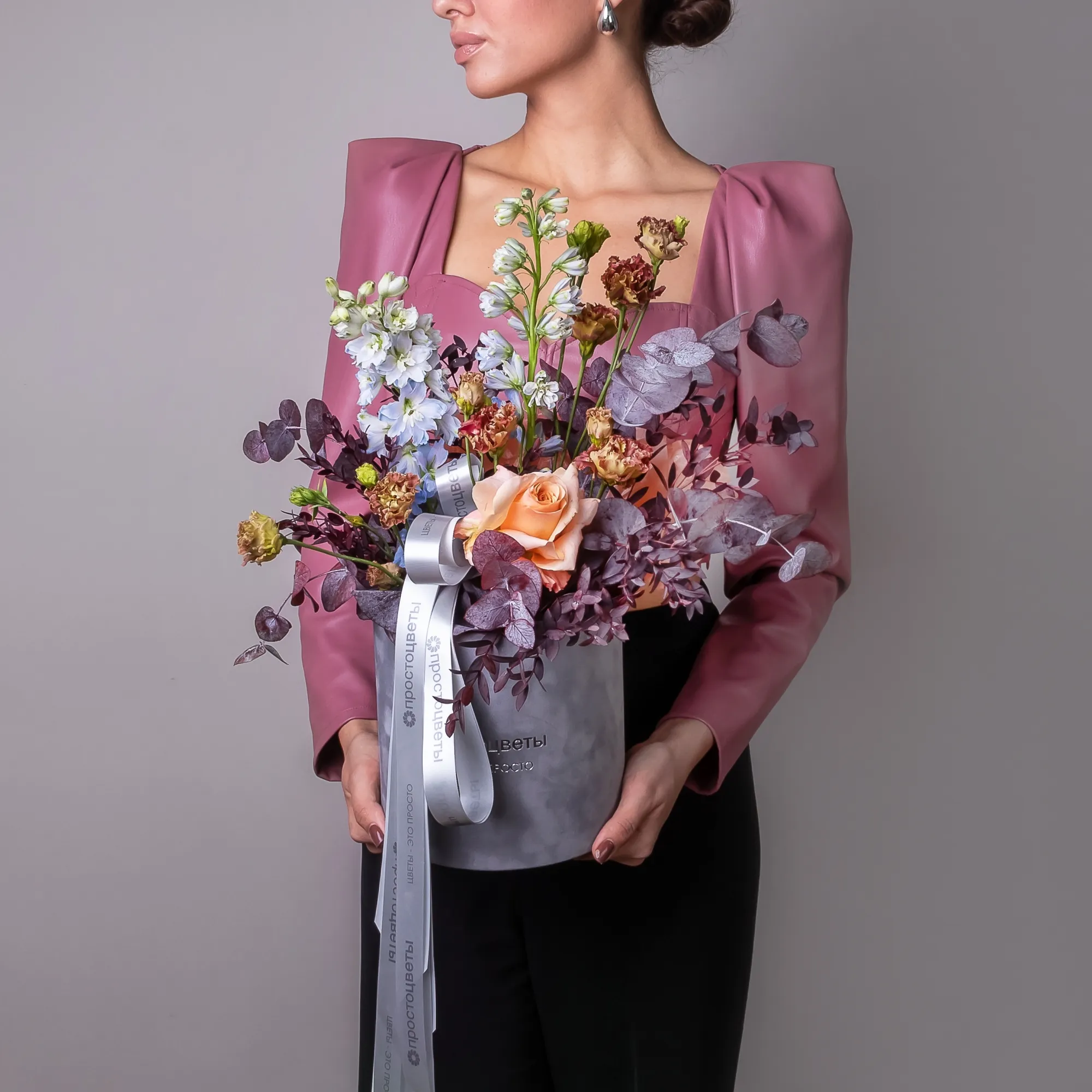 Роза-1, Эустома-1, Дельфиниум-2, Листья эвкалипта-5