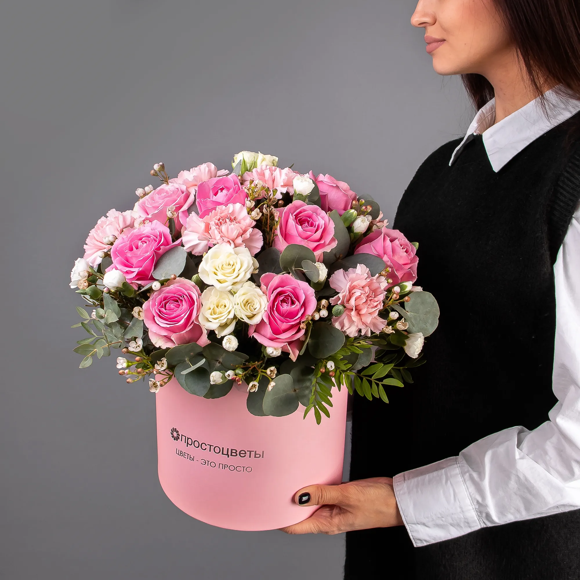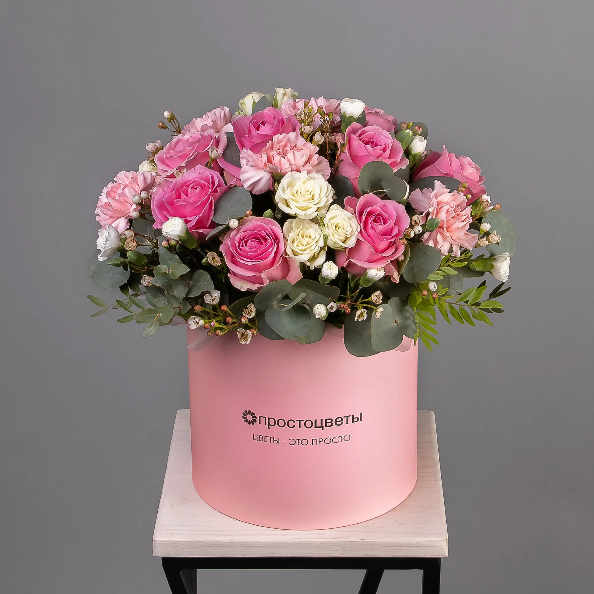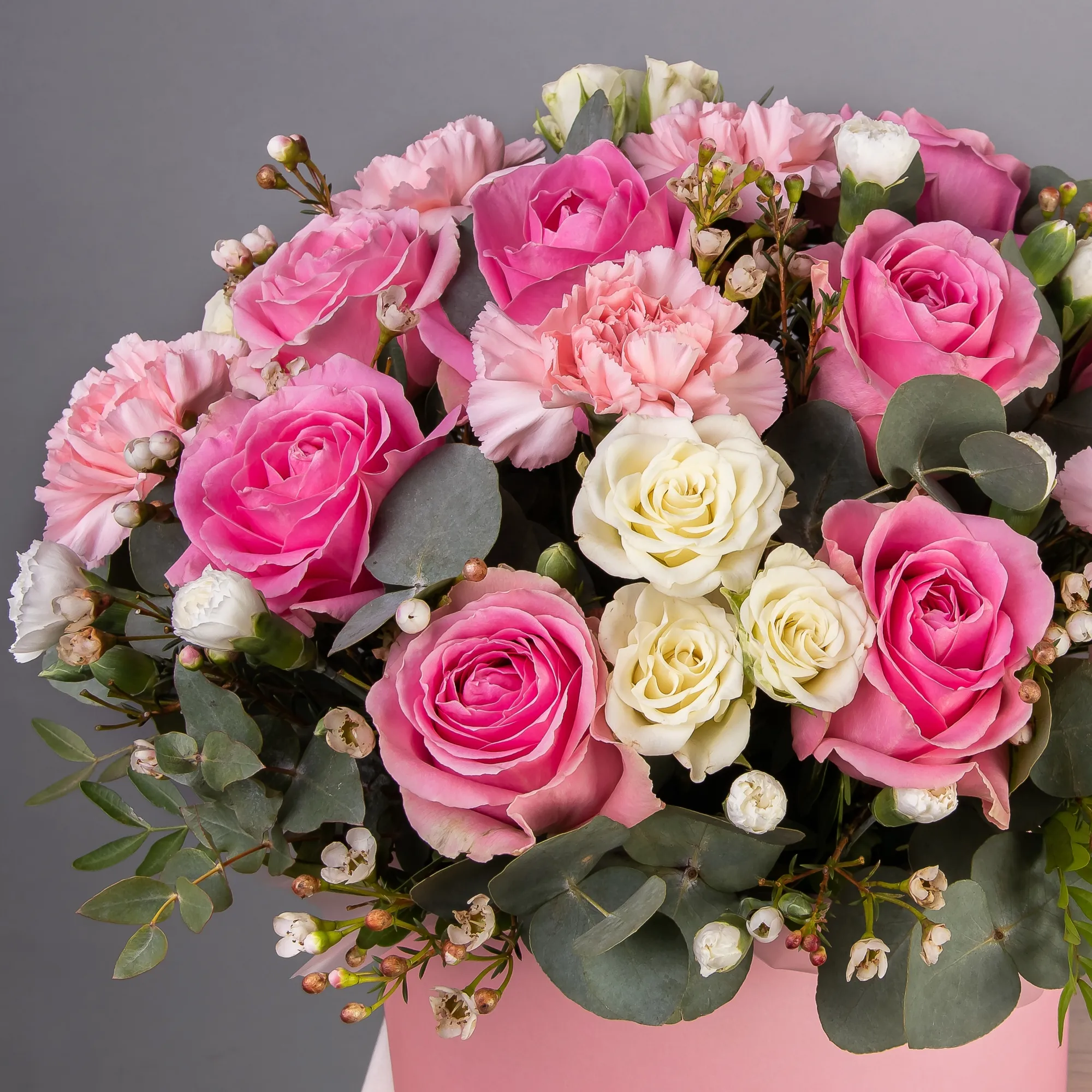 Праздничное сочетание изысканных сортовых роз, белого лизиантуса и розовой гвоздики, подчеркнутых объемными листьями фисташки и эвкалипта, аккуратно упакованные в шляпную коробку - украшение, которое будет к месту на любой свадьбе и профессиональном празднике.