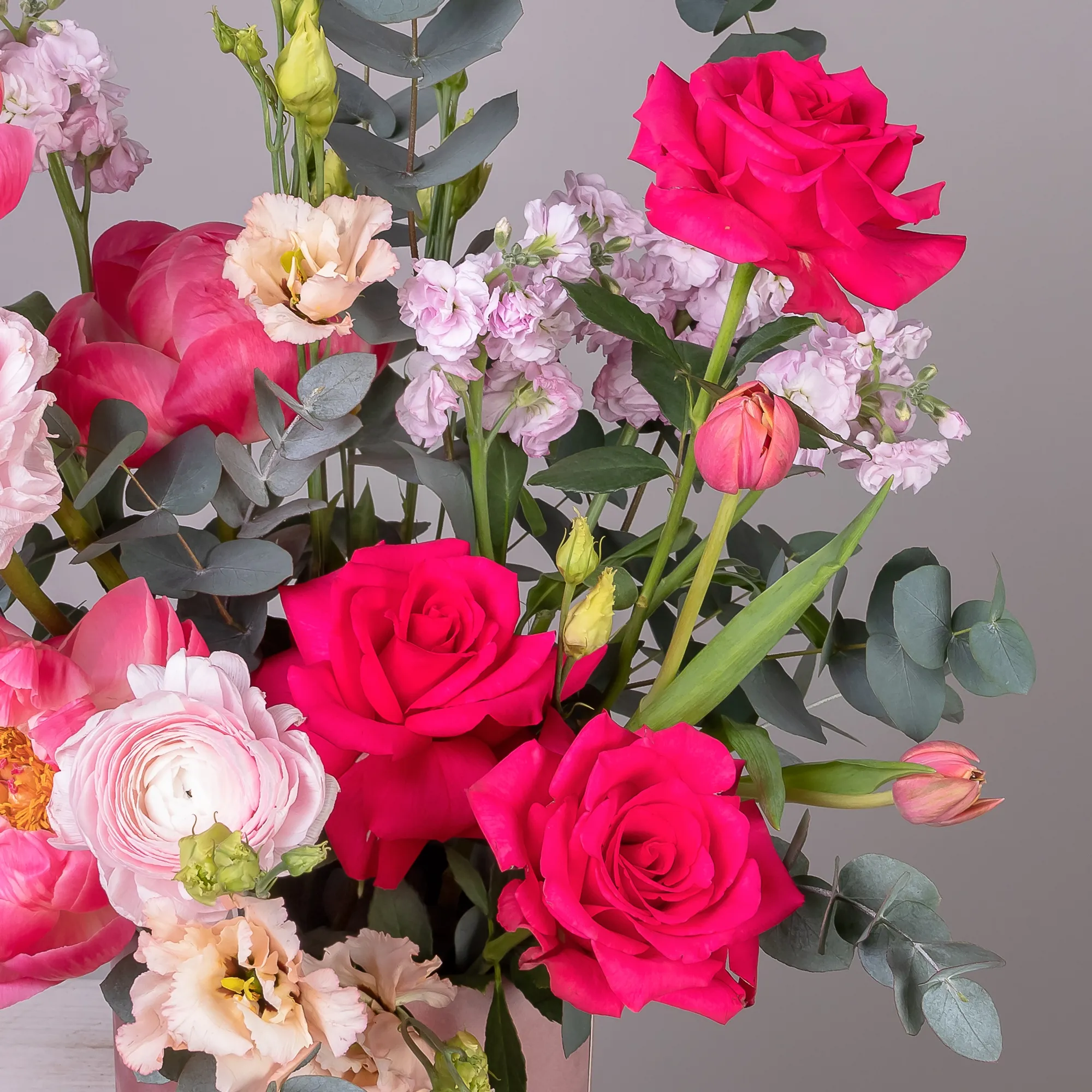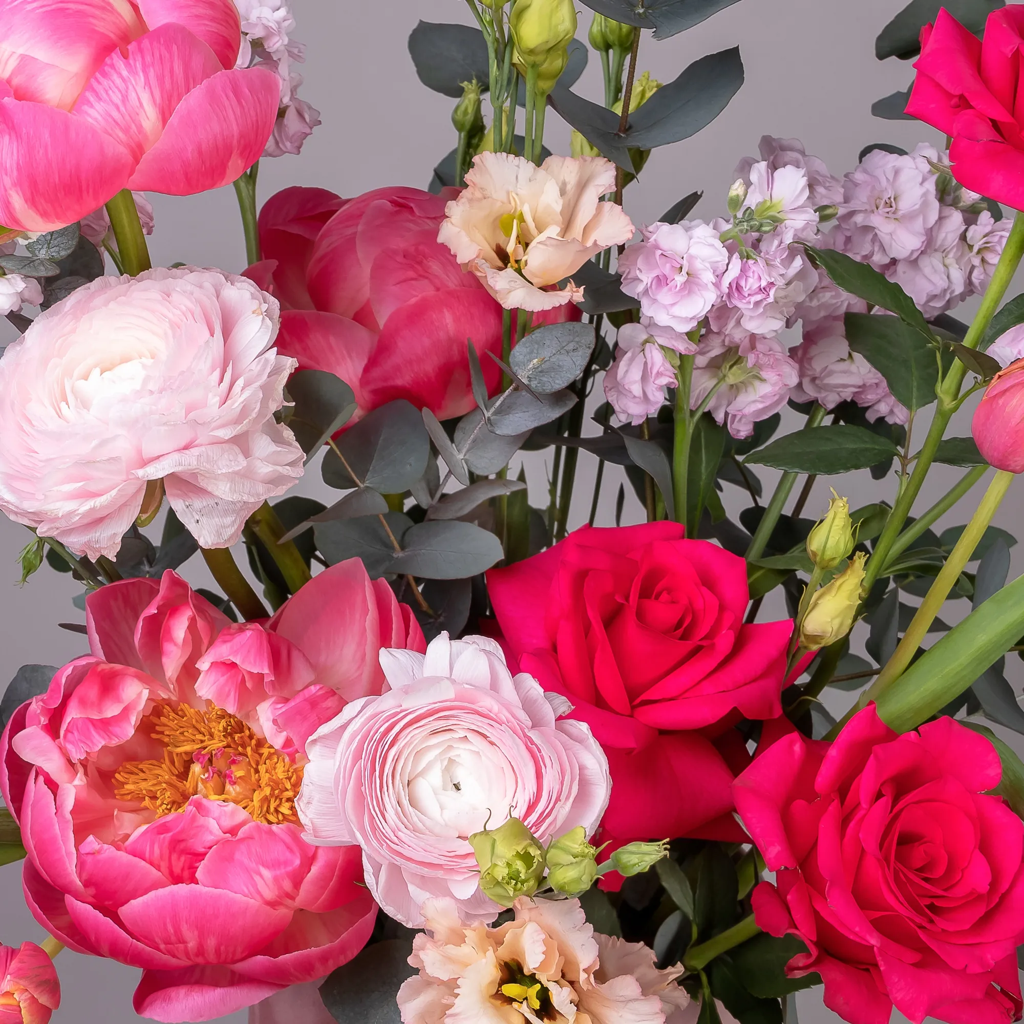 Пион-3, Роза-3, Тюльпан-3, Маттиола-2, Эустома-1, Ранункулюс-2, Листья эвкалипта-2