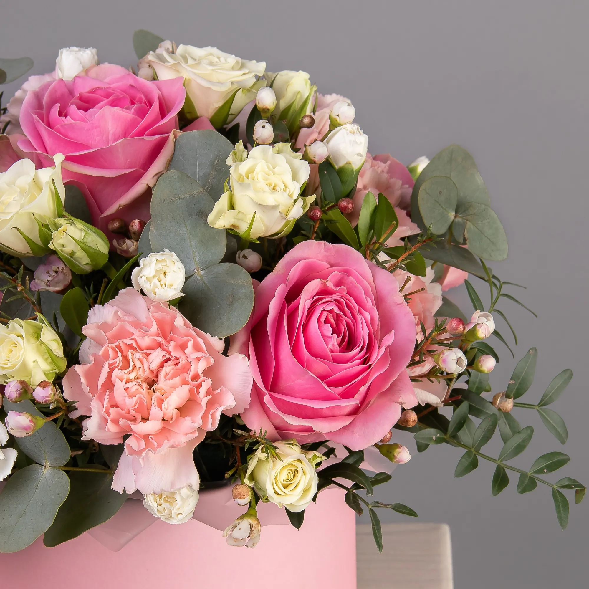 В составе шляпной коробки роза сорта "Вэм" (3 шт), кустовая роза "Сноу Флейк" (3 шт), белый лизиантус (3 шт), розовая гвоздика (5 шт), белая кустовая гвоздика (2 шт), а также листья фисташки.