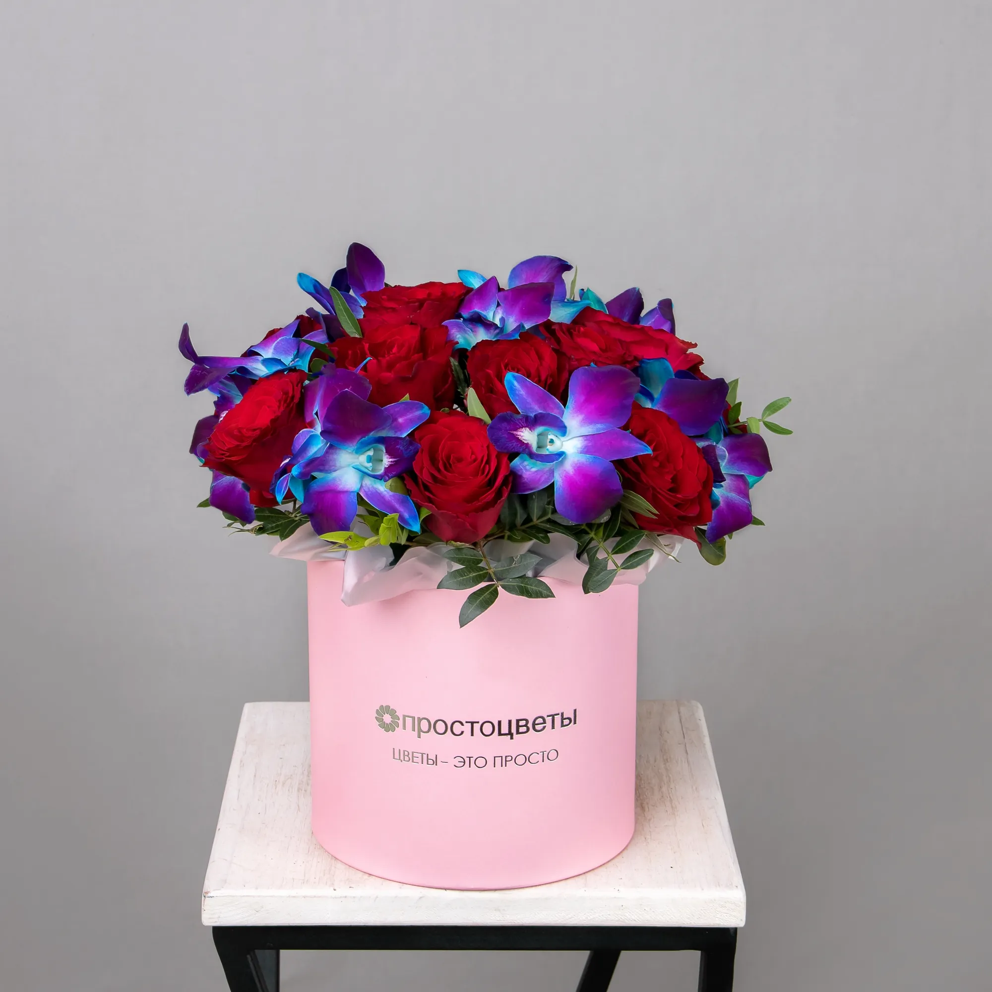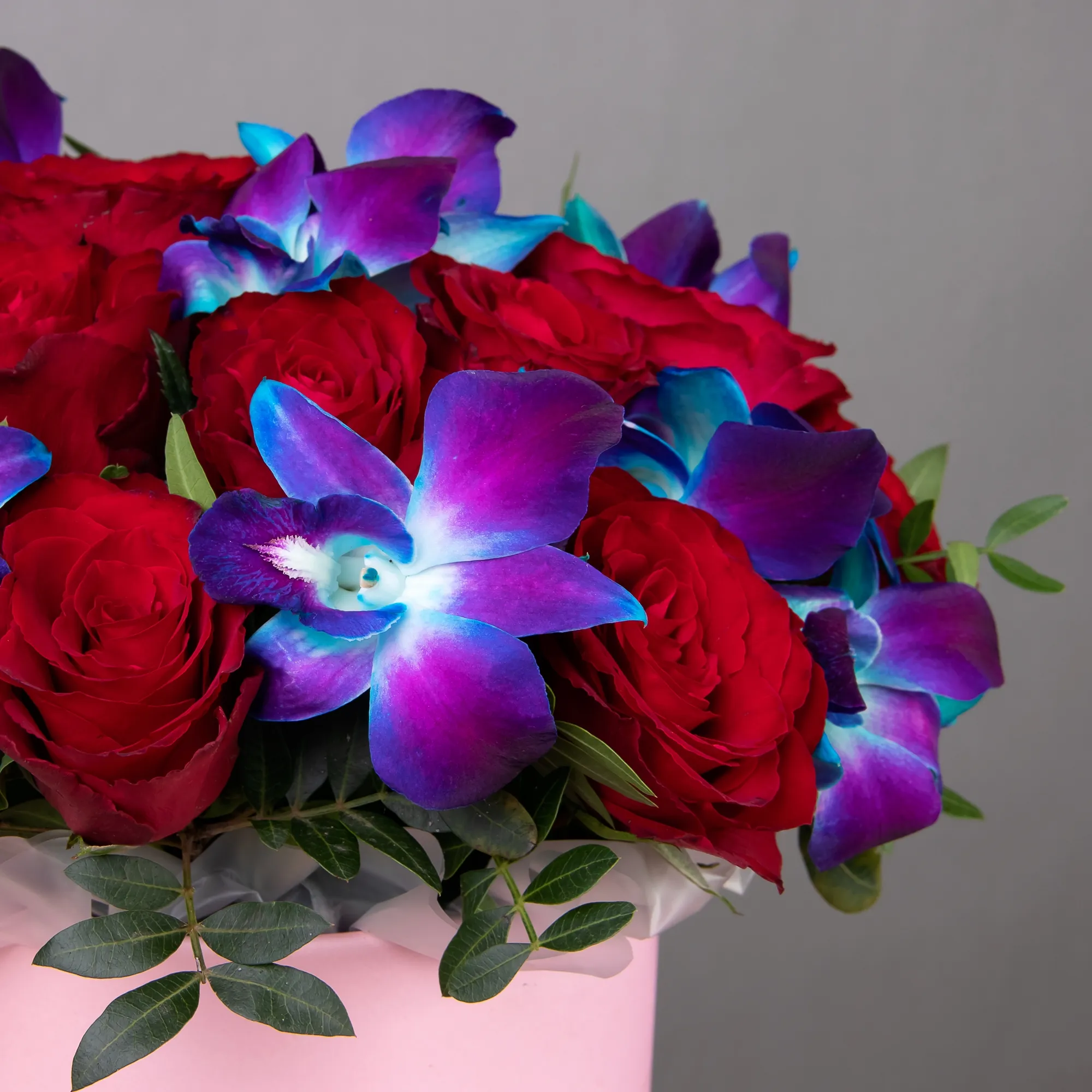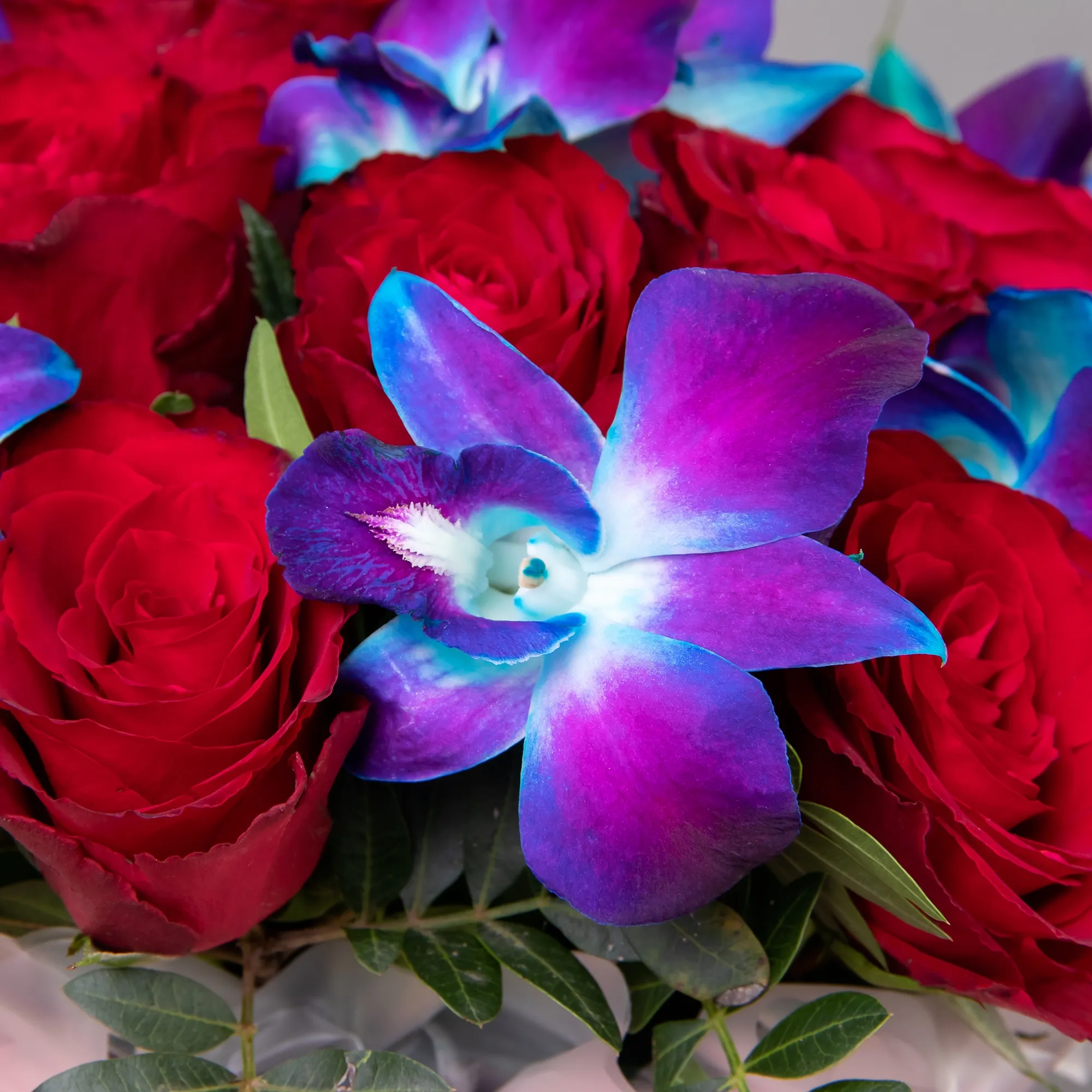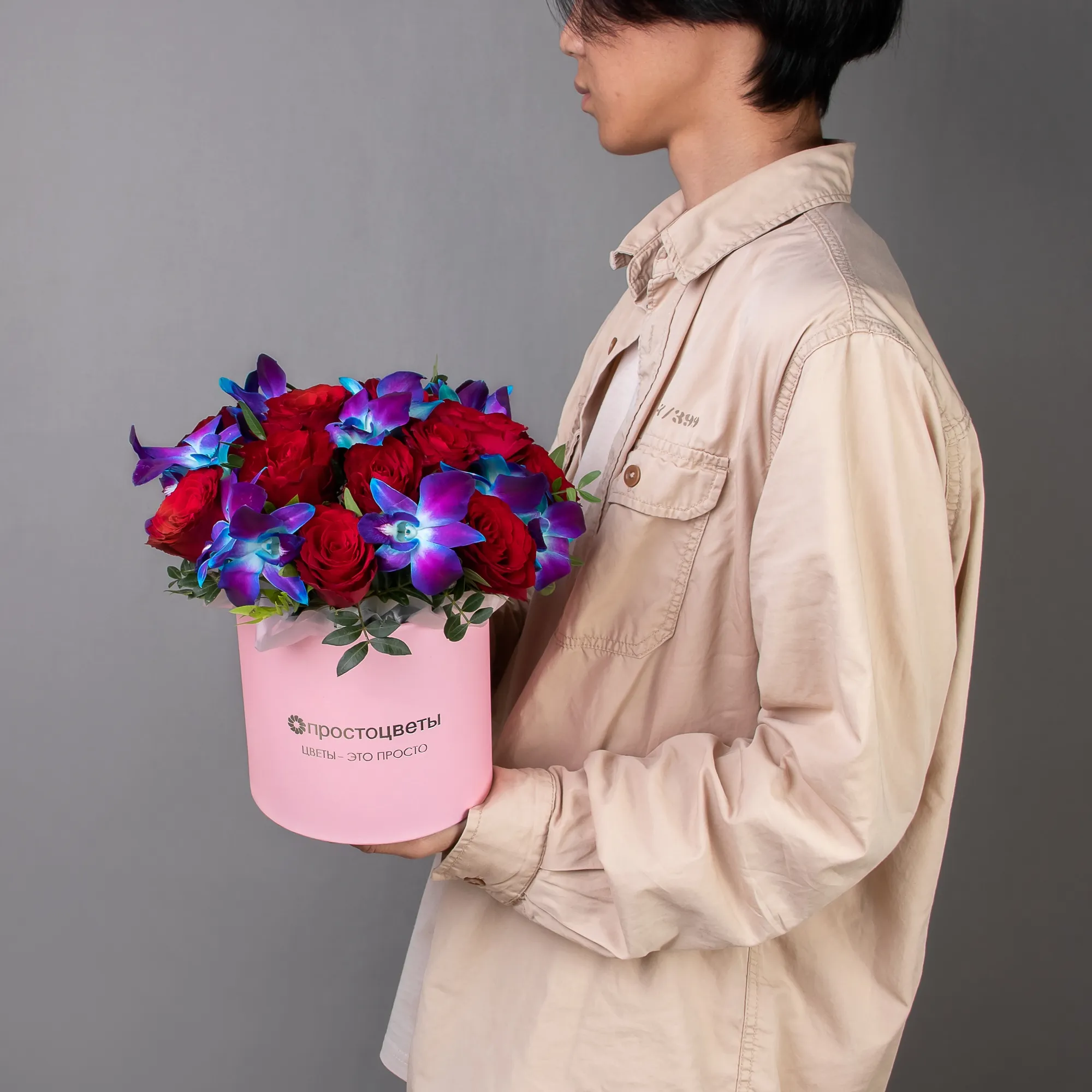 В составе этой шляпной коробки красная роза и синий дендробиумом - это сочетание, которое символизирует любовь и нежность. Красная роза - символ любви, а синий дендробиум - символ нежности и доверия.