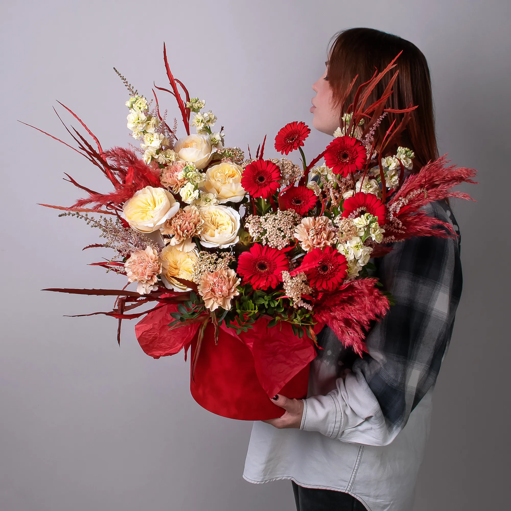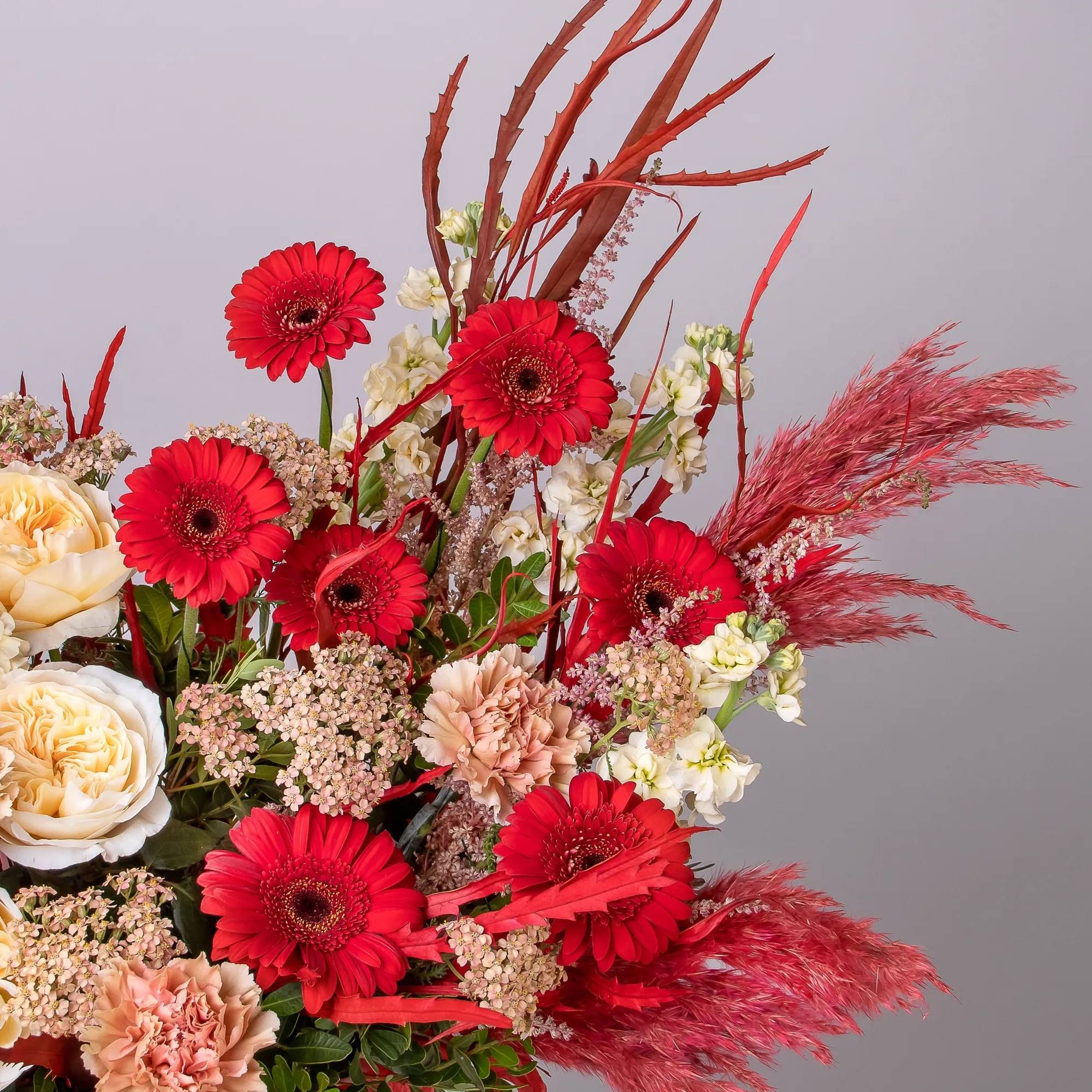 Гвоздика-5, Маттиола-5, Гермини-7, Роза пионовидная-5, Листья фисташки-5