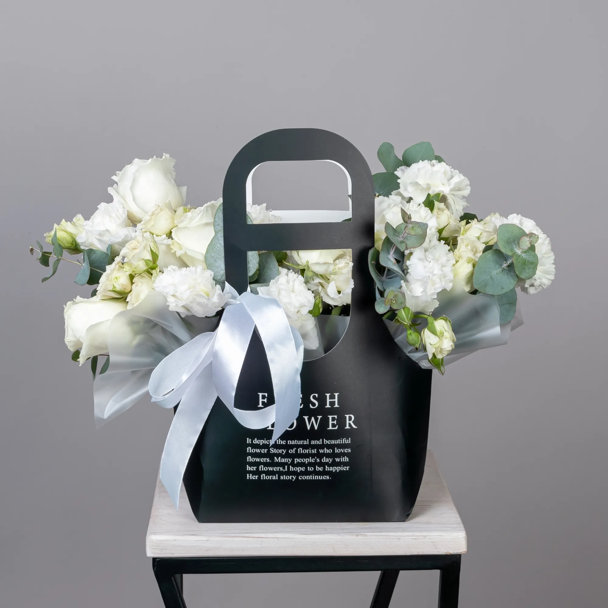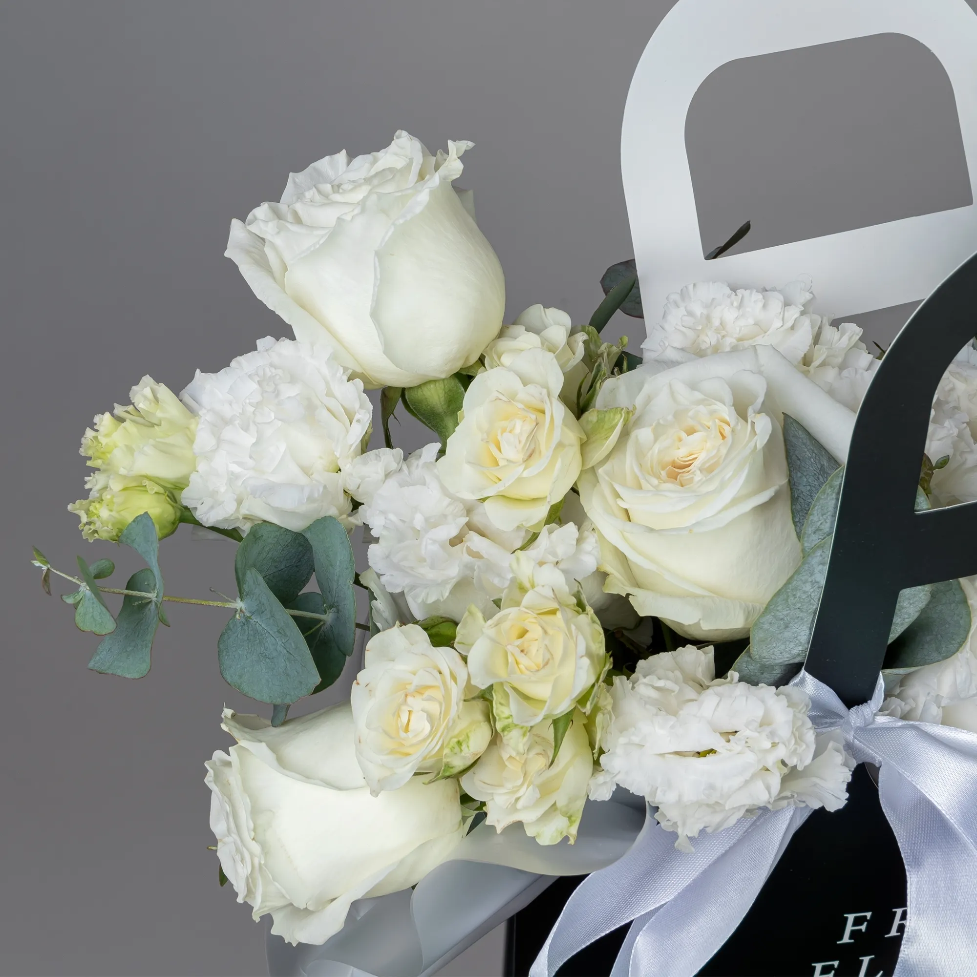 Композиция "Сумочка с белой эустомой и кустовой розой"