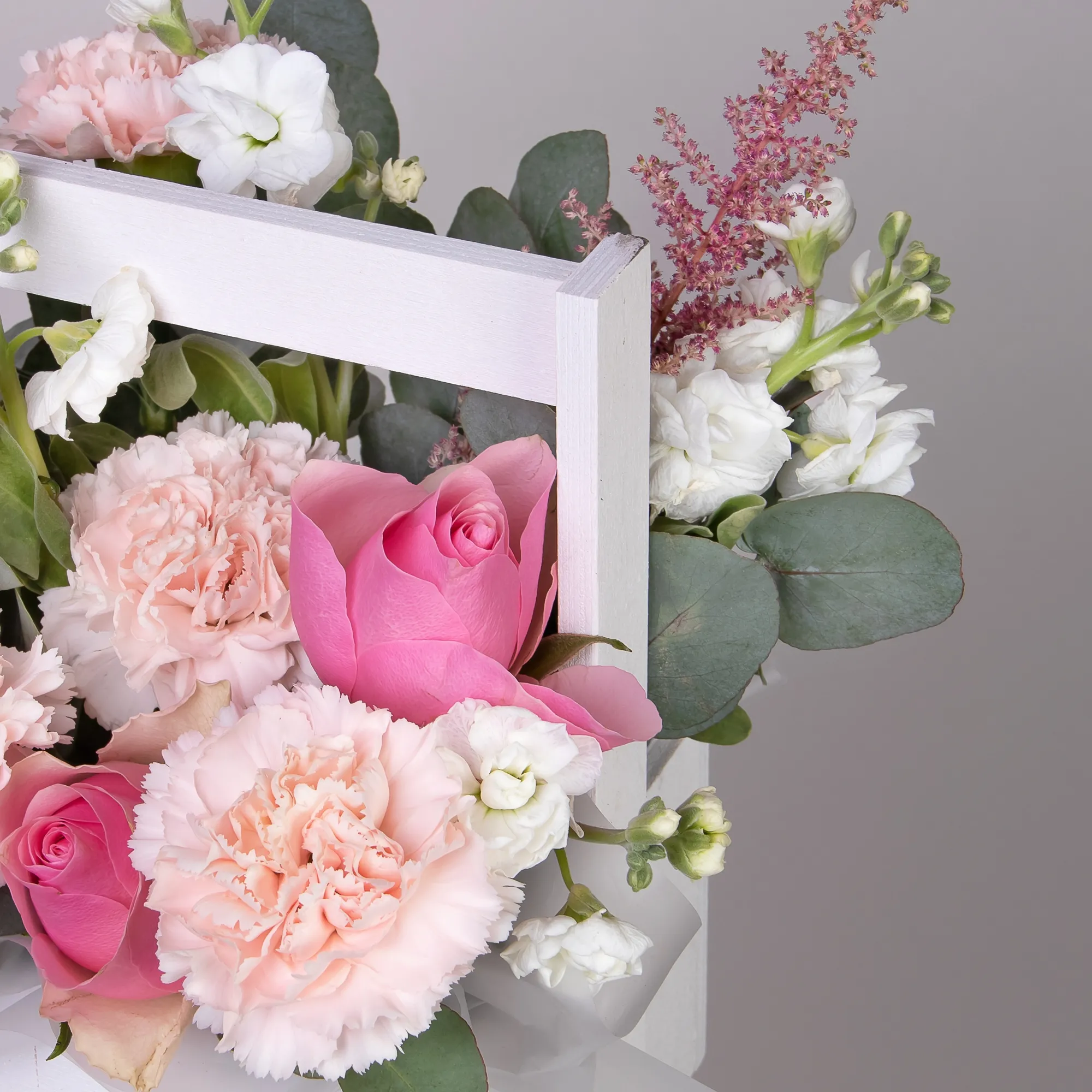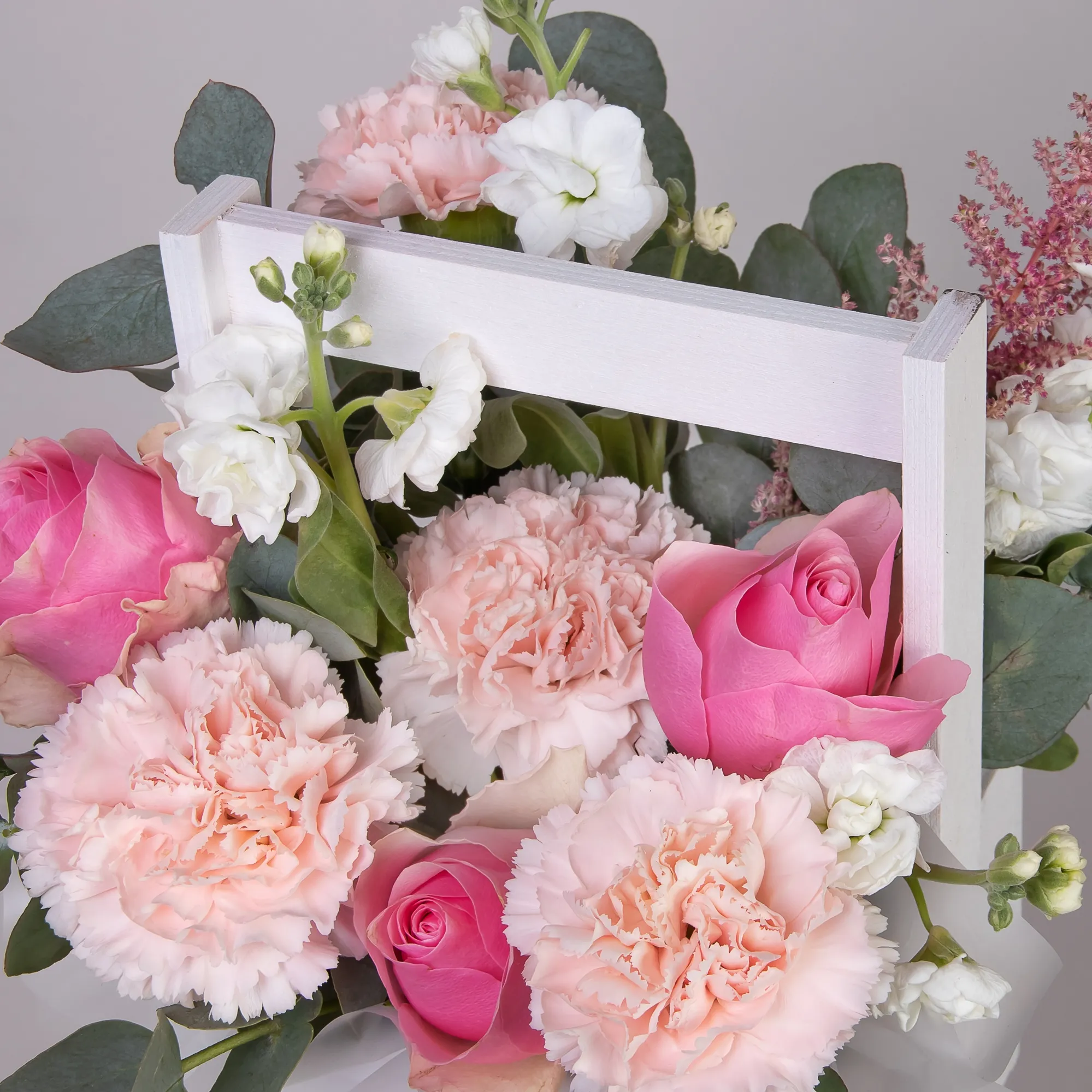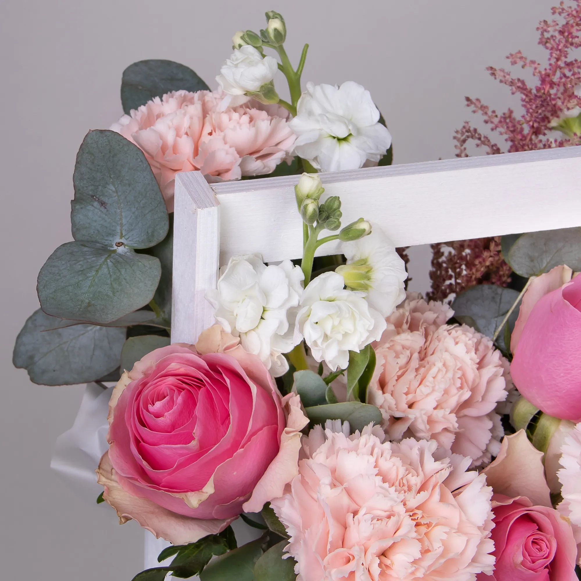 Гвоздика-4, Роза-3, Маттиола-1, Листья эвкалипта-1