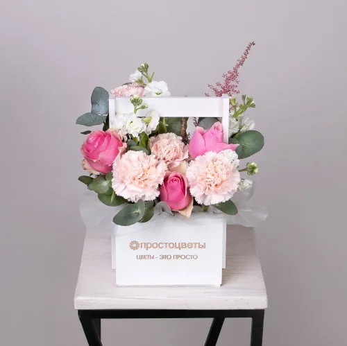 Композиция "Ящик №2 мини" с розовой розой и диантусом.
