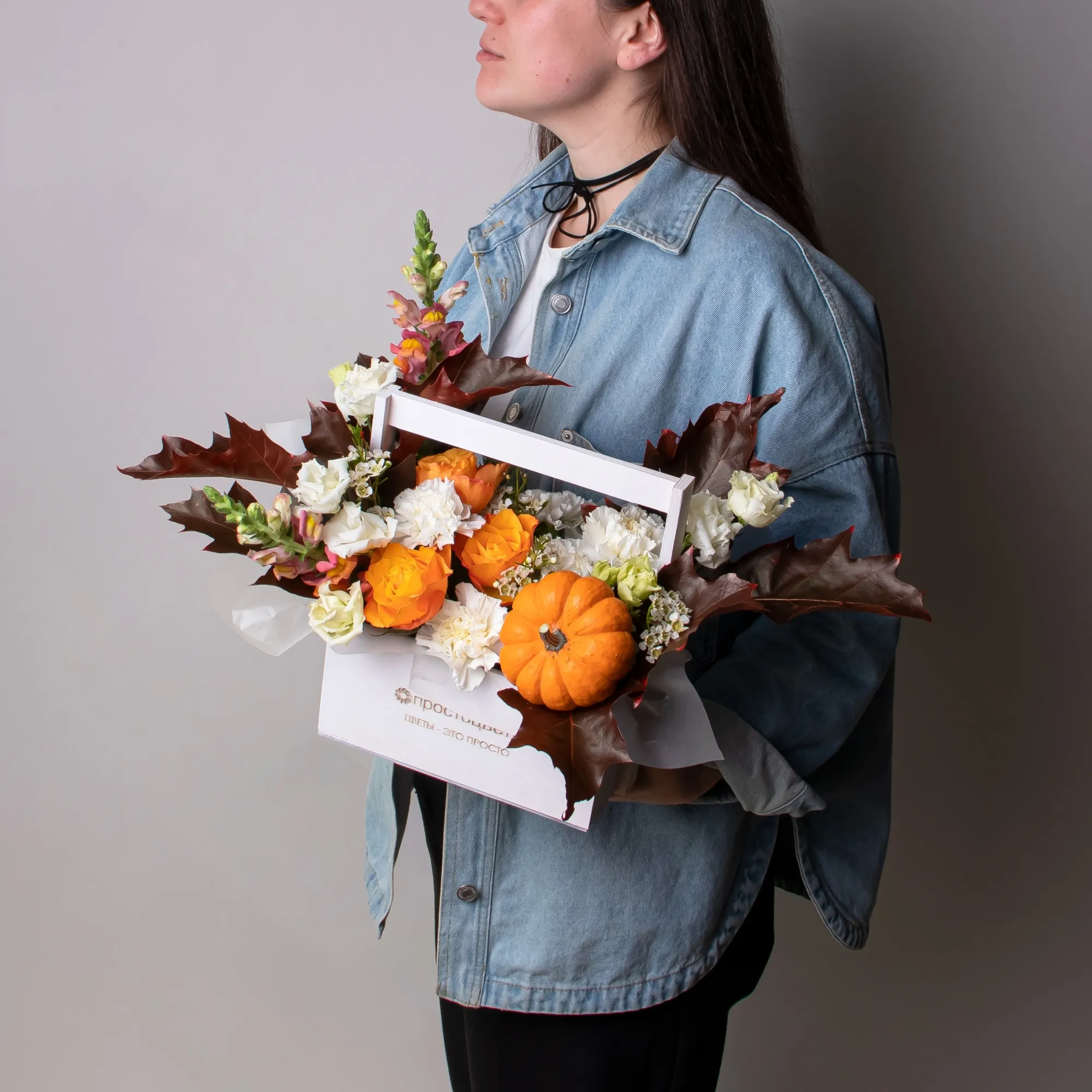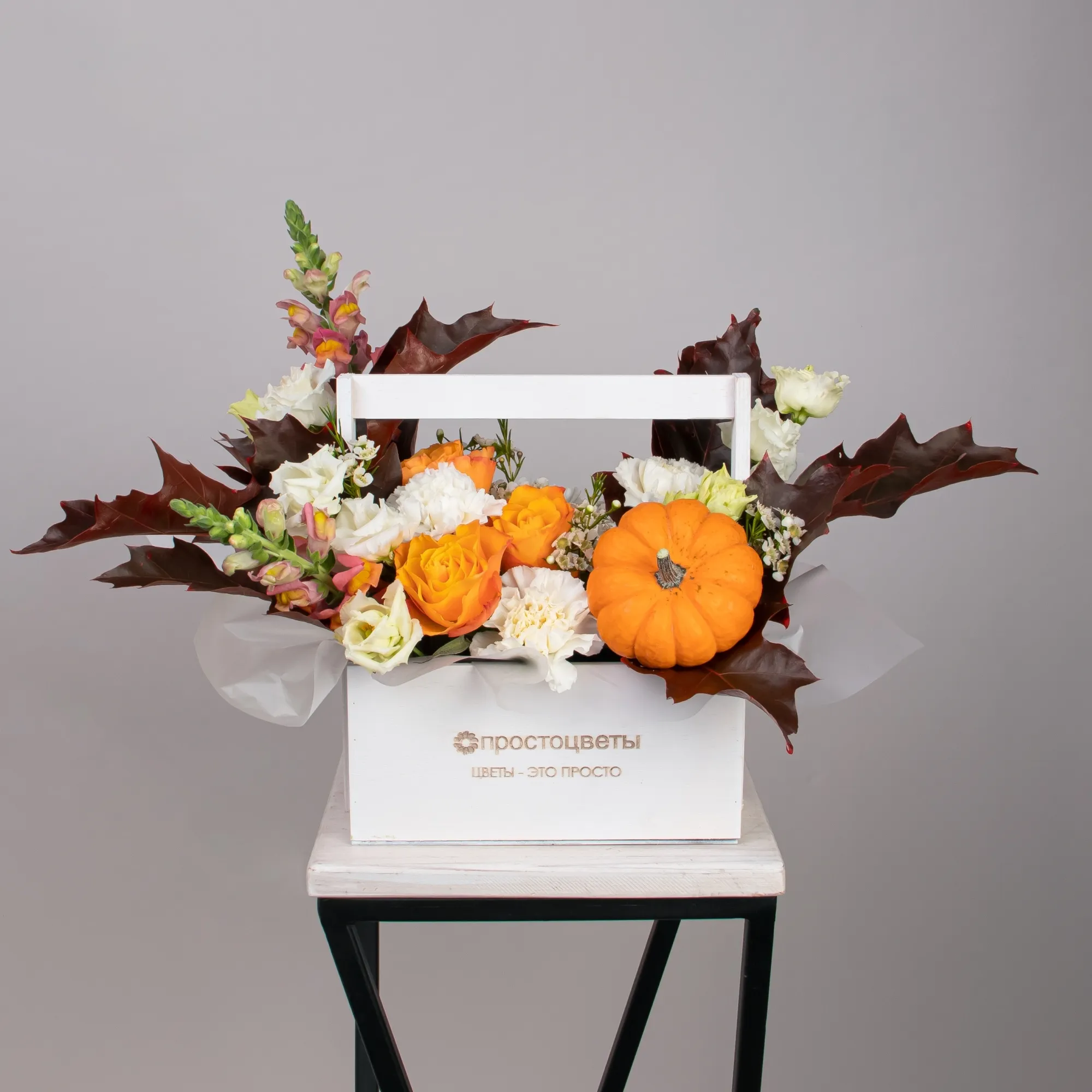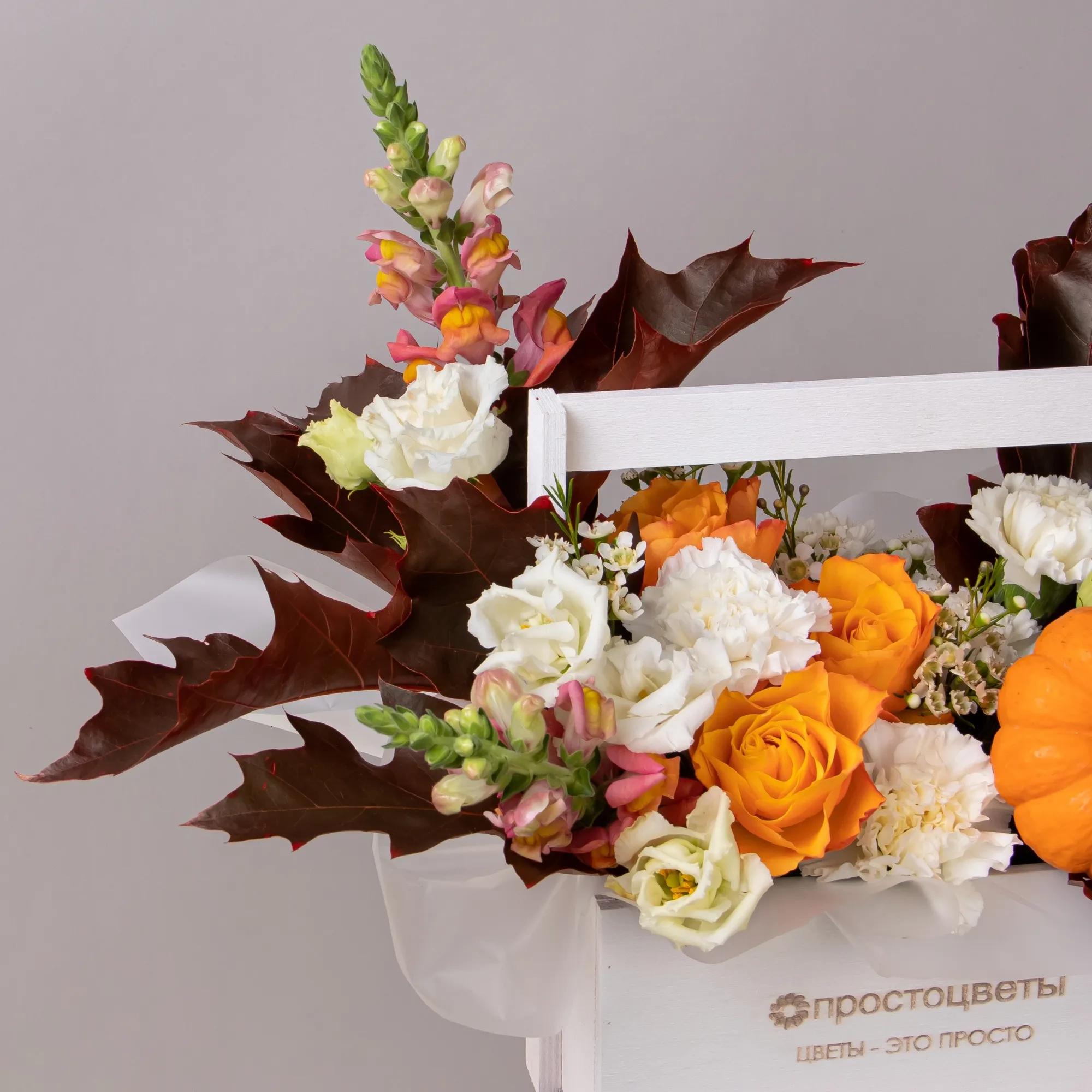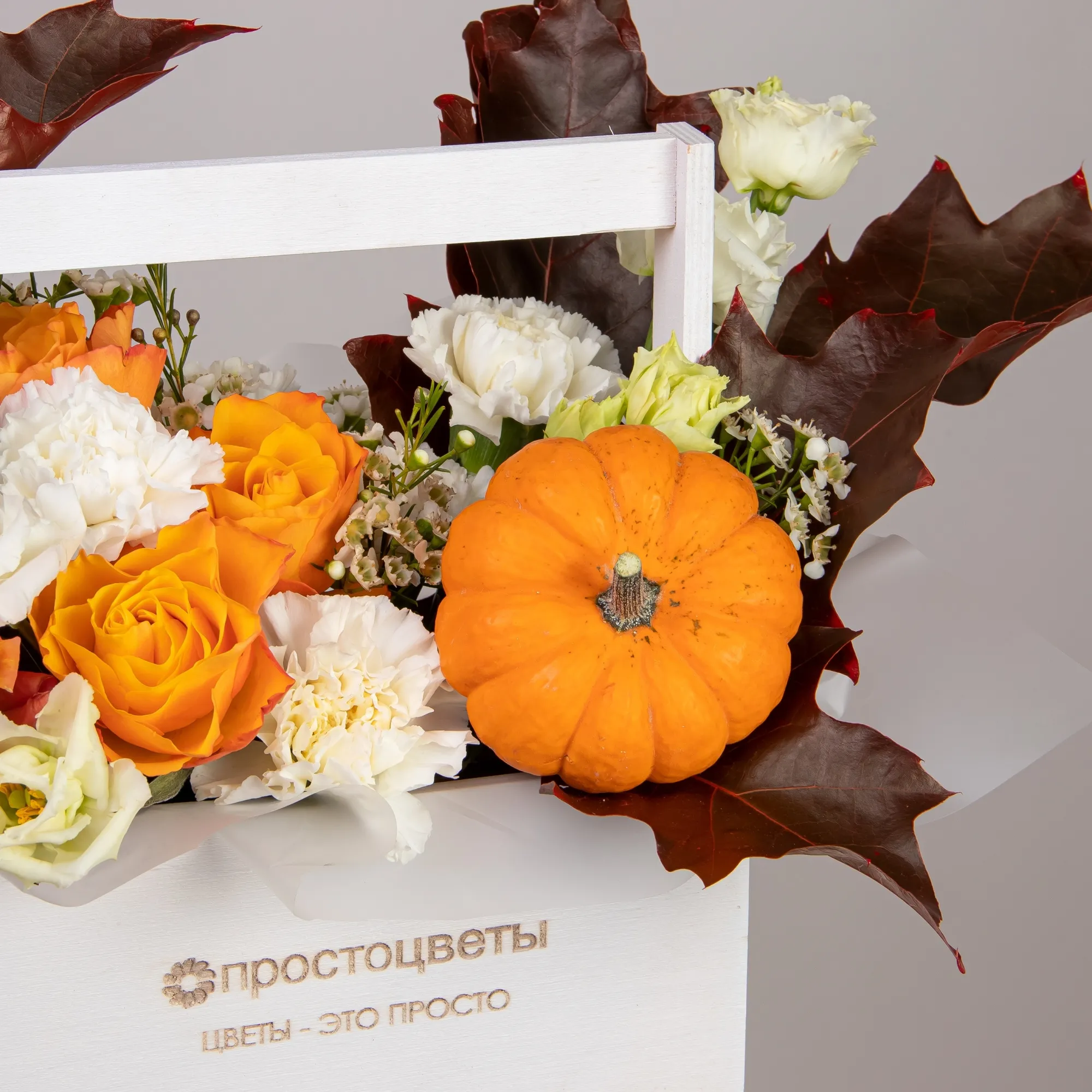 Гвоздика-5, Роза-3, Эустома-1, Леувенбек-2, Тыква-1, Листья дуба-1