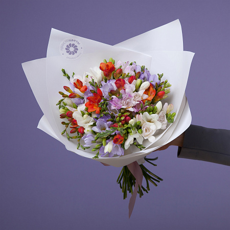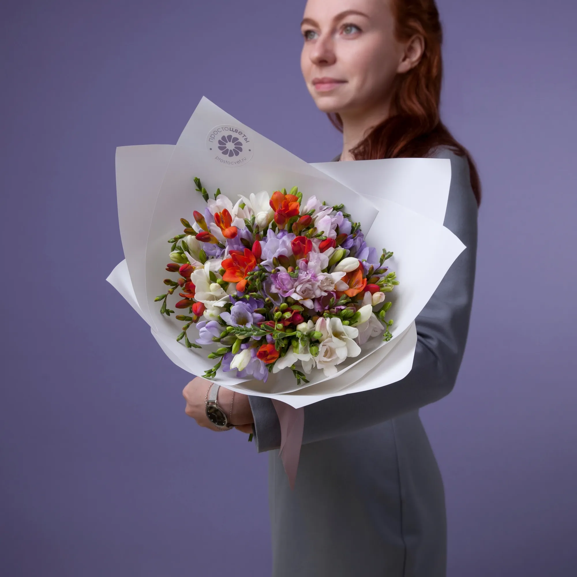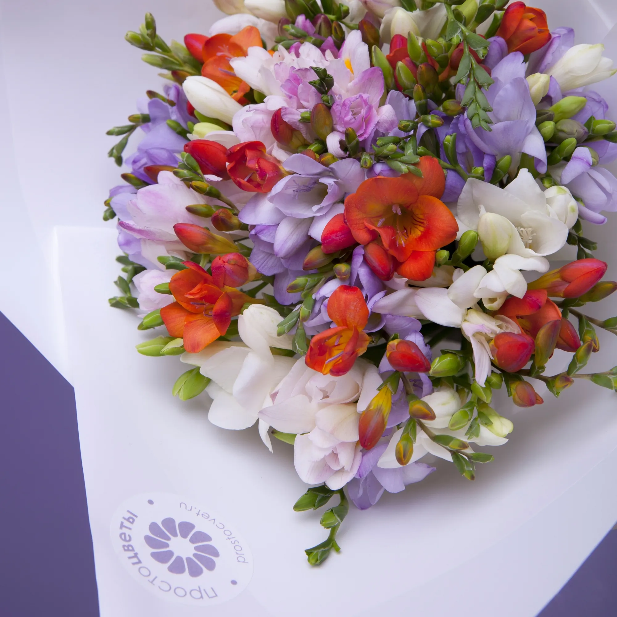 Фрезия – особенный цветок, очень хрупкий и утонченный. Ей нужно чуть больше времени, чтобы всё соцветие распустилось. Не расстраивайтесь, если полученный букет немного отличается от фотографии. Просто поставьте его в вазу и наблюдайте за постепенным раскрытием всех бутонов.