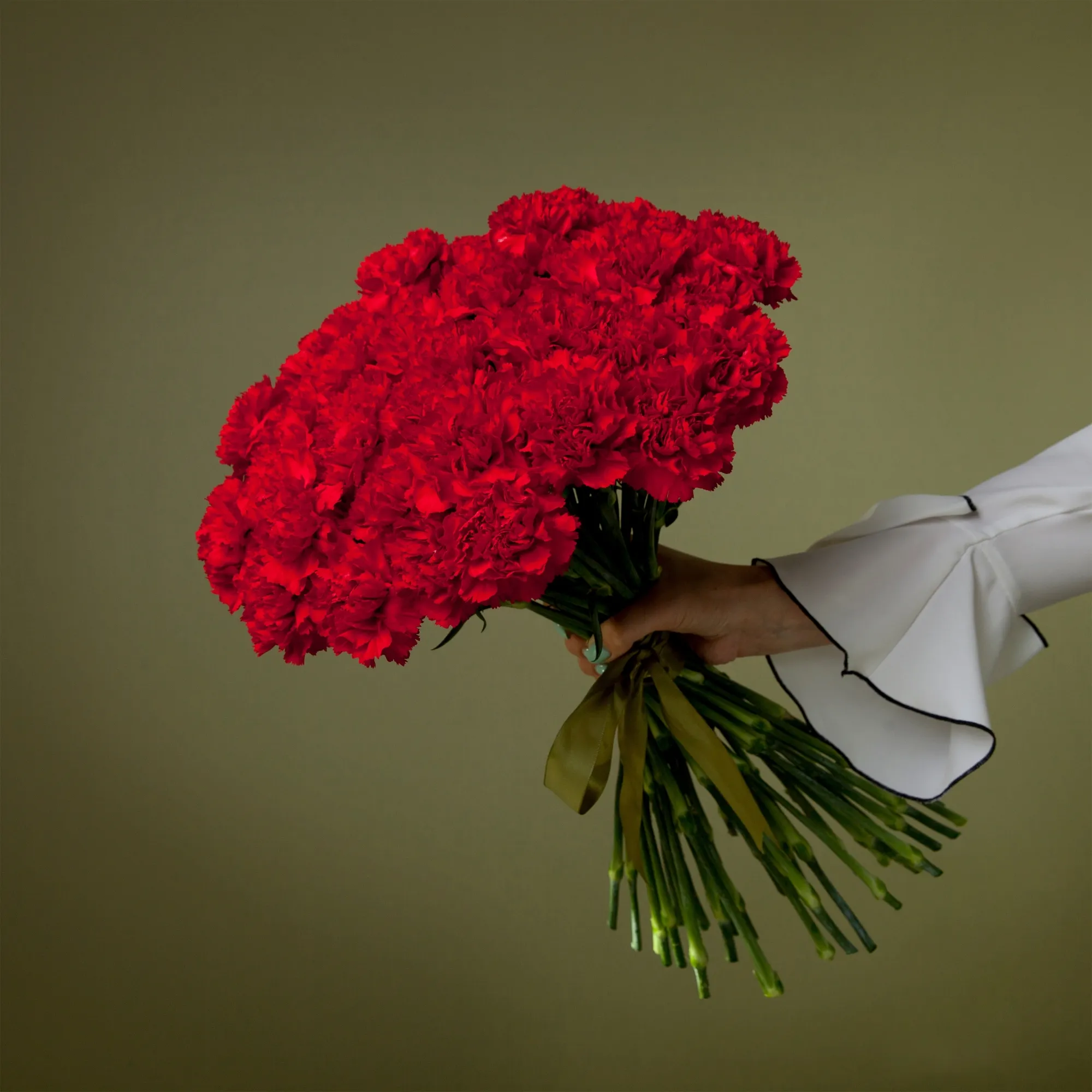 На фотографии представлен букет из 35 стеблей гвоздики.