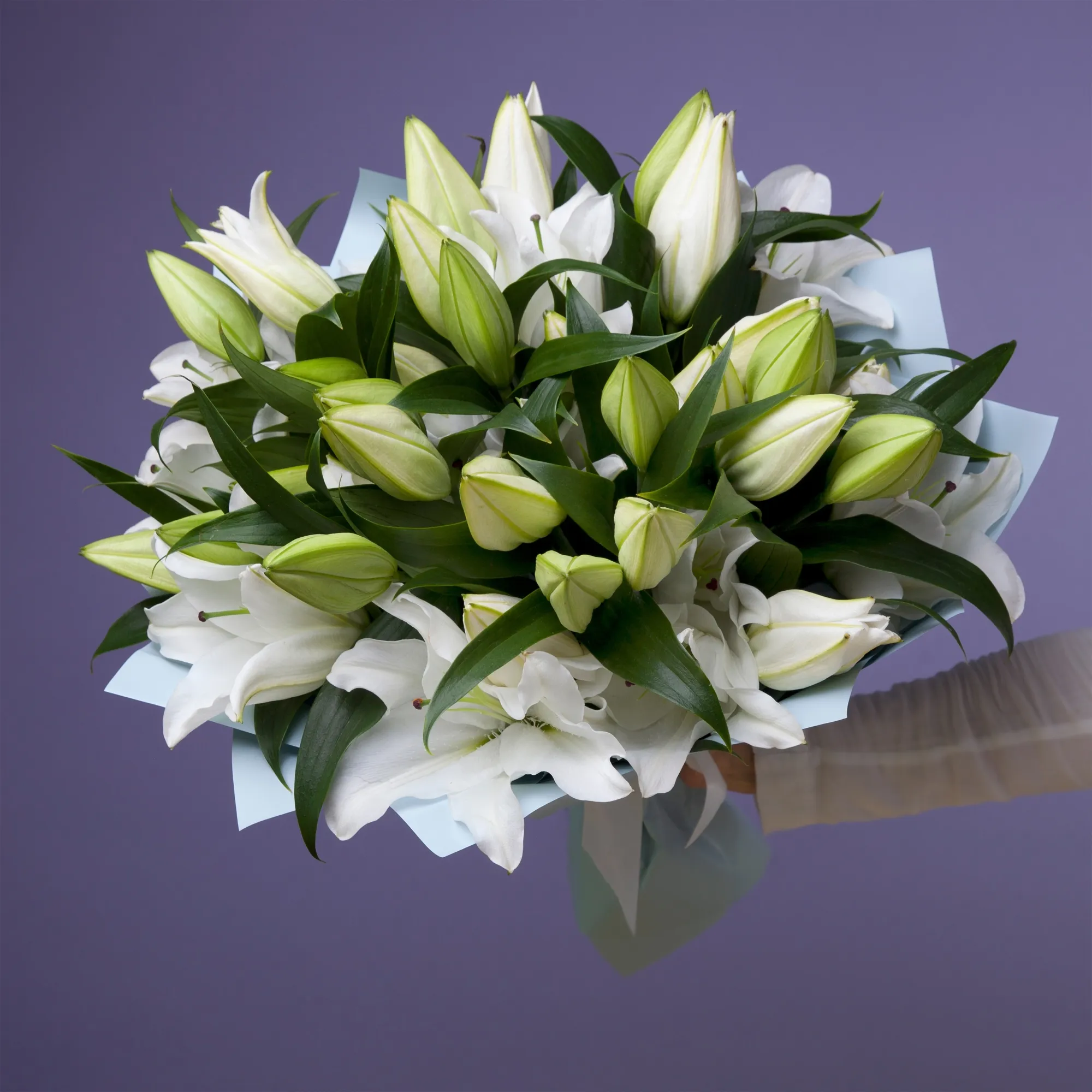 Наши лилии приезжают из Нидерландов в рефрижераторах. В пути цветы спят при температуре + 4 градуса. Те же условия мы поддерживаем в производственных цехах, где начинается вторая жизнь растений. Первым делом флористы очищают стебли от лишних листьев, чтобы предотвратить возможное гниение. Затем, используя различные техники, собирают букеты, оборачивают их в бумагу, фоамиран или фетр, подрезают стебли. В сосуды с водой обязательно добавляют флористическую подкормку кризал, которая смягчает последствия стресса после срезки и обеспечивает цветам питание. Перед отправкой к покупателям букеты хранятся при температуре +6 градусов.