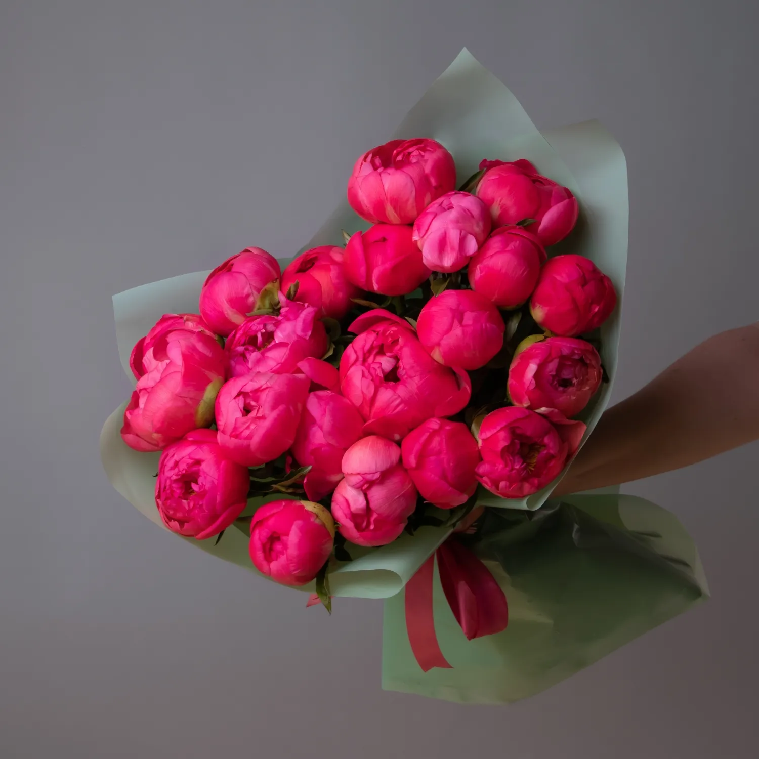 Обратите внимание, что пионы могут приходить вам в еще «закрытом» состоянии. Это значит, что бутоны будут выглядеть менее распустившимися, чем на фото. Не переживайте! Так и должно быть. Это значит, что цветок свежий. Вы сможете наблюдать волшебство раскрытия собственными глазами. Главное – регулярно подрезать стебель и менять воду.