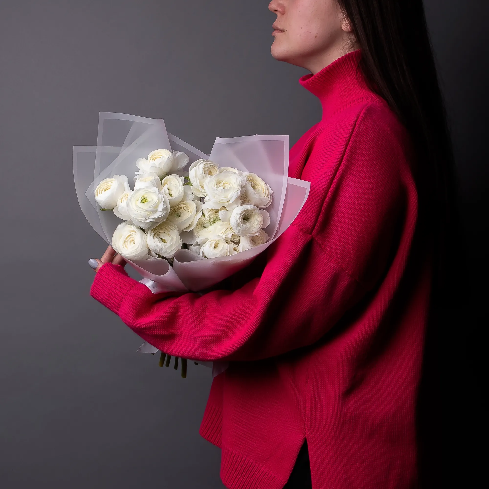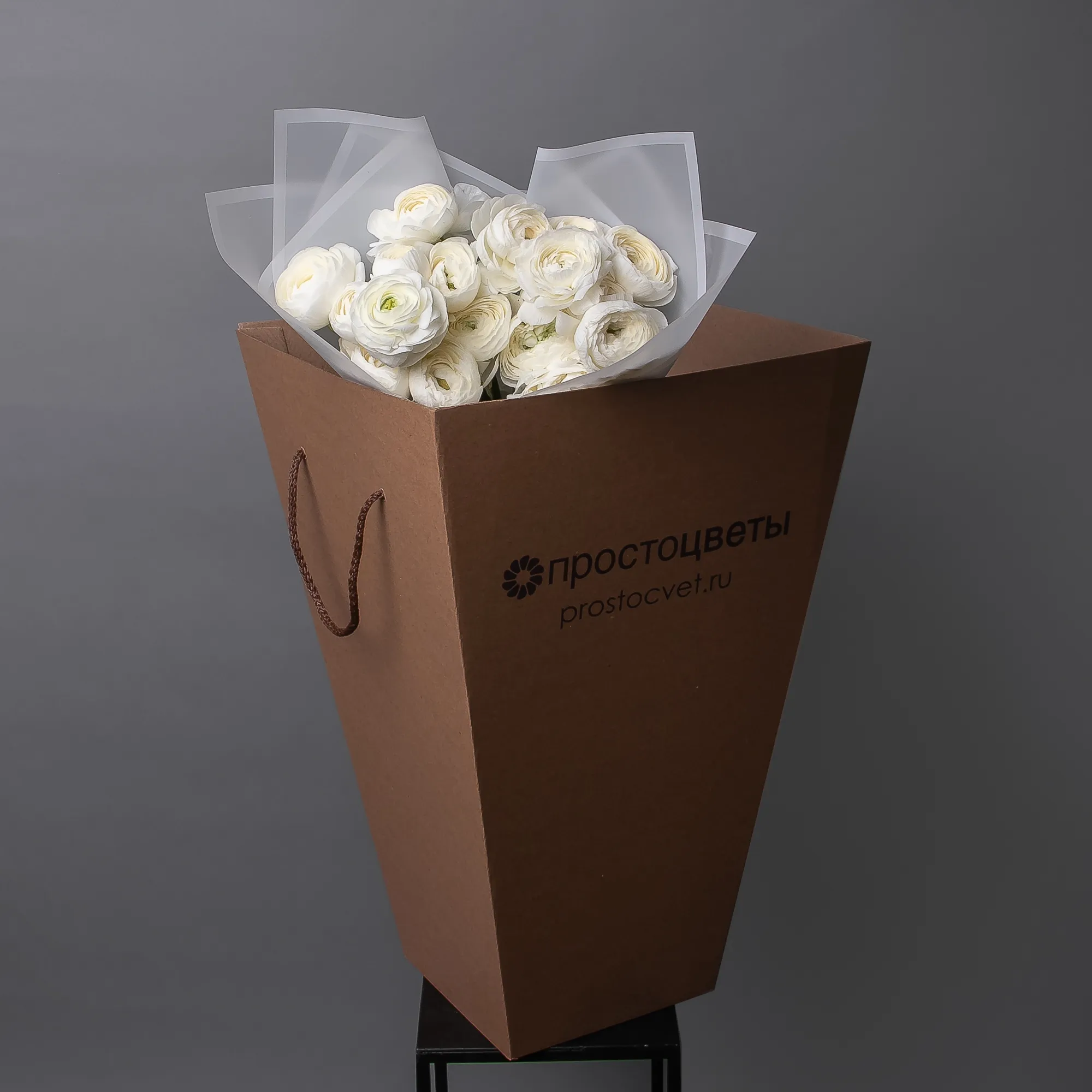 Букет Ранункулус "Элеганс Вайт" из 9 белых ранункулус высотой 40 см красиво упакуем